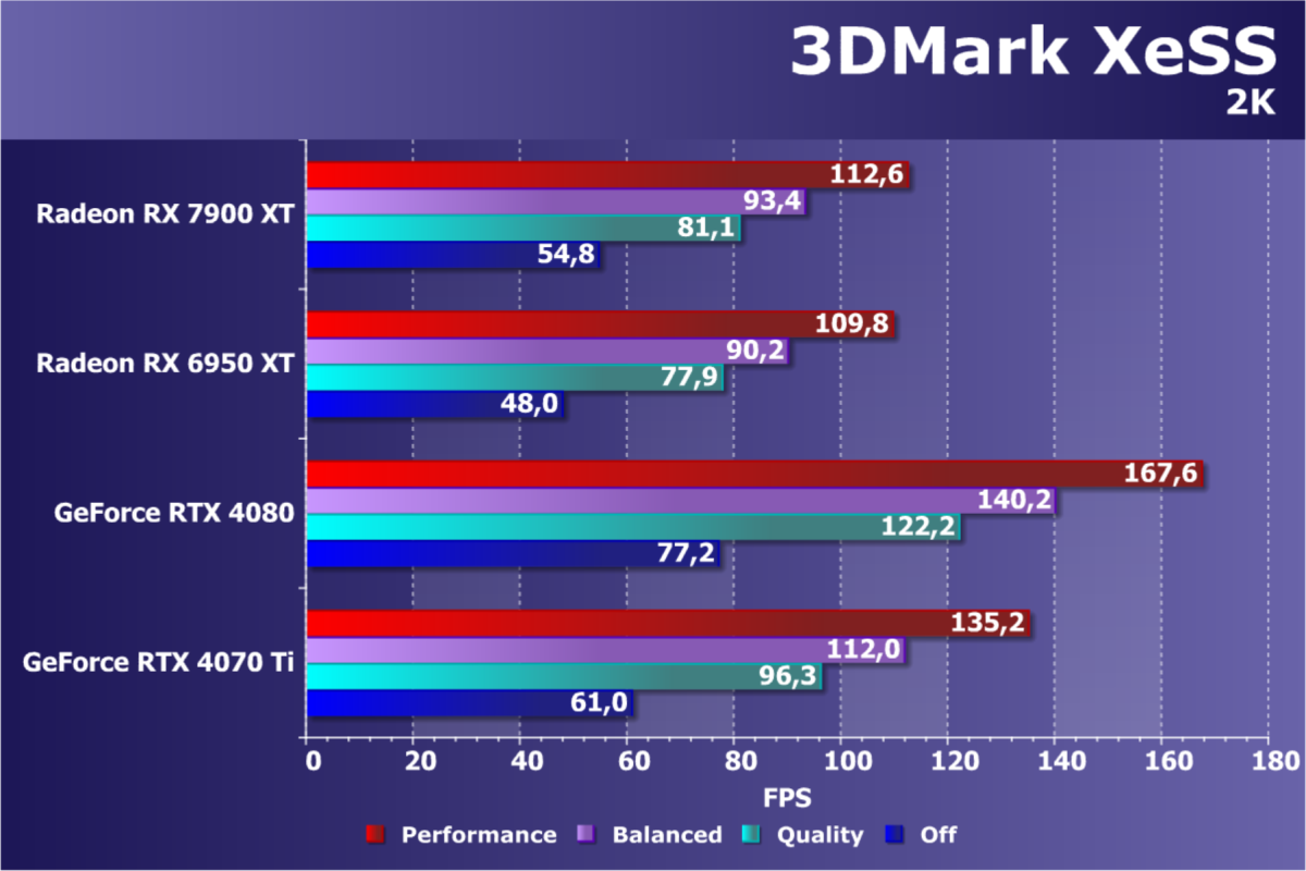 Из более-менее новых бенчмарков мы начали использовать несколько дополнительных тестов для измерения производительности трассировки лучей и, а также технологий масштабирования разрешения и увеличения производительности: DLSS и XeSS. В качестве полусинтетических тестов у нас также используется набор подтестов из довольно популярного пакета 3DMark: Time Spy, Port Royal, DX Raytracing, Speed Way и др. А вот примеры приложений DirectX 11 и 12, входящие в различные SDK, пришлось убрать — последнее время они всё чаще давали некорректные результаты.