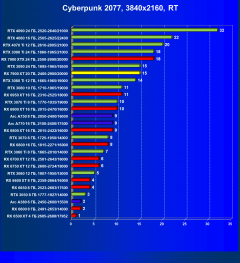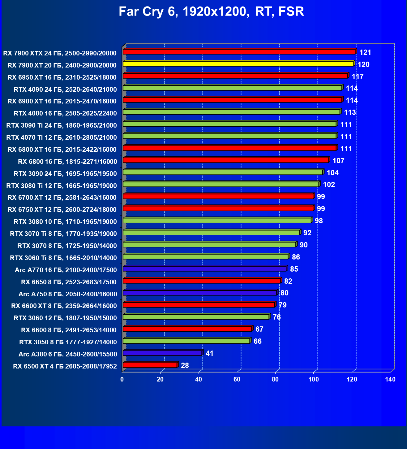 | 23 | RX 6950 XT 16 ГБ, 2310—2525/18000 | 77 | 644 | 83 100 |