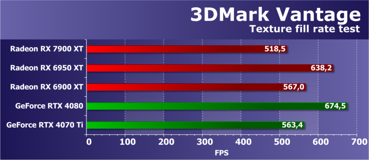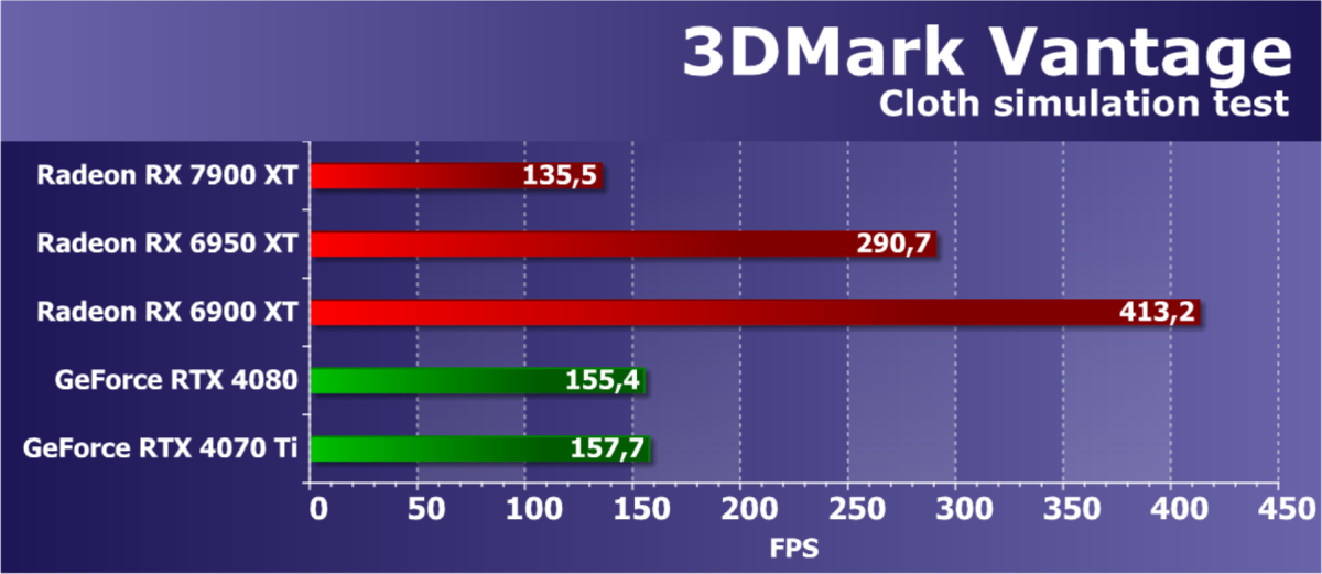 По объему видеопамяти для рассматриваемой сегодня видеокарты AMD в соответствии с шириной шины особого выбора не было: можно было поставить или 10, или 20 ГБ. Понятно, что объема в 10 ГБ не хватает уже сейчас, и для RX 7900 XT можно считать второй вариант не просто приемлемым и достаточным на данный момент, но и перспективным. Пока что наличие 20 ГБ видеопамяти против 12 ГБ у RTX 4070 Ti не принесет преимущества RX 7900 XT, но эту разницу можно считать потенциальным недостатком решения Nvidia, что может негативно сказаться в ближайшие годы.
