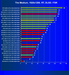 Рейтинг составлен по 9 тестам, в которых используется технология трассировки лучей и одновременно технология Nvidia DLSS, AMD FSR или Intel XeSS. Этот рейтинг нормирован по самому слабому ускорителю в данной группе — Radeon RX 6500 XT (то есть сочетание скорости и функций Radeon RX 6500 XT приняты за 100%).