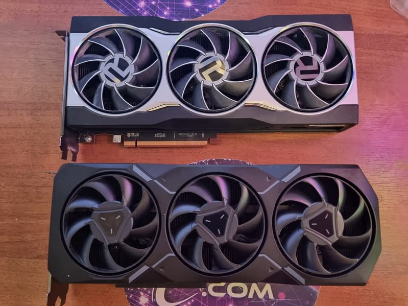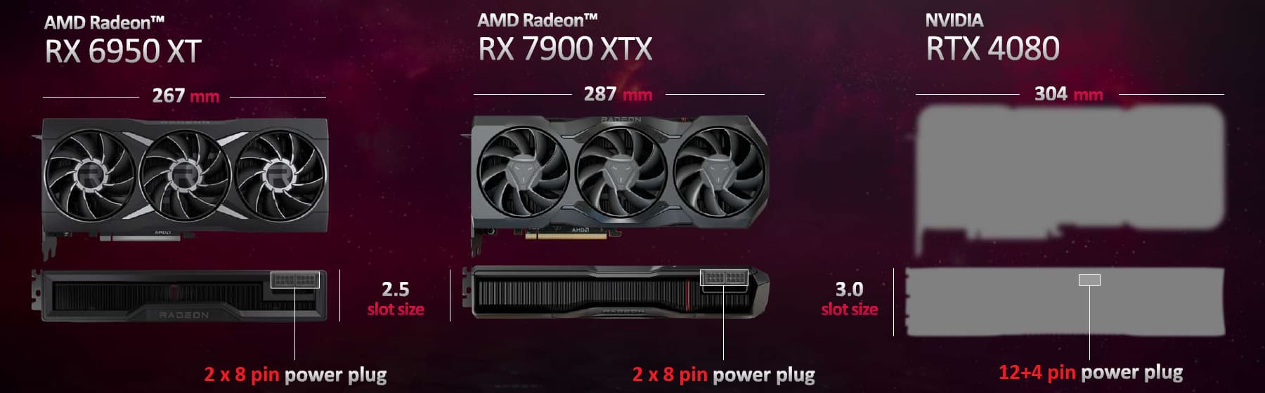 Для дополнительного питания AMD использует два привычных 8-контактных разъема, что в теории дает до 375 Вт при долговременной нагрузке. Nvidia применяет спорный новый 16-контактный разъем 12VHPWR, который, впрочем, дает возможность подать до 600 Вт питания. То есть, с одной стороны, видеокарты AMD куда проще установить в любую систему, не имеющую новых (и довольно редких пока) блоков питания, зато два 8-контактных разъема ограничивают максимальную мощность, подаваемую на видеокарту. Неудивительно, что некоторые розничные варианты видеокарт серии RX 7900 имеют по три 8-контактных разъема — особенно предназначенные для любителей разгона.