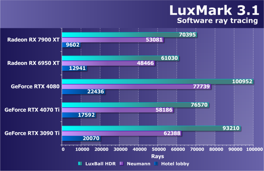| 06 | RX 7900 XT 20 ГБ, 2400—2900/20000 | 751 | 83 | 90 000 |