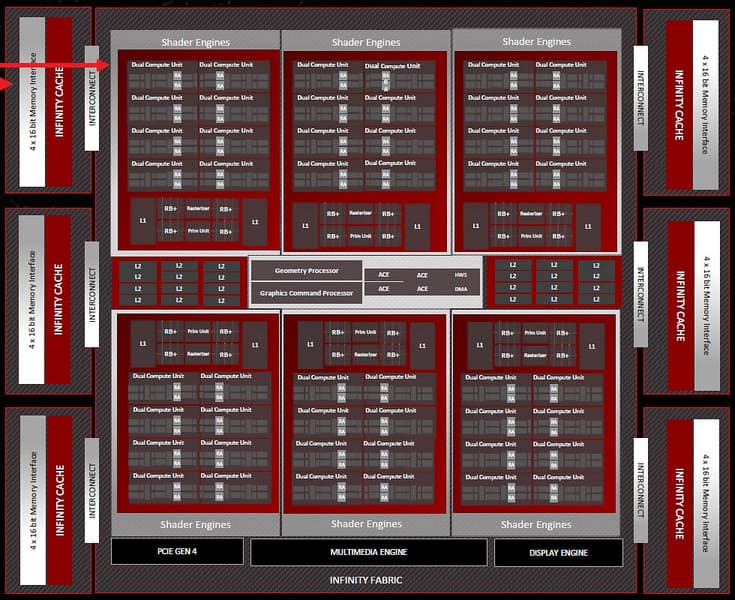 Основной чиплет содержит почти всё: вычислительные блоки CU и все основные функциональные блоки, кроме контроллеров памяти и кэш-памяти третьего уровня. Чиплеты с контроллерами памяти и L3-кэшем — Memory Cache Die (MCD) — содержат довольно большие блоки кэш-памяти Infinity Cache и физический интерфейс памяти GDDR6, плюс линки Infinity Link для подключения к основному чиплету GCD.