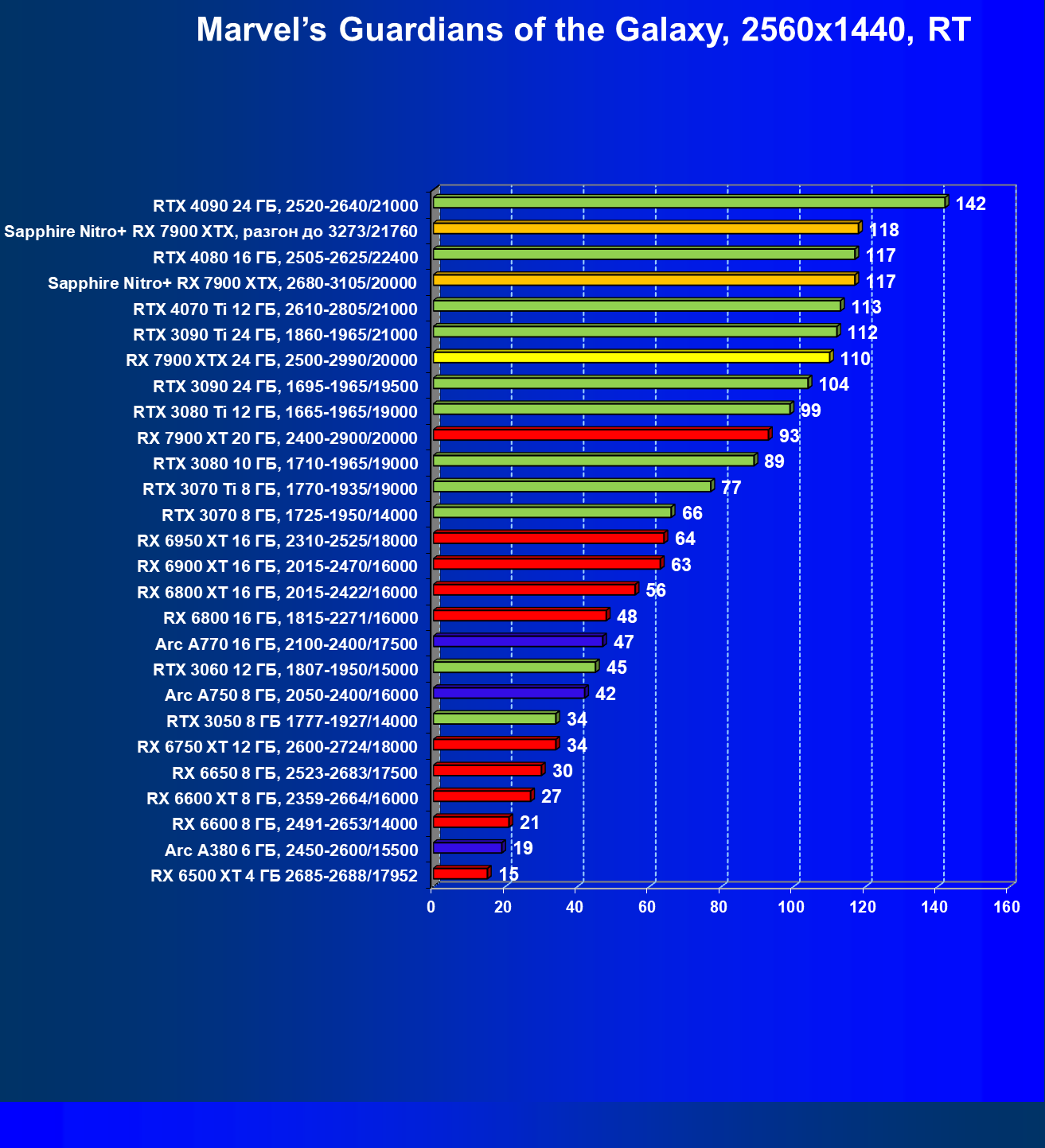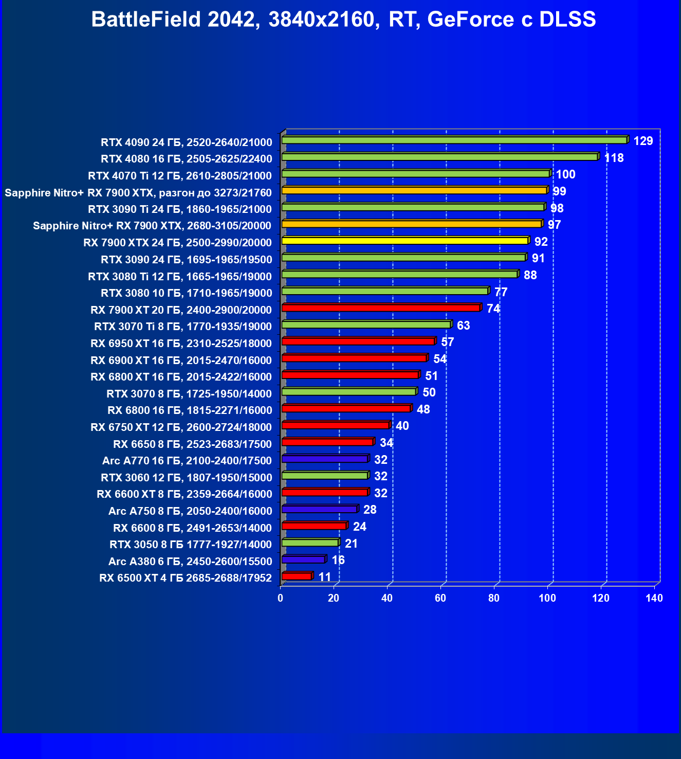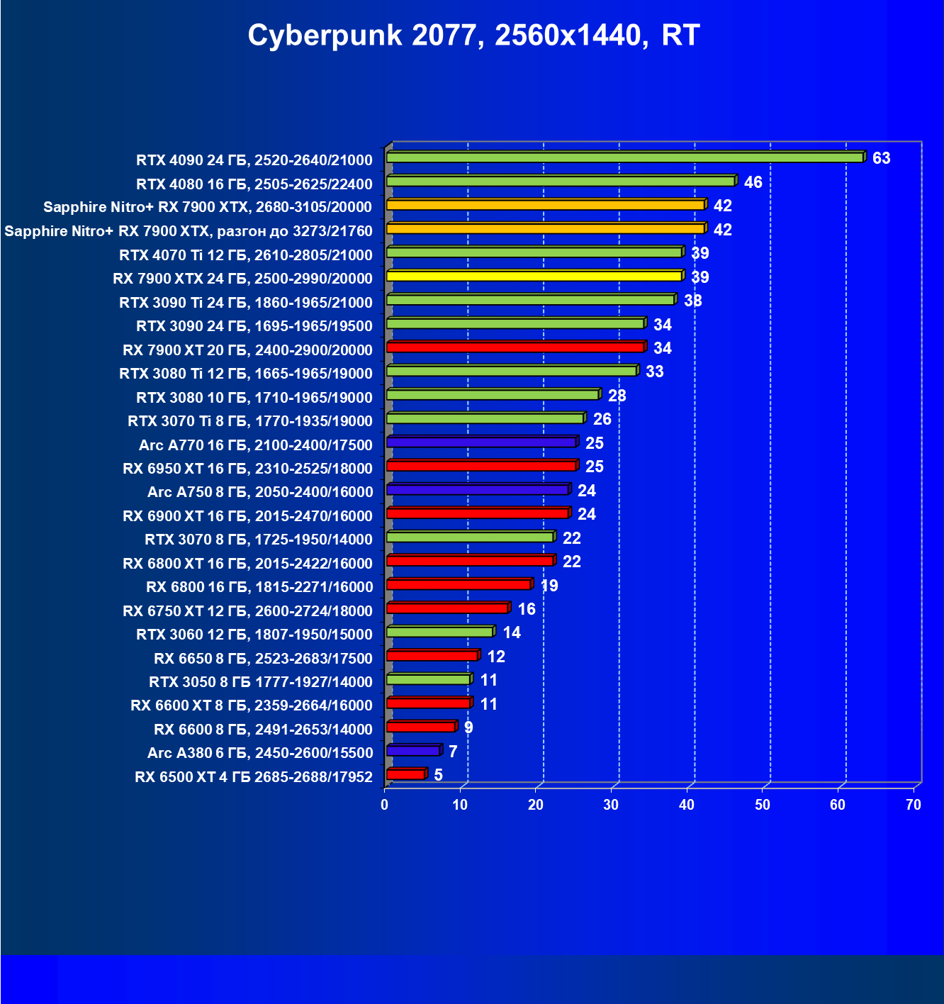 | 02 | Sapphire Nitro+ RX 7900 XTX, разгон до 3273/21760 | 570 | 52 | 110 000 |