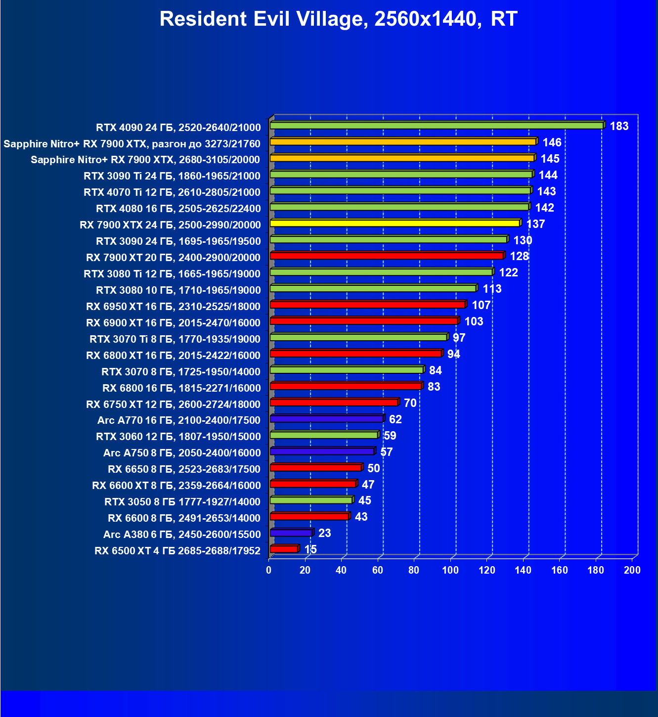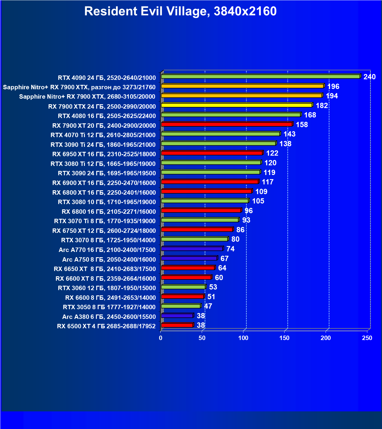 В целом по всем тестам и разрешениям Radeon RX 7900 XTX опережает конкурента в лице GeForce RTX 4080 на 4% (в разрешении 4K — на 7,7%), однако флагман AMD чуть дороже. Карта Sapphire быстрее референс-аналога на 5%, то есть опережает GeForce RTX 4080 еще более существенно. Radeon RX 7900 XTX в среднем на 9% быстрее, чем Radeon RX 7900 XT (в разрешении 4K — на 14,5%).