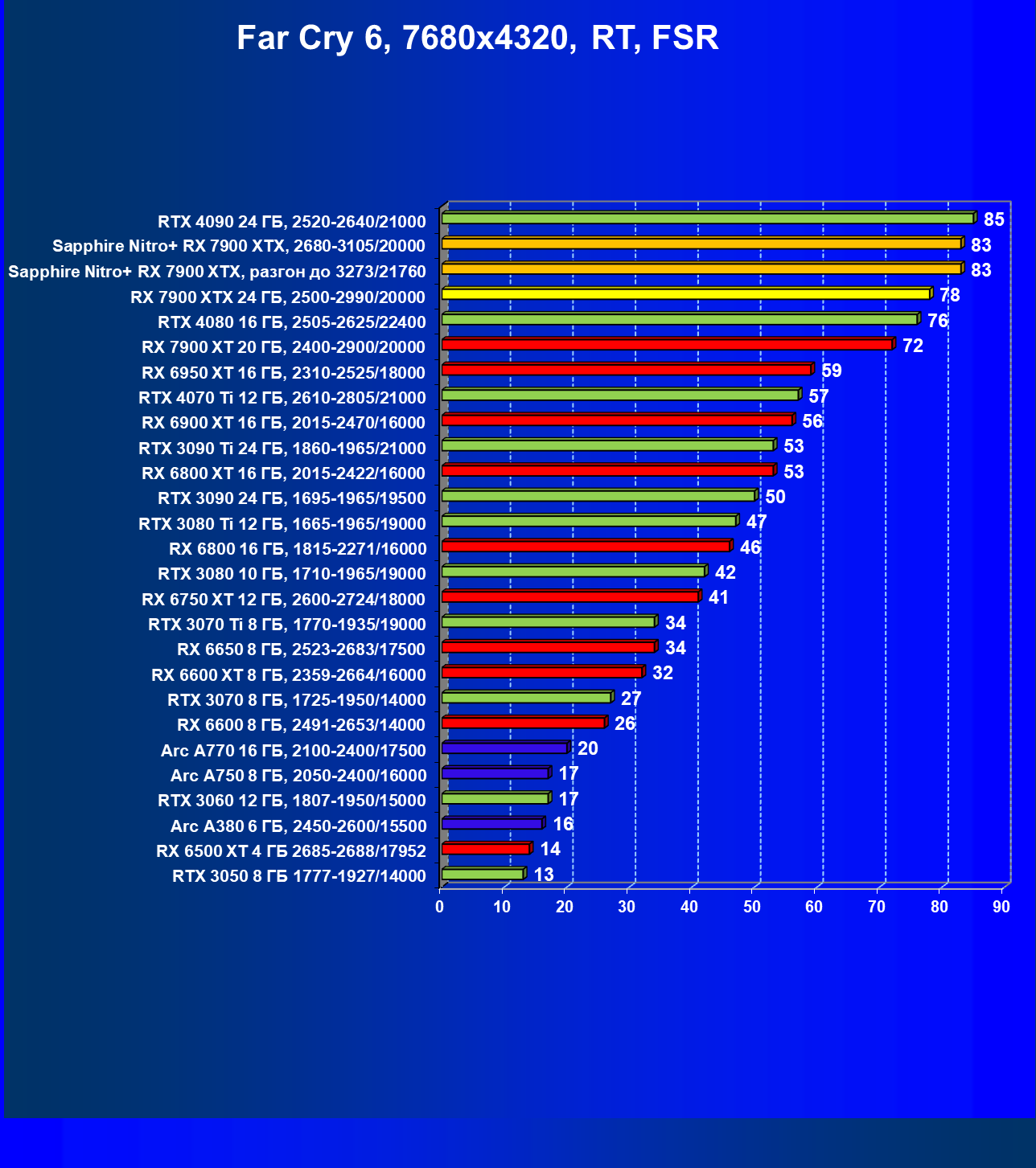 | 19 | RX 7900 XTX 24 ГБ, 2500—2990/20000 | 83 | 882 | 106 000 |