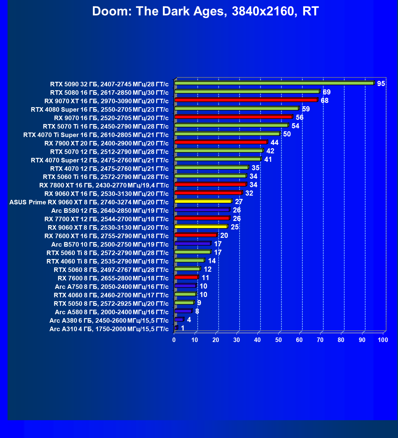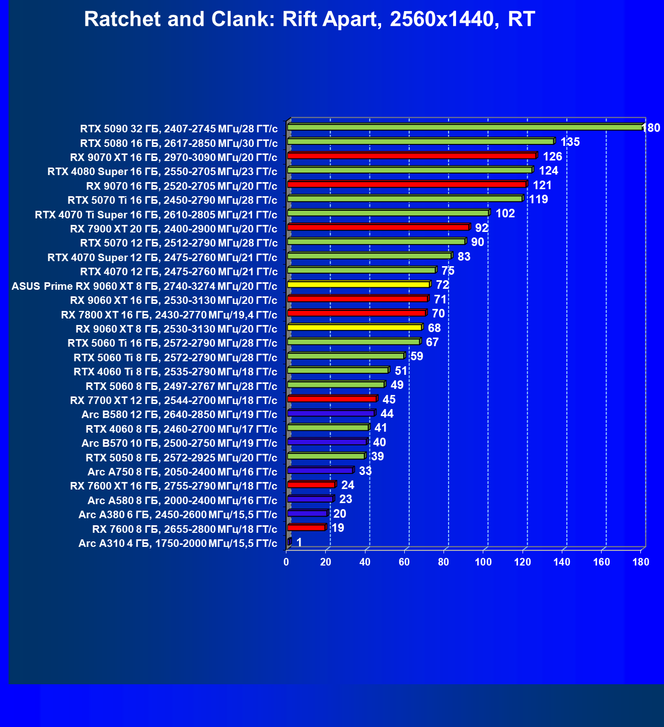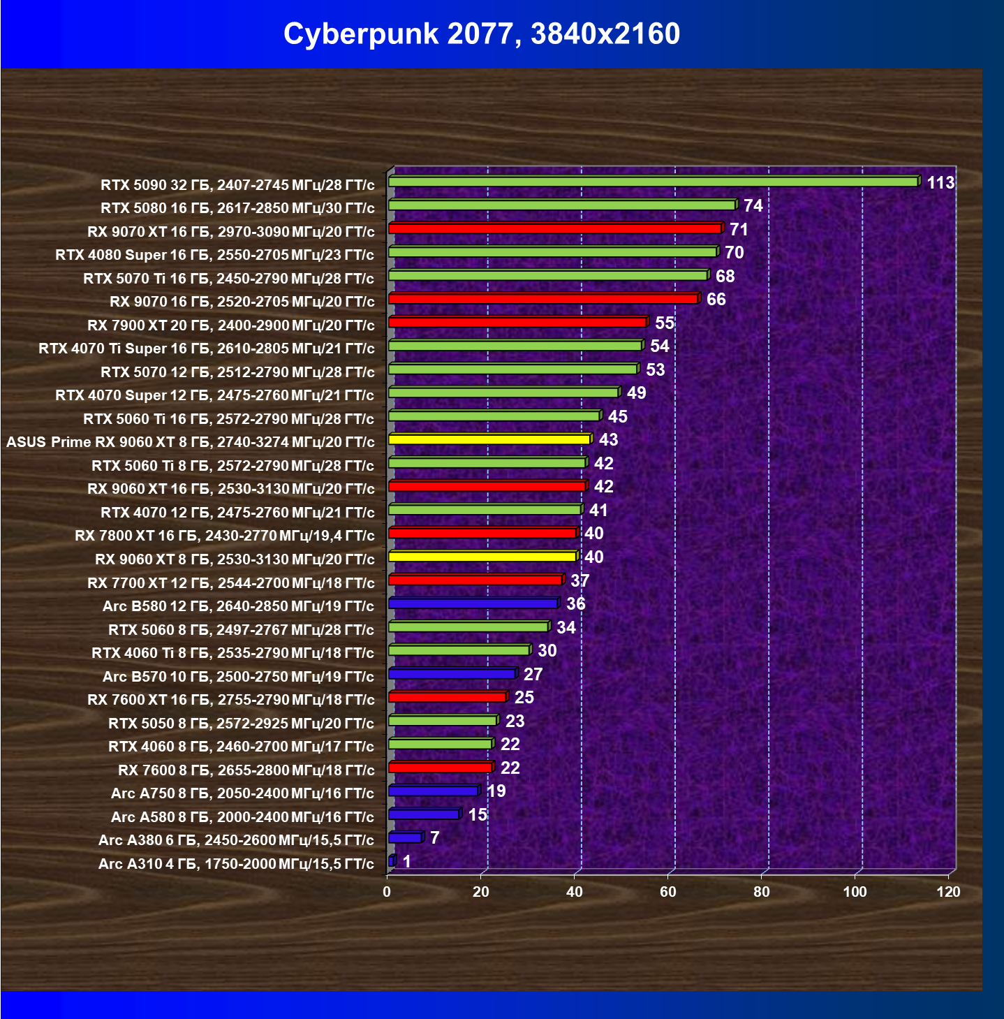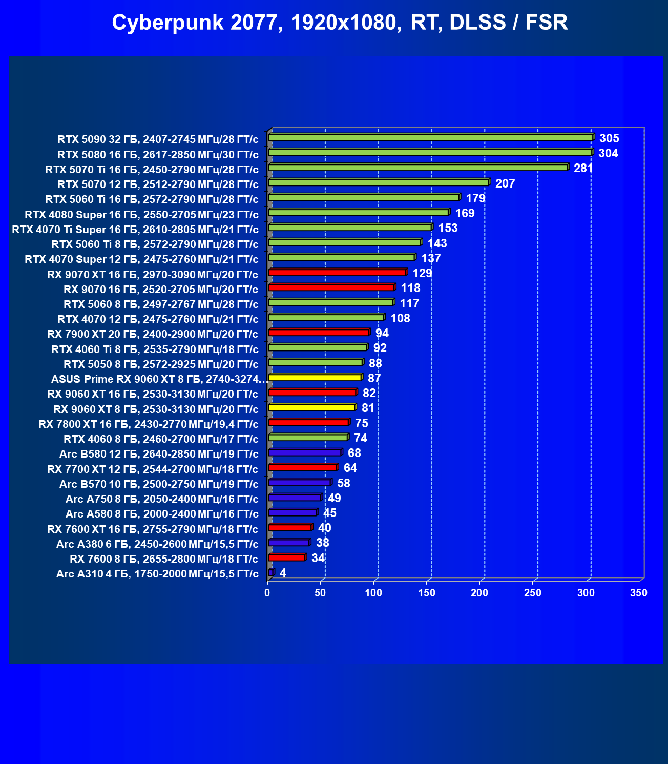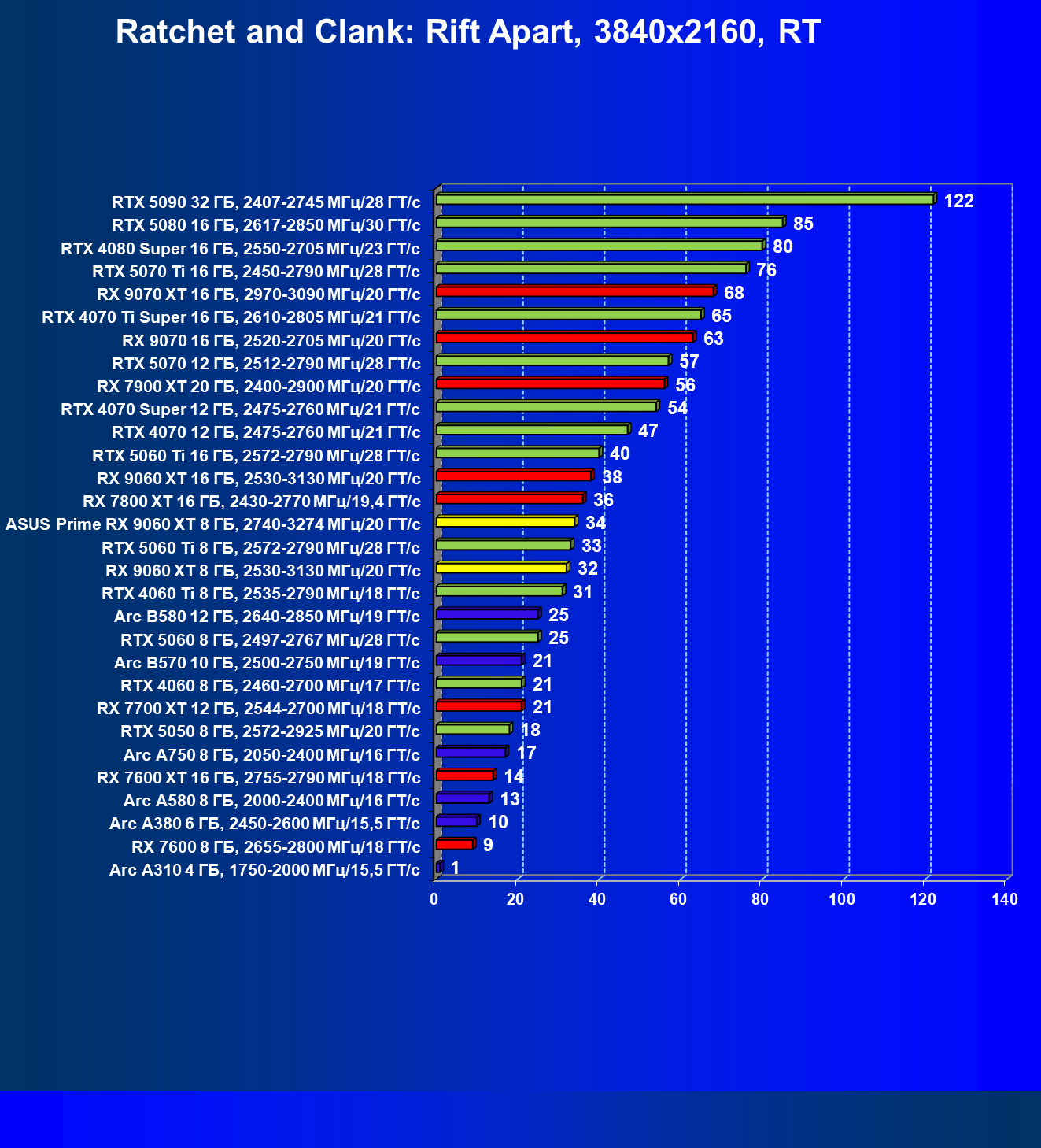 Для составления рейтинга полезности мы взяли цену в 34 тысячи рублей: по такой минимальной стоимости на момент подготовки обзора можно было найти Radeon RX 9060 XT (8 ГБ) на маркетплейсах, карта Asus была чуть дороже. Наши исследования показали, что даже такой уровень цен для Radeon RX 9060 XT всё же чуть высоковат, если ориентироваться на игры с RT и технологиями динамического масштабирования.