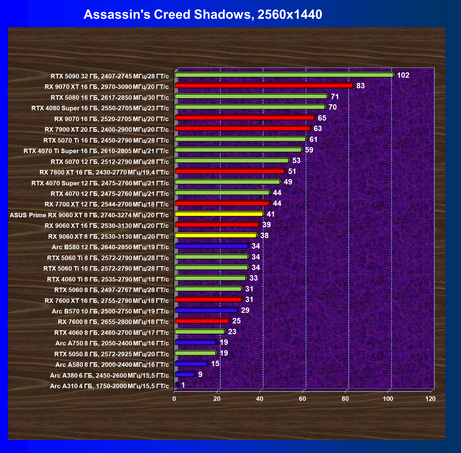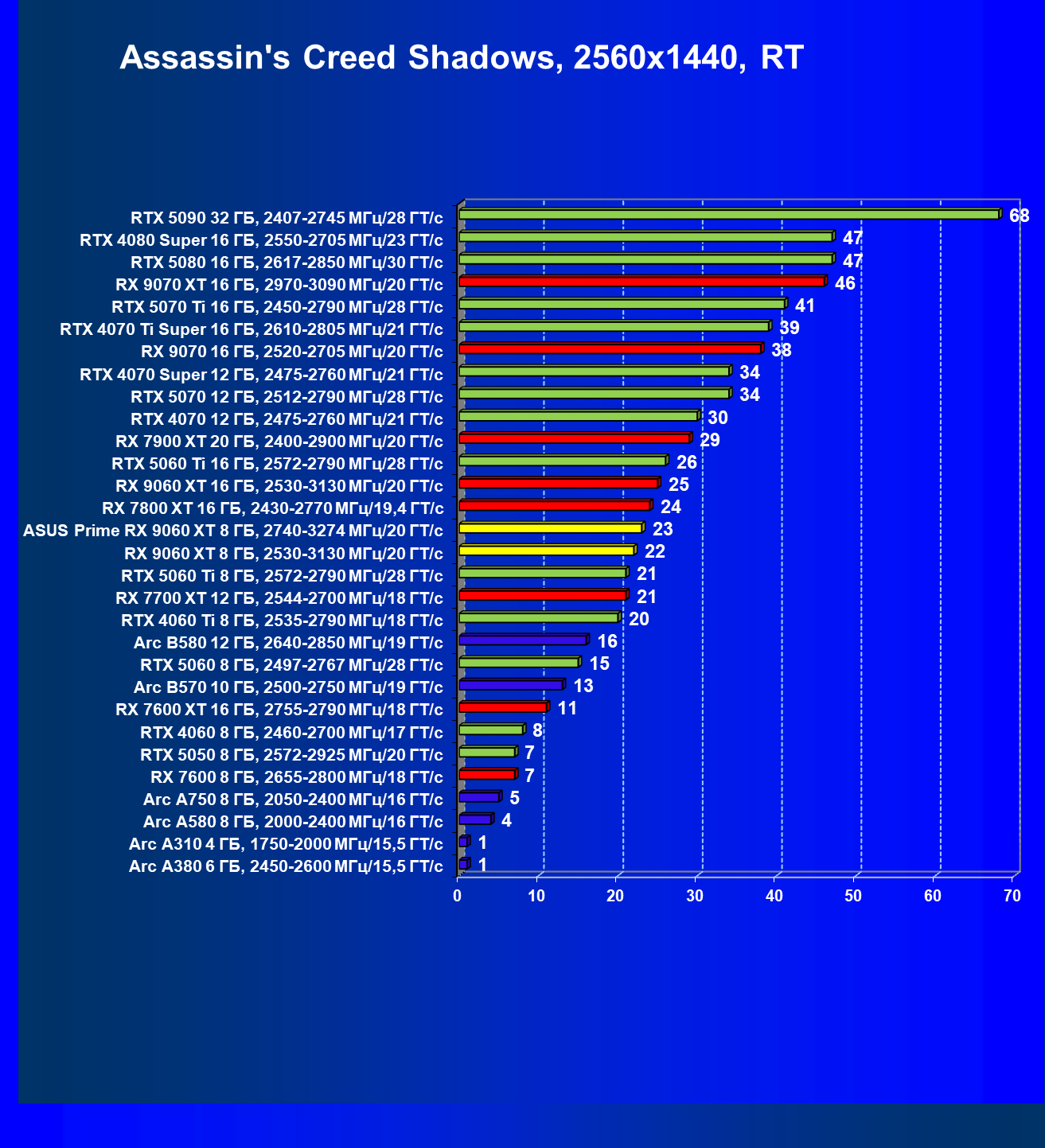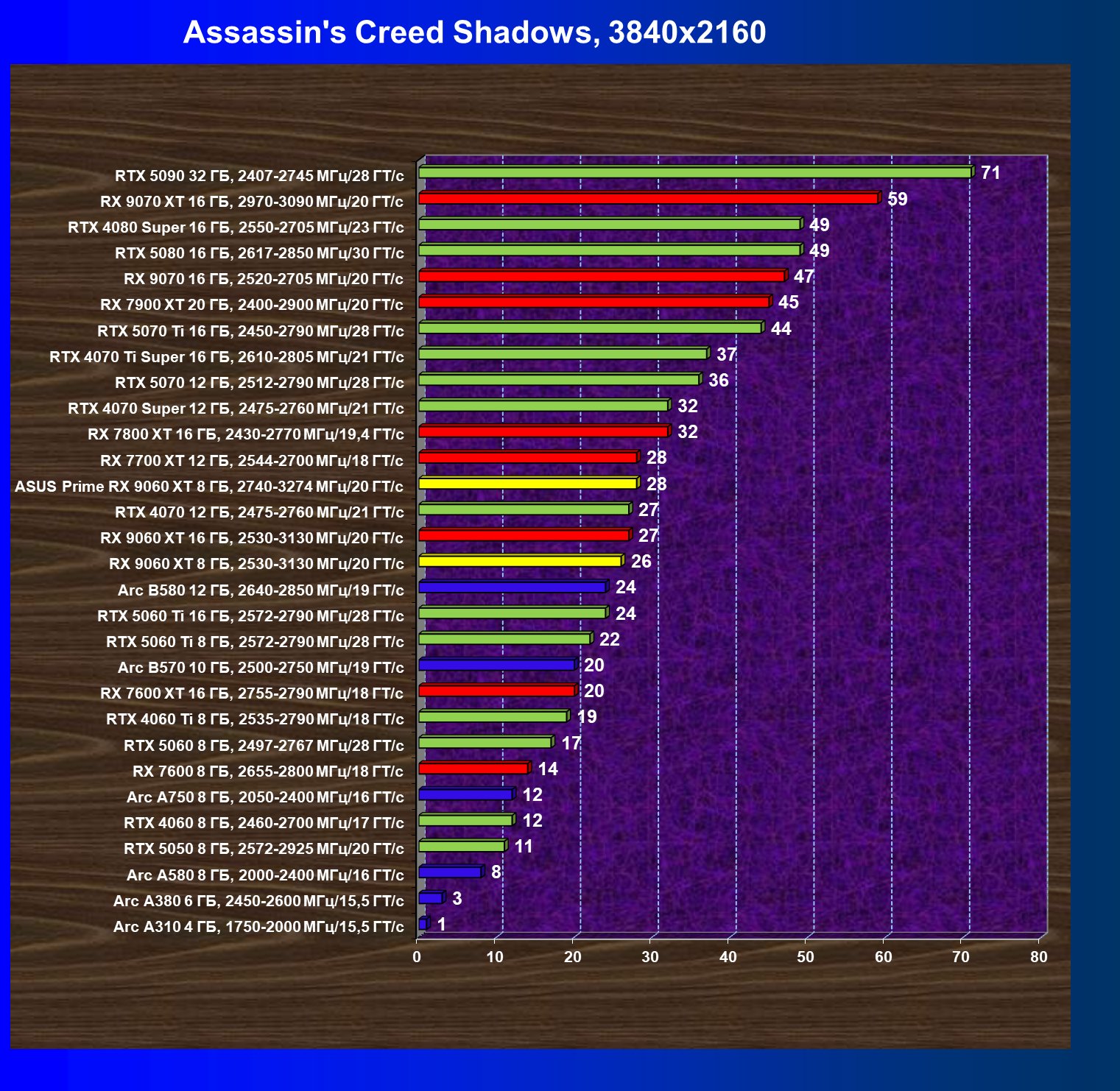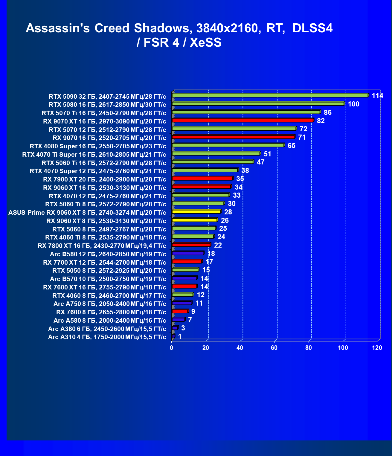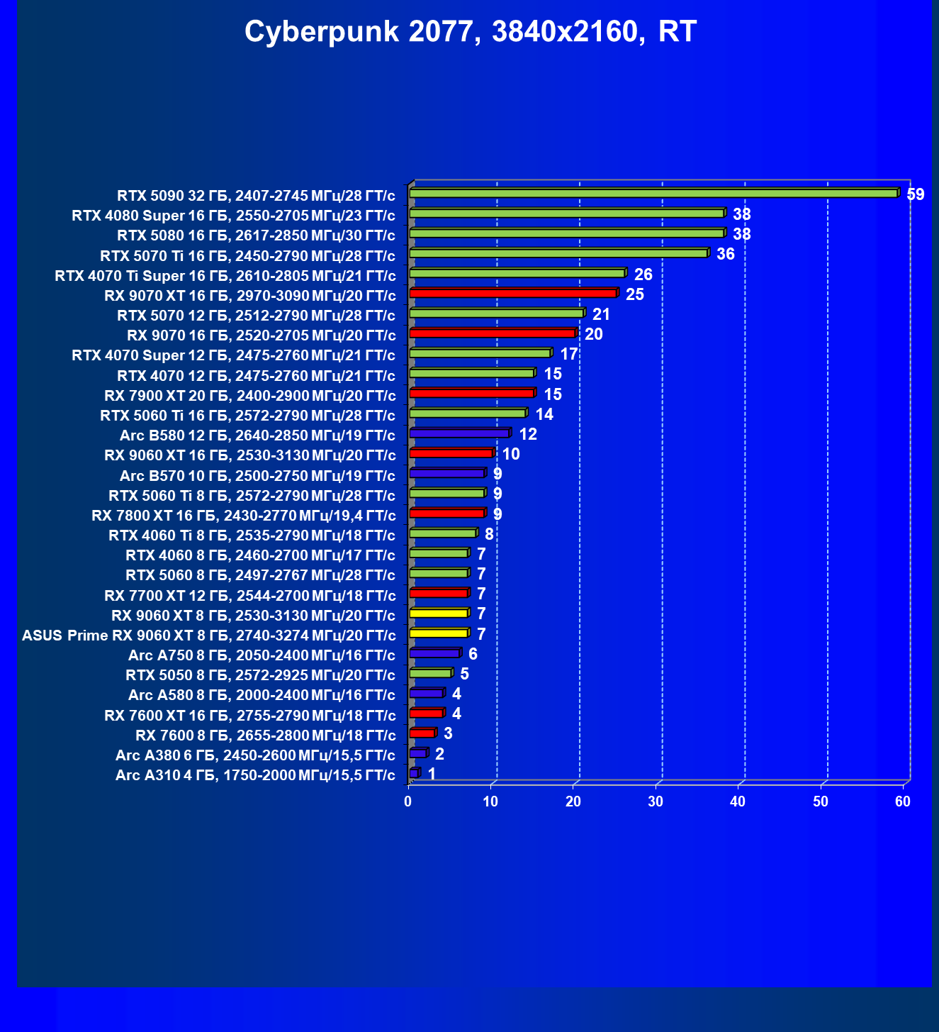 Для составления рейтинга полезности мы взяли цену в 34 тысячи рублей: по такой минимальной стоимости на момент подготовки обзора можно было найти Radeon RX 9060 XT (8 ГБ) на маркетплейсах, карта Asus была чуть дороже. Наши исследования показали, что даже такой уровень цен для Radeon RX 9060 XT всё же чуть высоковат, если ориентироваться на игры с RT и технологиями динамического масштабирования.