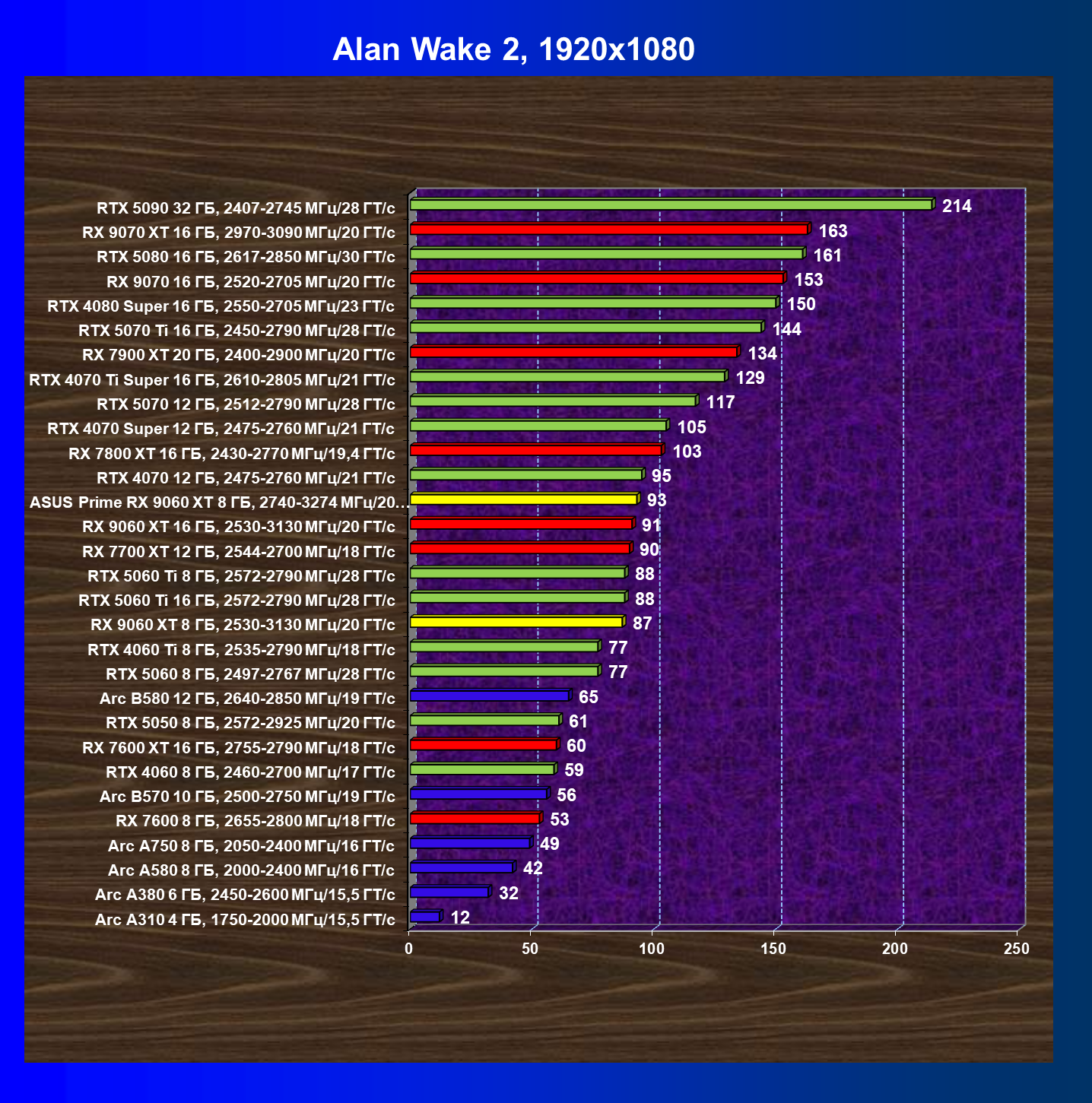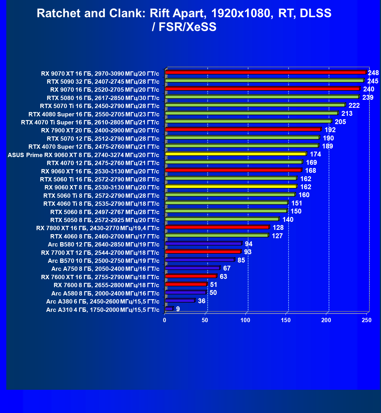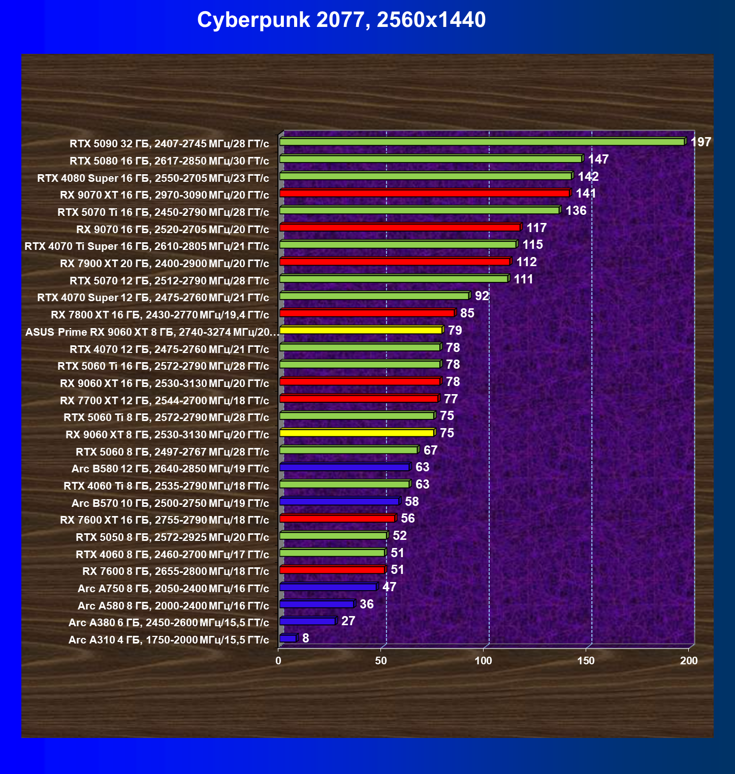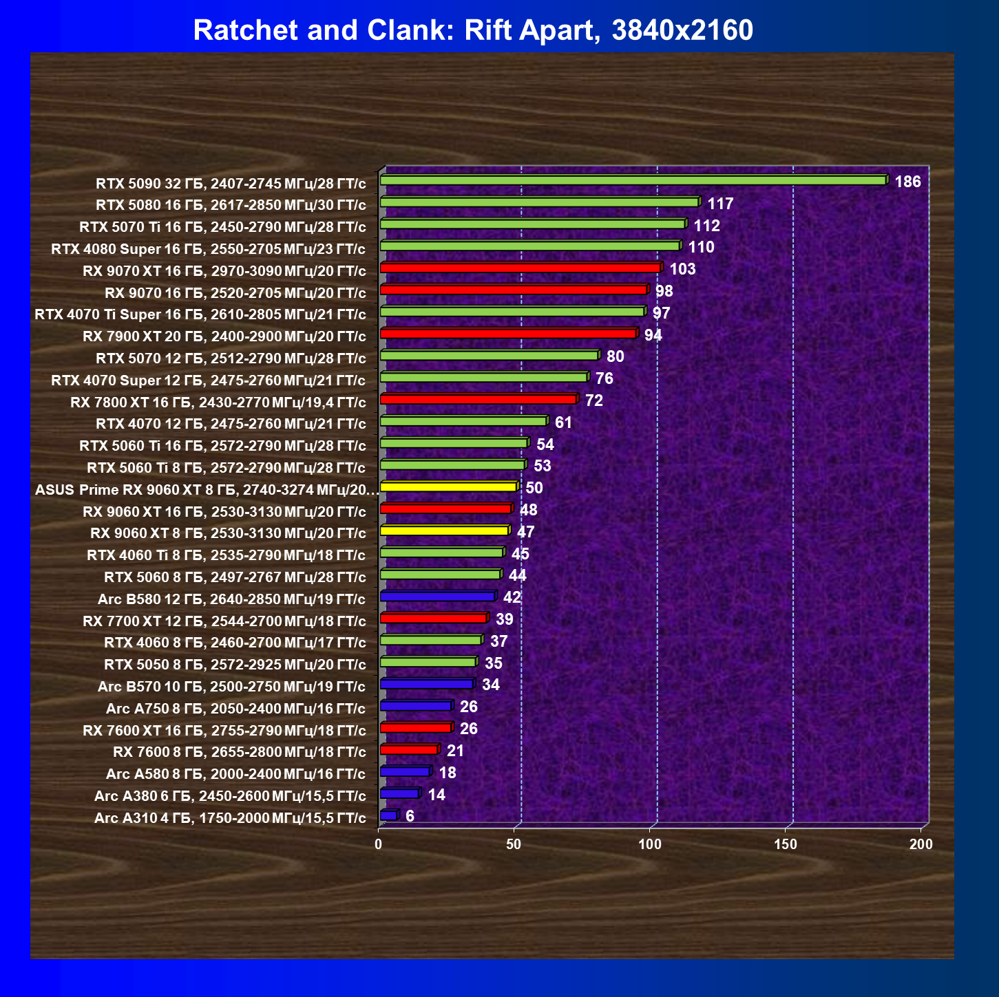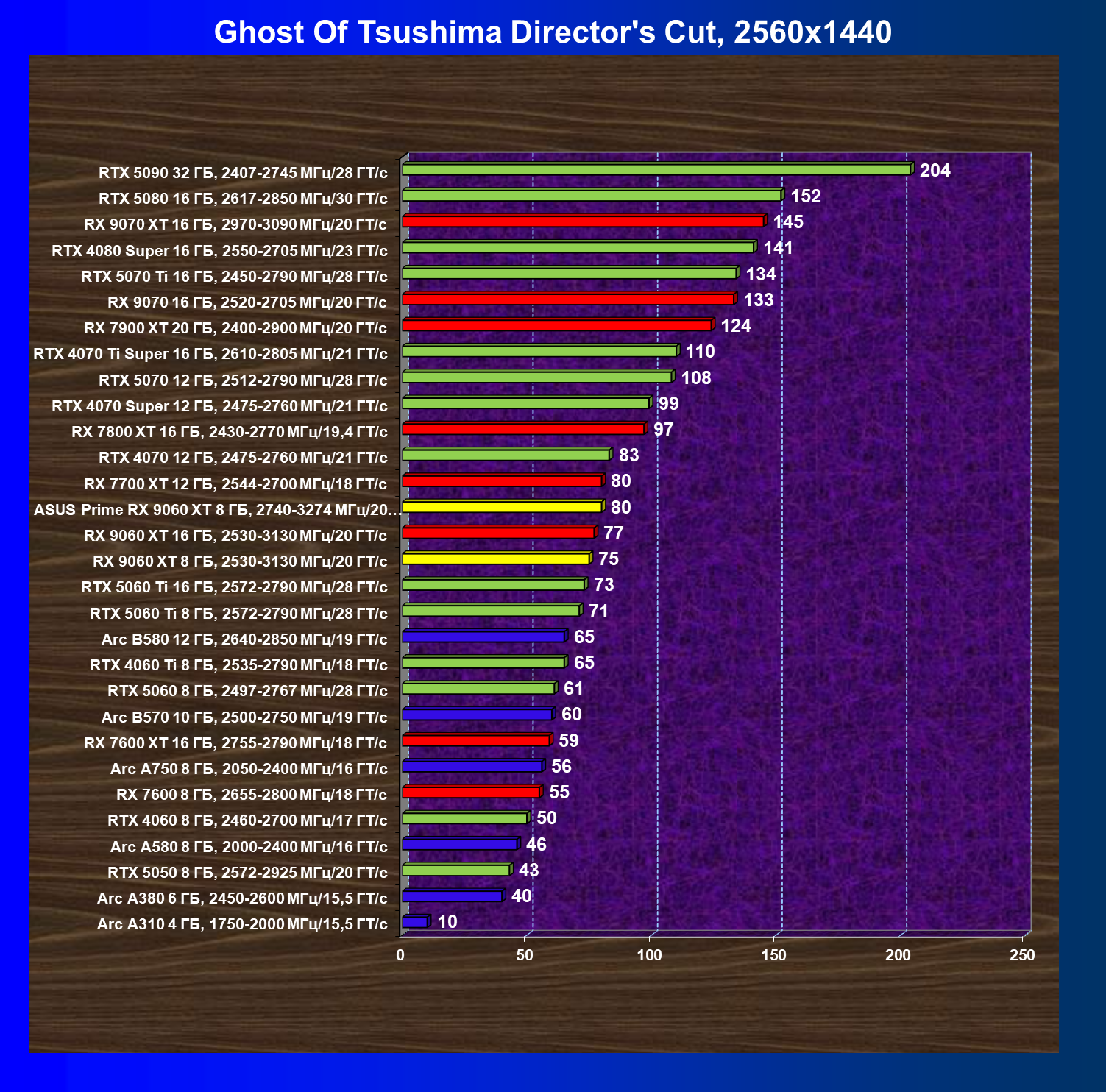 В данном случае ситуация уже несколько иная: вариант RTX 5060 Ti с 16 ГБ резко вышел вперед (понятно, что за счет поддержки и эффективного использования MFG в рамках DLSS4), и RX 9060 XT (16 ГБ) смог продемонстрировать в среднем производительность на уровне уже RTX 5060 Ti с 8 ГБ (который чуть дешевле). А вот Radeon RX 9060 XT (8 ГБ) уже оказался между RTX 5060 Ti (8 ГБ) и RTX 5060, уже сильно обгоняя RX 7700 XT. А карта Asus засчет фабрично поднятых частот смогла обойти даже сильно более дорогой RX 7800 XT, но всё равно догнать RTX 5060 Ti с 8 ГБ не смогла.