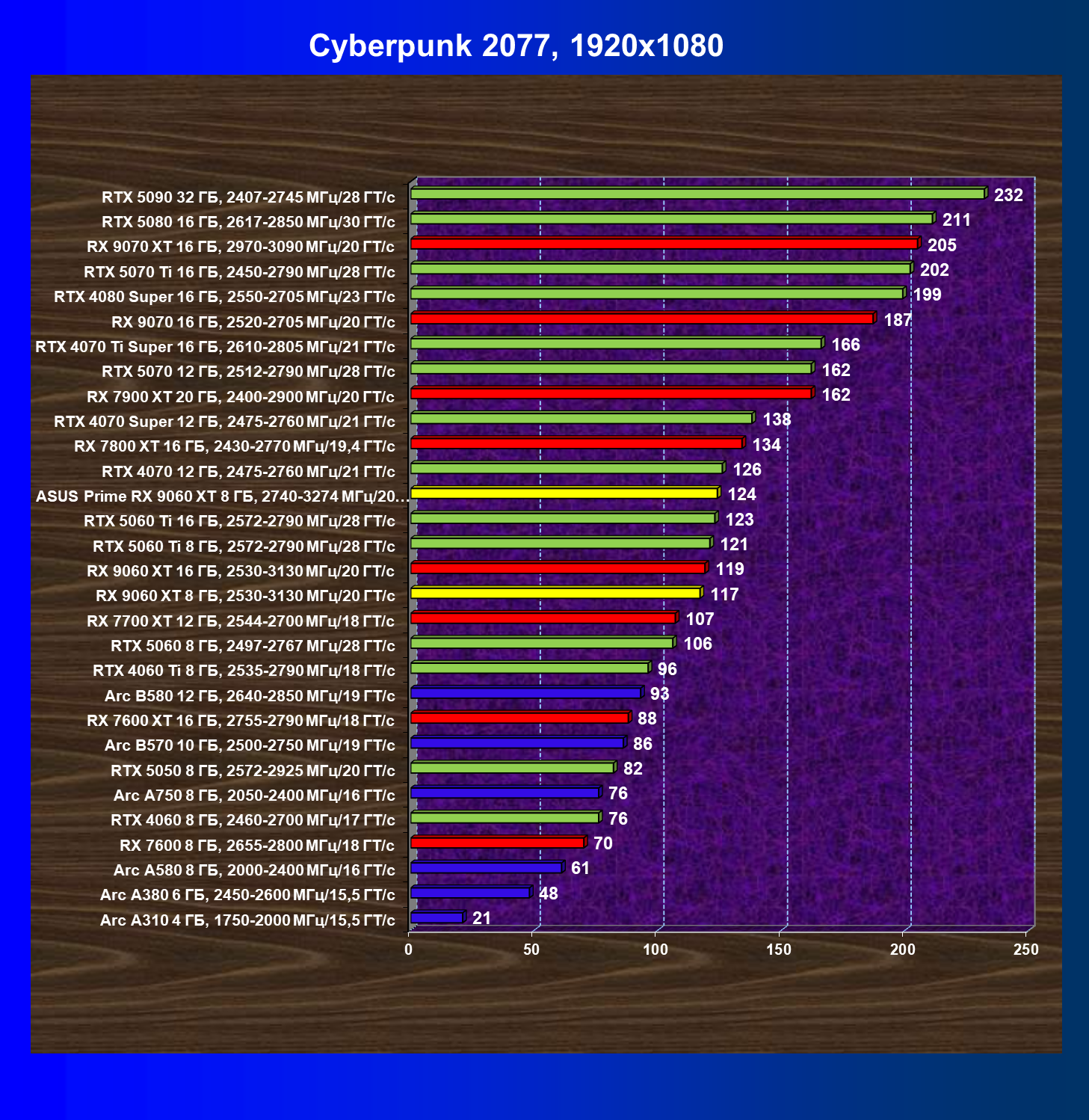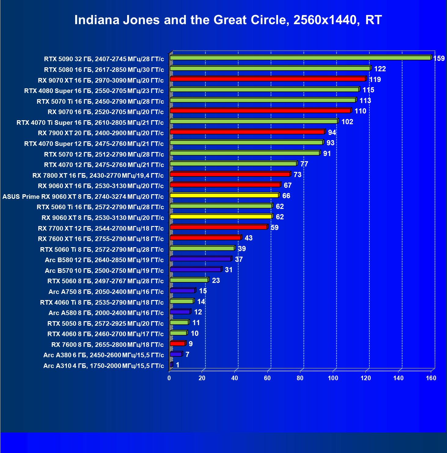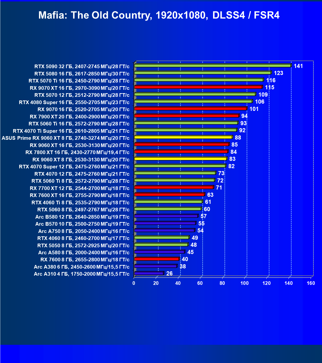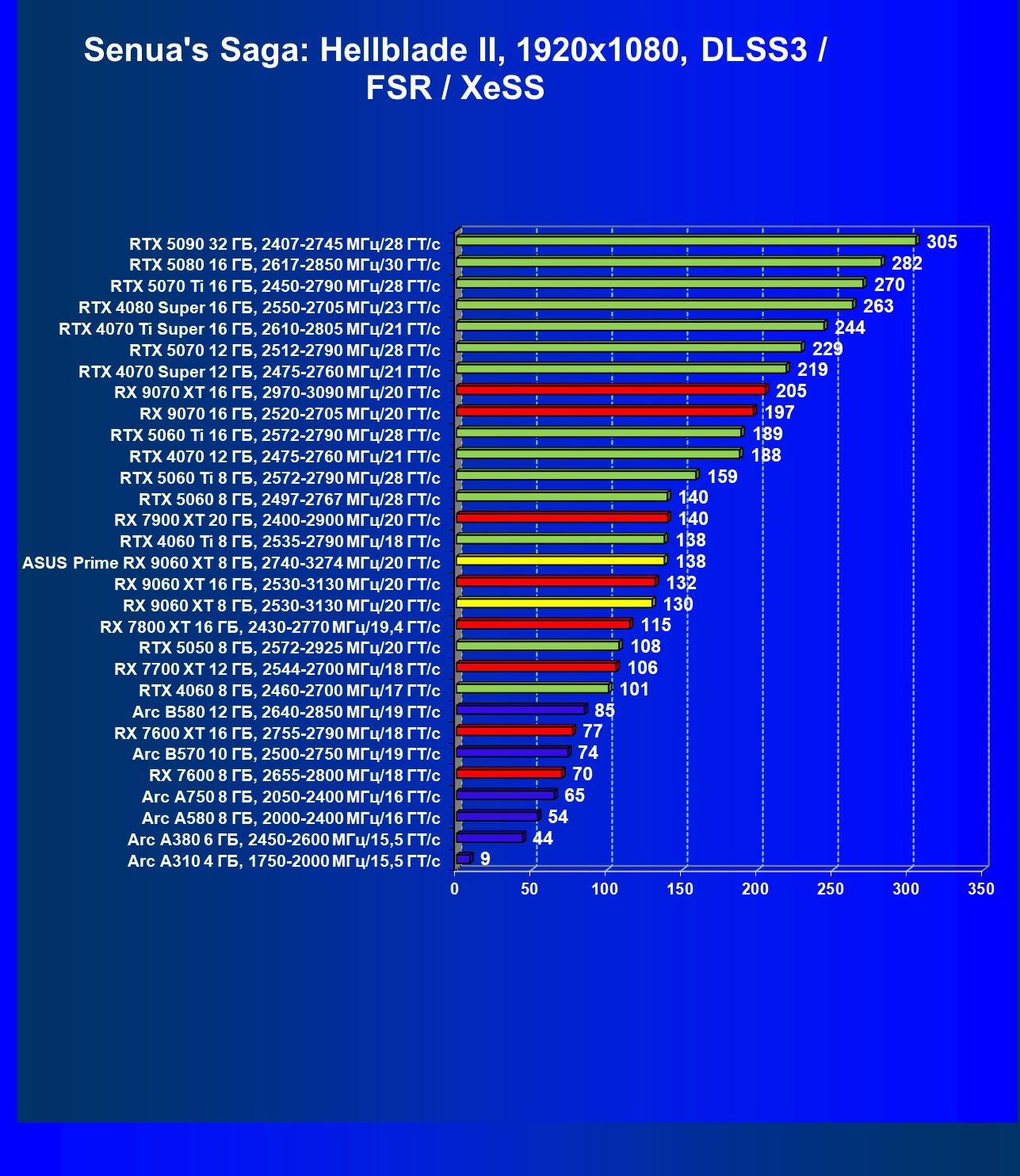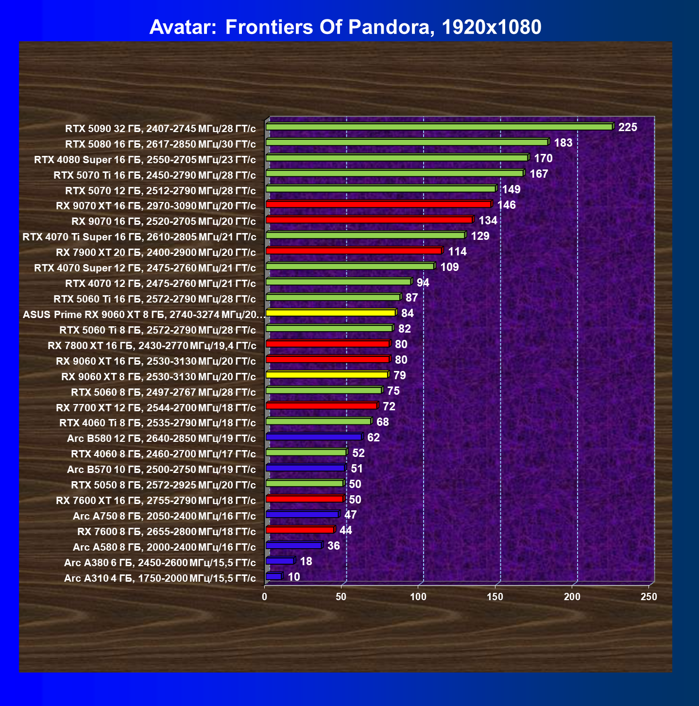 В данном случае ситуация уже несколько иная: вариант RTX 5060 Ti с 16 ГБ резко вышел вперед (понятно, что за счет поддержки и эффективного использования MFG в рамках DLSS4), и RX 9060 XT (16 ГБ) смог продемонстрировать в среднем производительность на уровне уже RTX 5060 Ti с 8 ГБ (который чуть дешевле). А вот Radeon RX 9060 XT (8 ГБ) уже оказался между RTX 5060 Ti (8 ГБ) и RTX 5060, уже сильно обгоняя RX 7700 XT. А карта Asus засчет фабрично поднятых частот смогла обойти даже сильно более дорогой RX 7800 XT, но всё равно догнать RTX 5060 Ti с 8 ГБ не смогла.