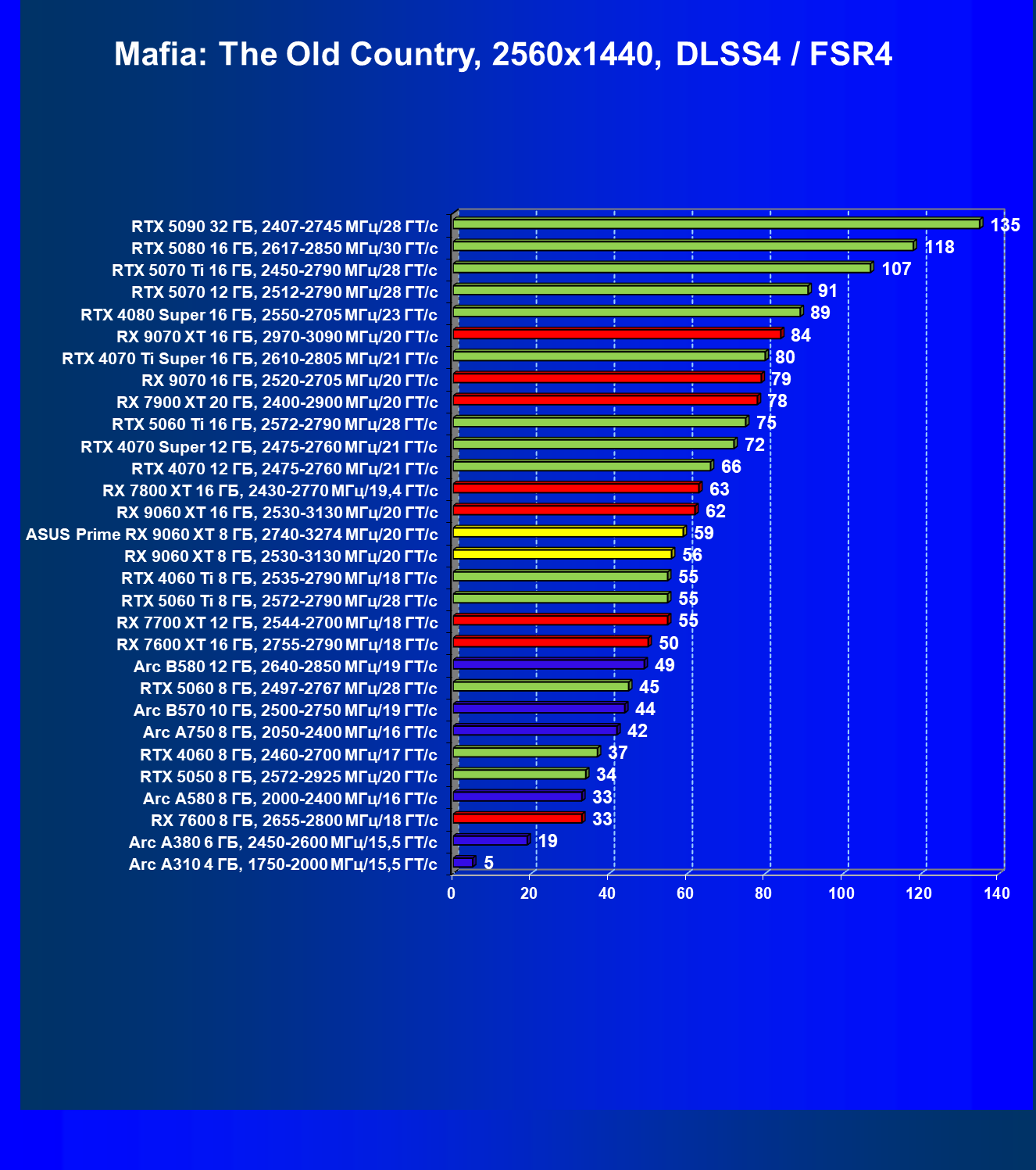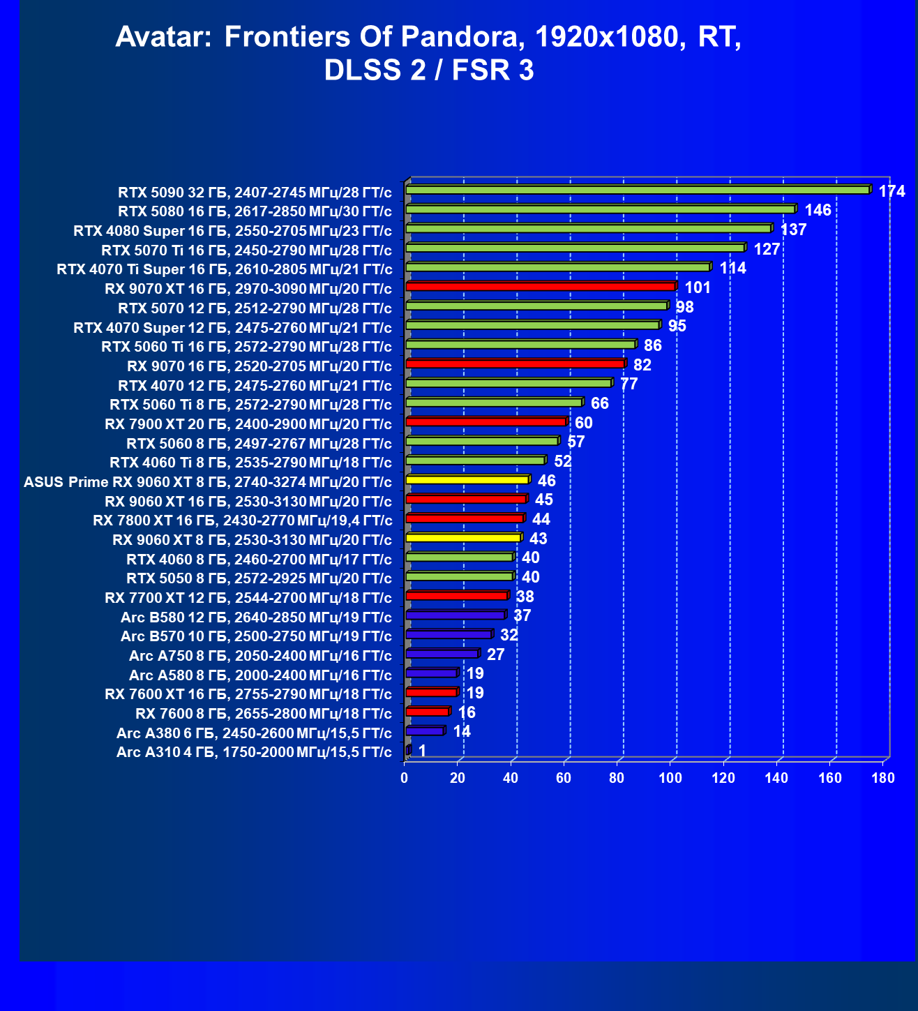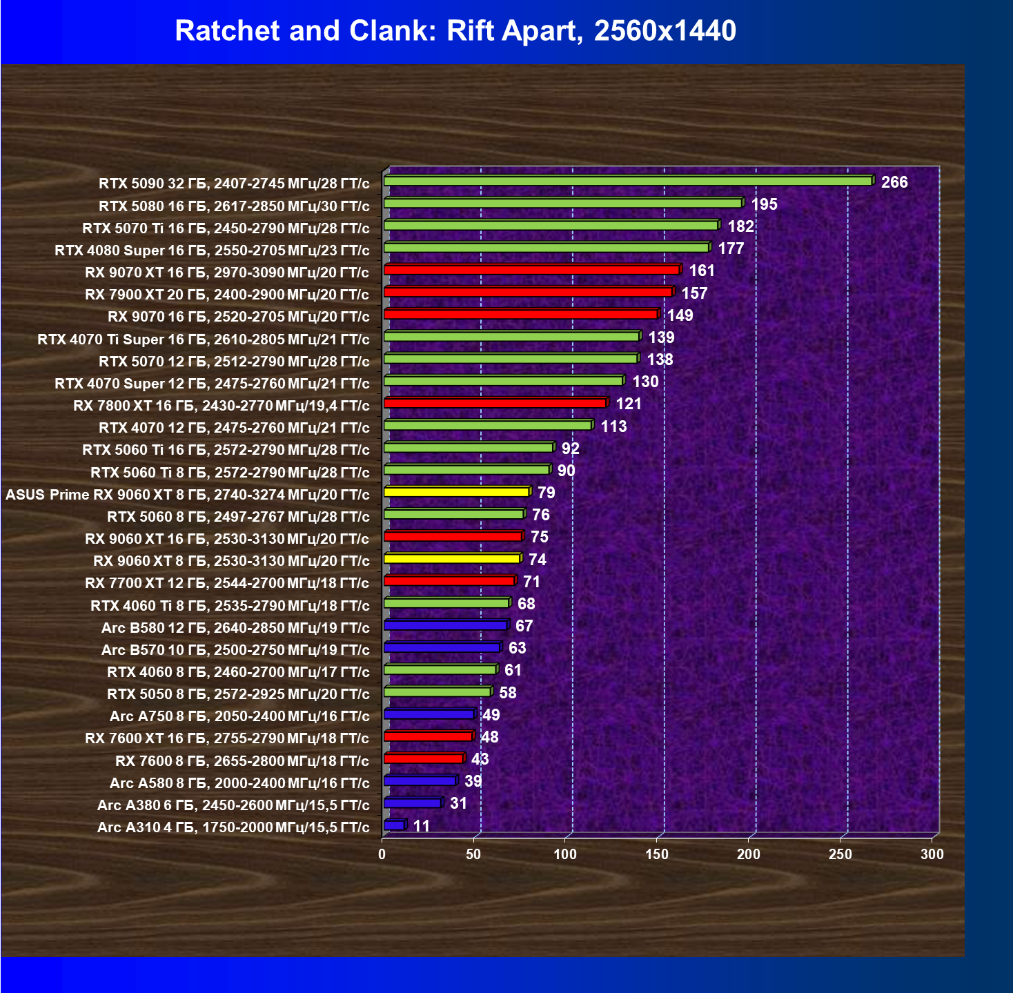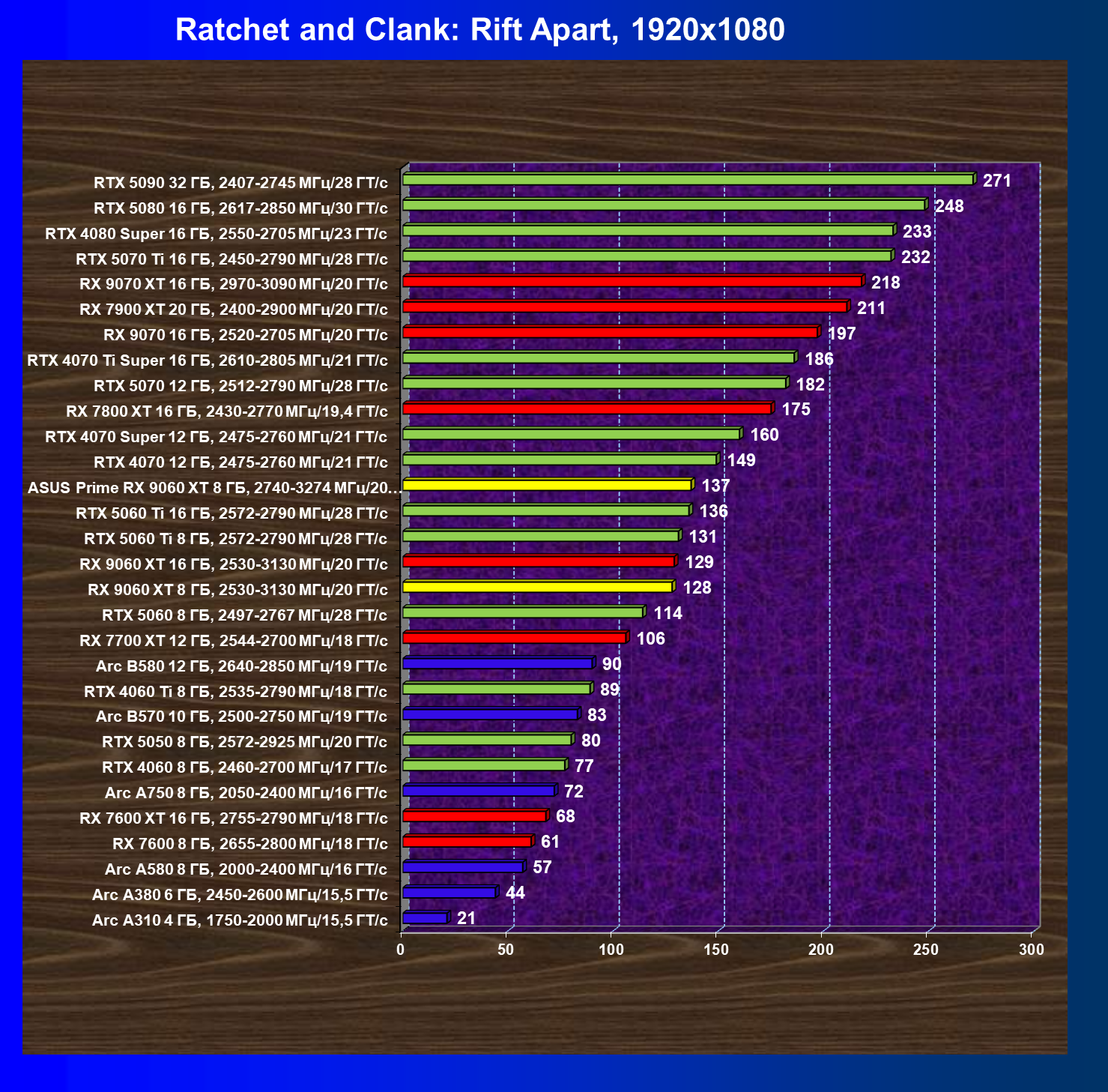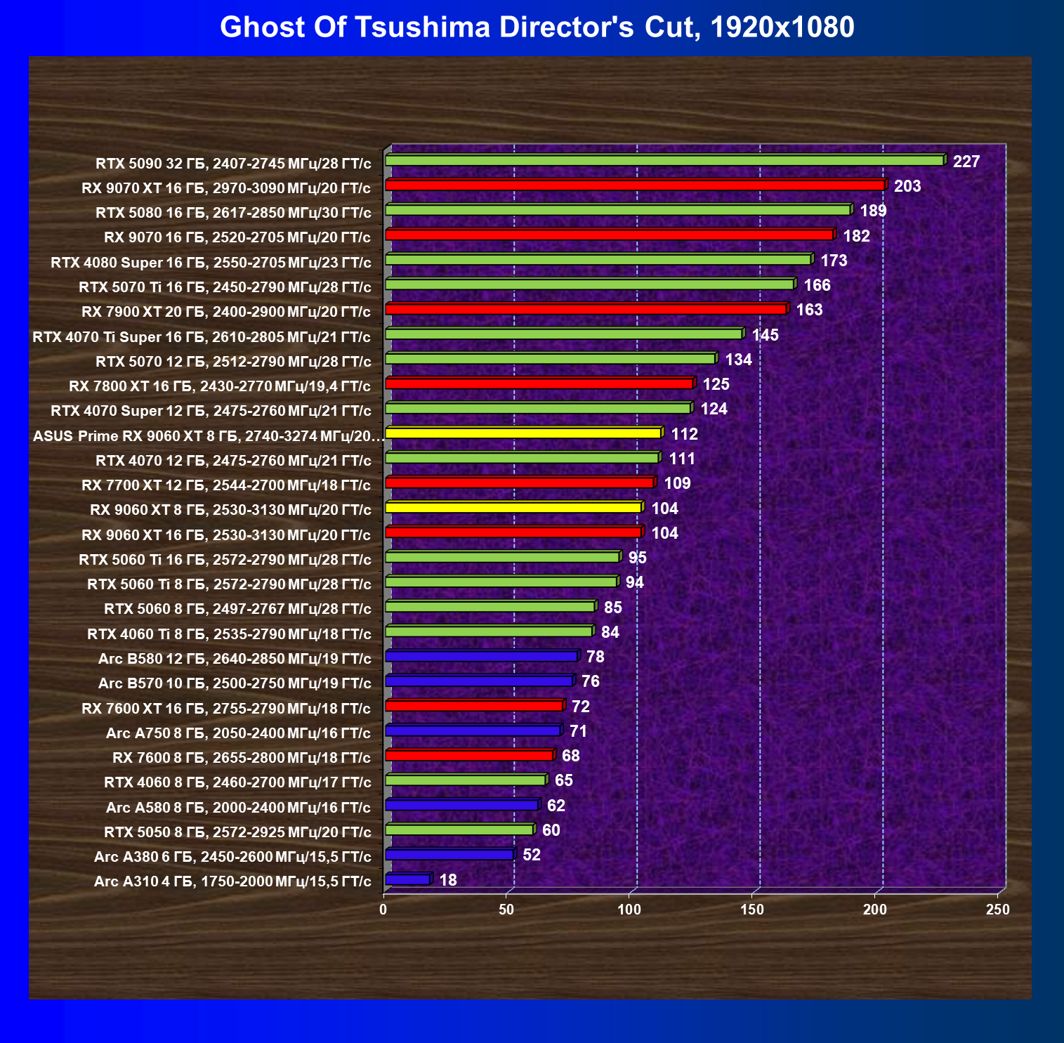 В данном случае ситуация уже несколько иная: вариант RTX 5060 Ti с 16 ГБ резко вышел вперед (понятно, что за счет поддержки и эффективного использования MFG в рамках DLSS4), и RX 9060 XT (16 ГБ) смог продемонстрировать в среднем производительность на уровне уже RTX 5060 Ti с 8 ГБ (который чуть дешевле). А вот Radeon RX 9060 XT (8 ГБ) уже оказался между RTX 5060 Ti (8 ГБ) и RTX 5060, уже сильно обгоняя RX 7700 XT. А карта Asus засчет фабрично поднятых частот смогла обойти даже сильно более дорогой RX 7800 XT, но всё равно догнать RTX 5060 Ti с 8 ГБ не смогла.