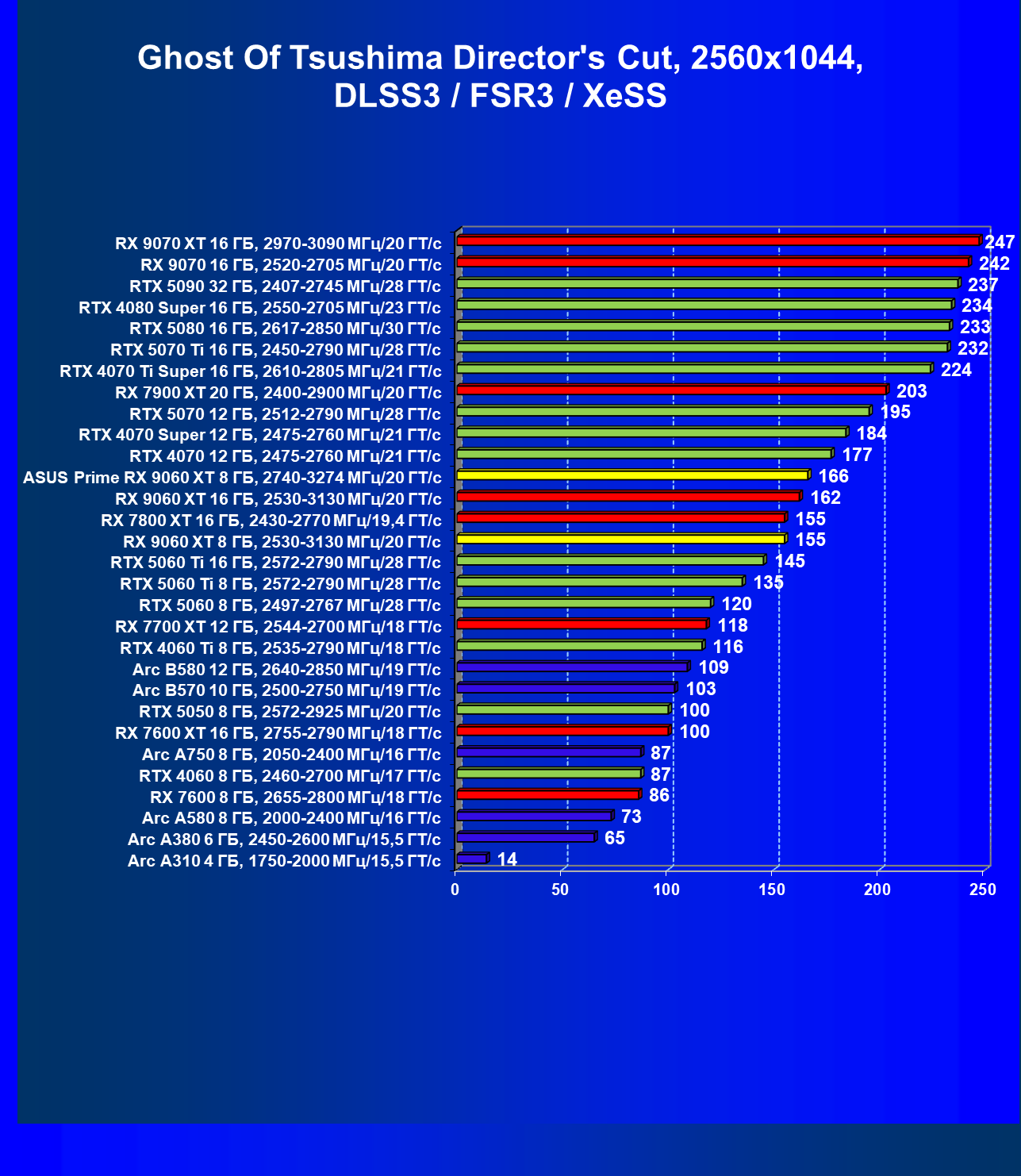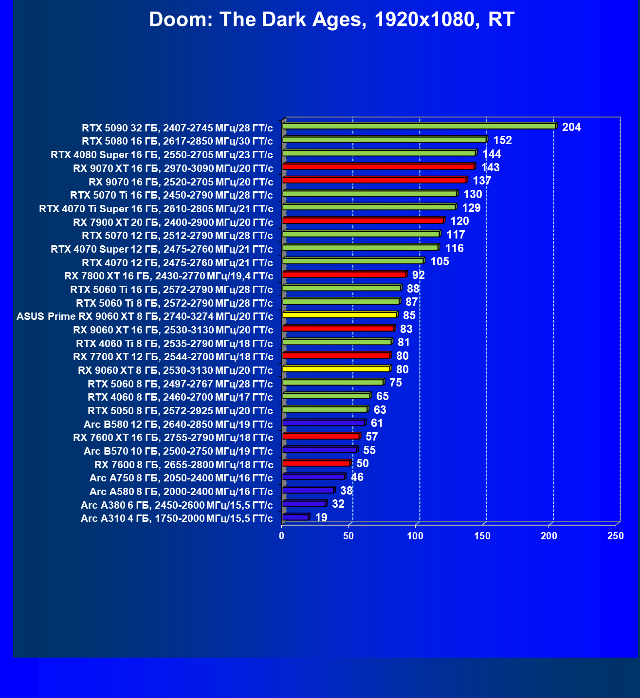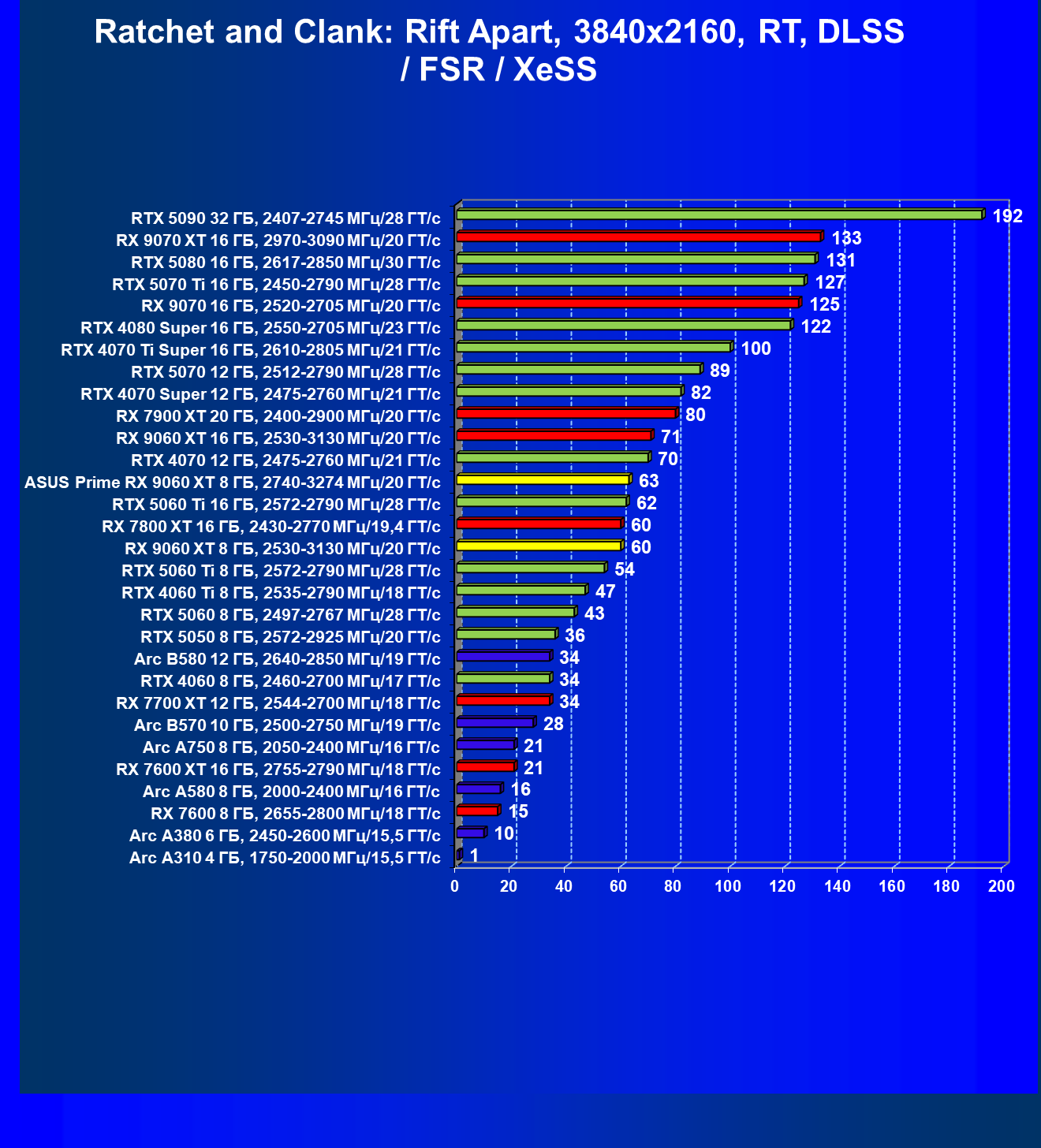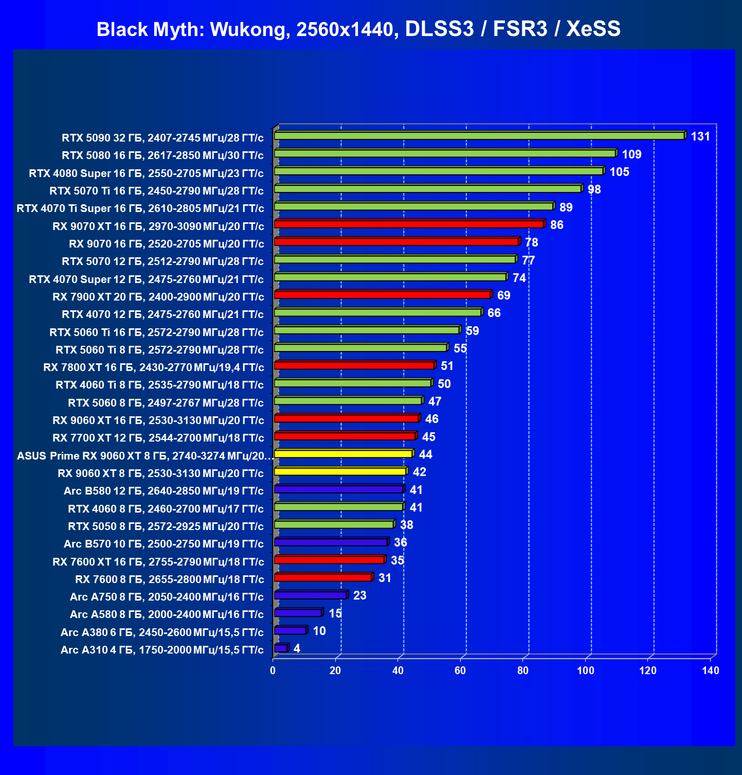 В данном случае ситуация уже несколько иная: вариант RTX 5060 Ti с 16 ГБ резко вышел вперед (понятно, что за счет поддержки и эффективного использования MFG в рамках DLSS4), и RX 9060 XT (16 ГБ) смог продемонстрировать в среднем производительность на уровне уже RTX 5060 Ti с 8 ГБ (который чуть дешевле). А вот Radeon RX 9060 XT (8 ГБ) уже оказался между RTX 5060 Ti (8 ГБ) и RTX 5060, уже сильно обгоняя RX 7700 XT. А карта Asus засчет фабрично поднятых частот смогла обойти даже сильно более дорогой RX 7800 XT, но всё равно догнать RTX 5060 Ti с 8 ГБ не смогла.