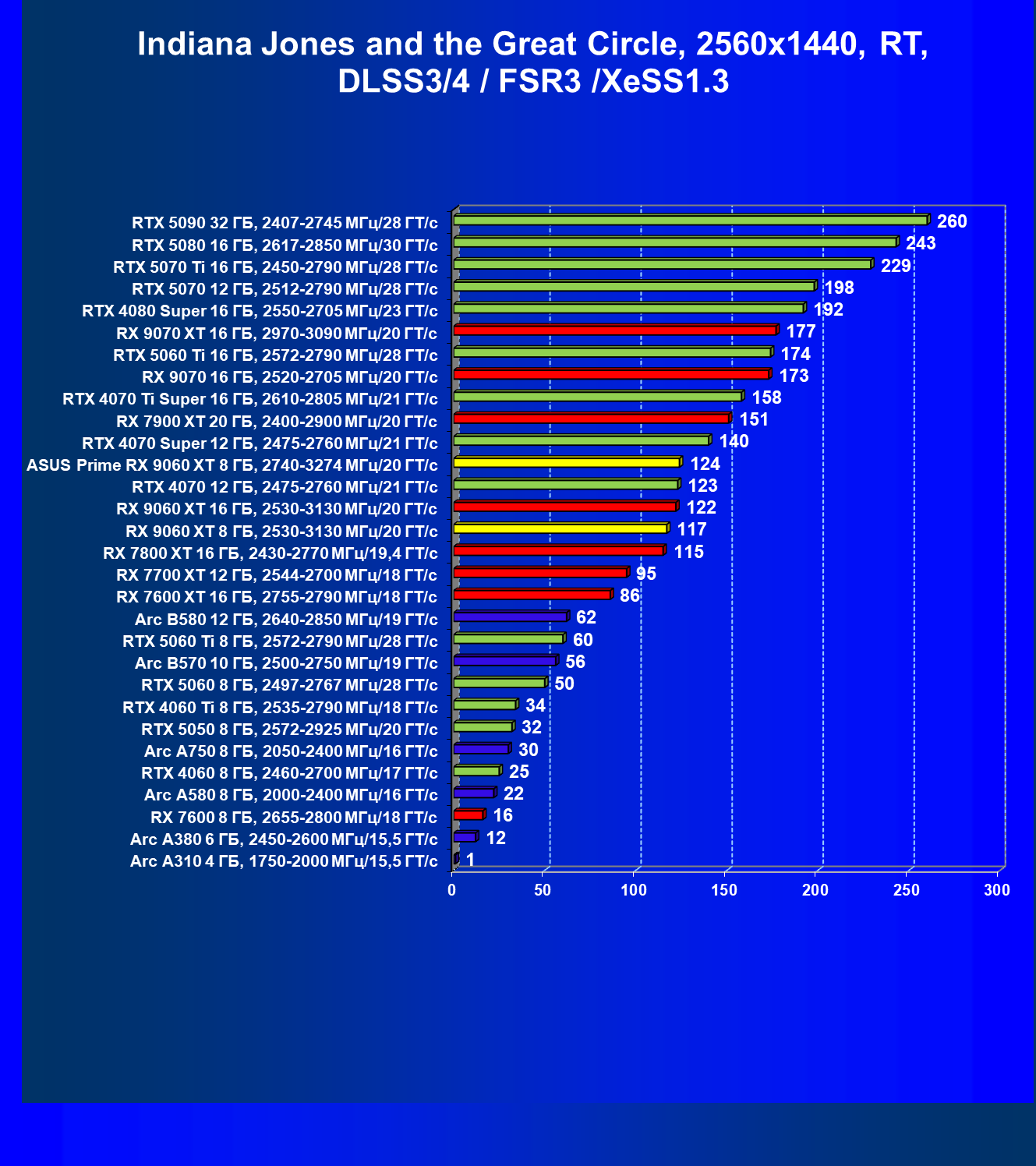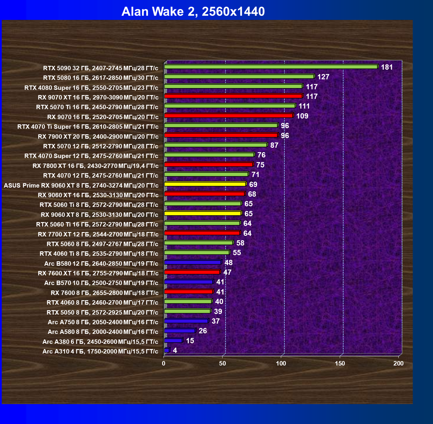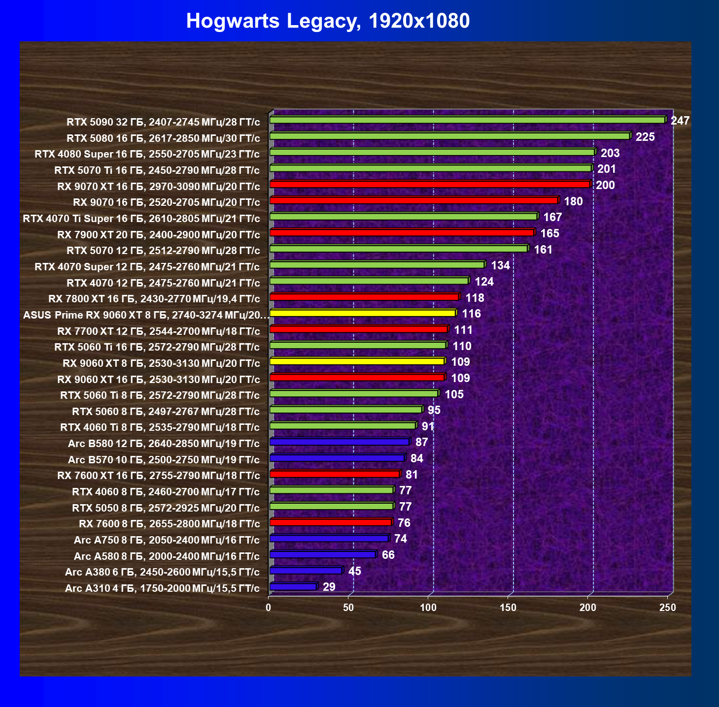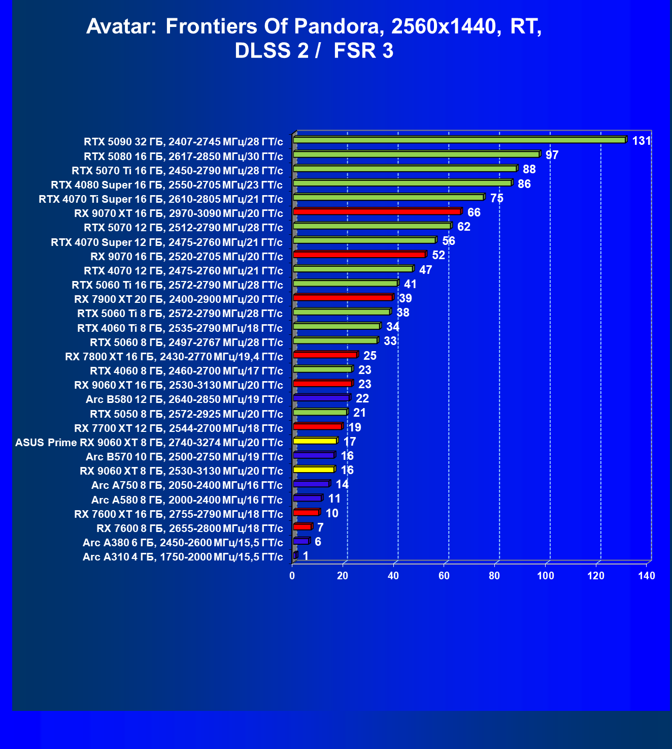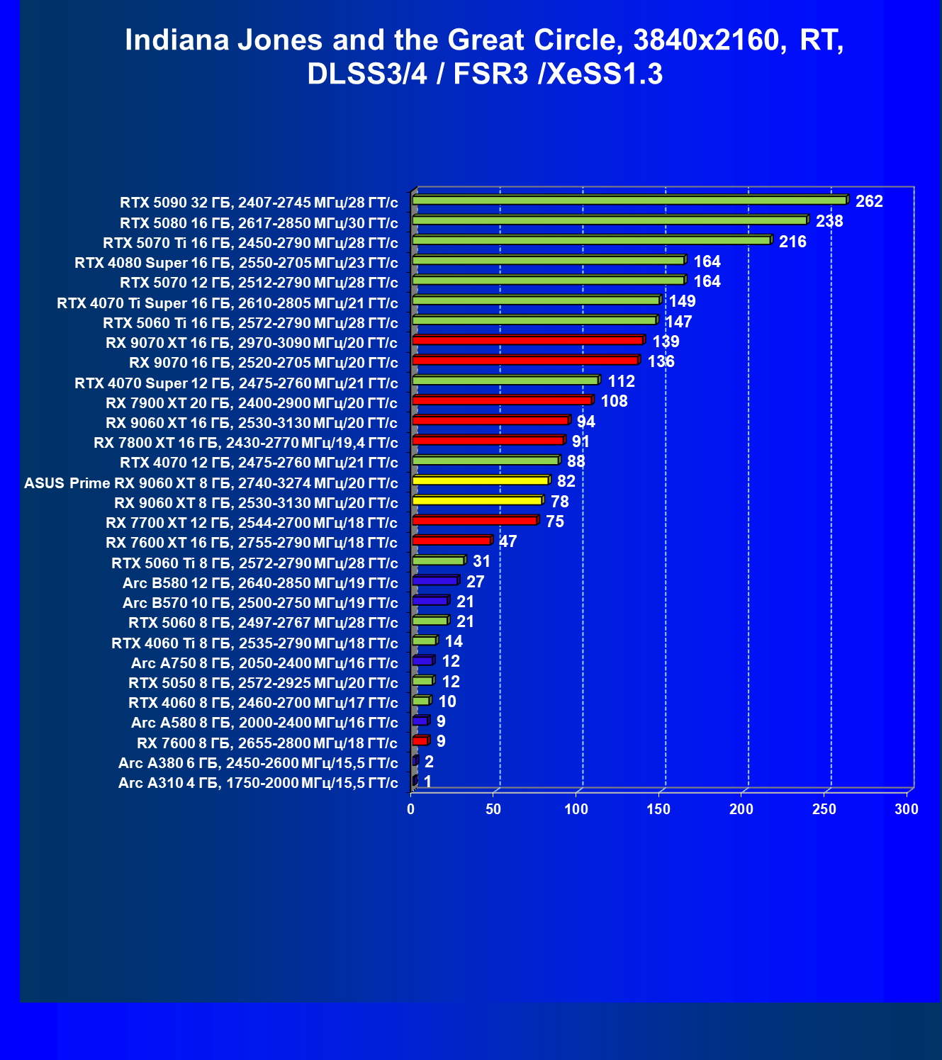 В данном случае ситуация уже несколько иная: вариант RTX 5060 Ti с 16 ГБ резко вышел вперед (понятно, что за счет поддержки и эффективного использования MFG в рамках DLSS4), и RX 9060 XT (16 ГБ) смог продемонстрировать в среднем производительность на уровне уже RTX 5060 Ti с 8 ГБ (который чуть дешевле). А вот Radeon RX 9060 XT (8 ГБ) уже оказался между RTX 5060 Ti (8 ГБ) и RTX 5060, уже сильно обгоняя RX 7700 XT. А карта Asus засчет фабрично поднятых частот смогла обойти даже сильно более дорогой RX 7800 XT, но всё равно догнать RTX 5060 Ti с 8 ГБ не смогла.