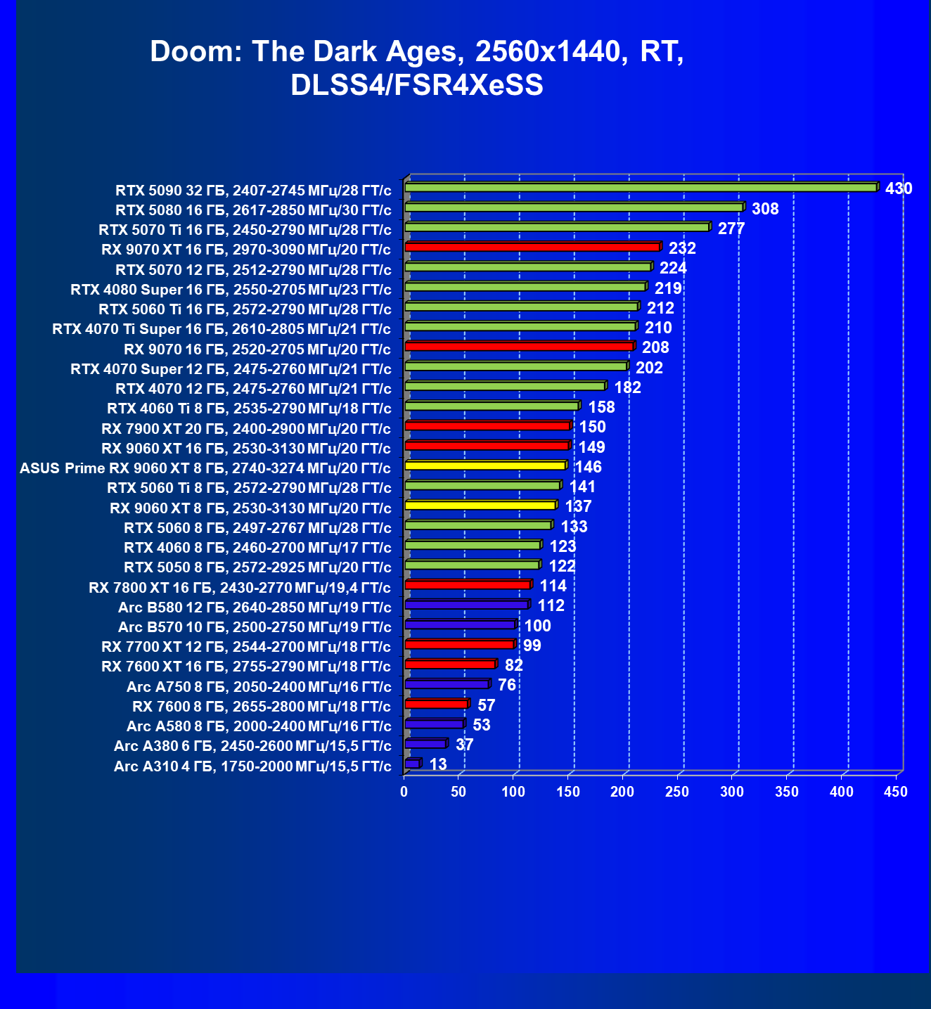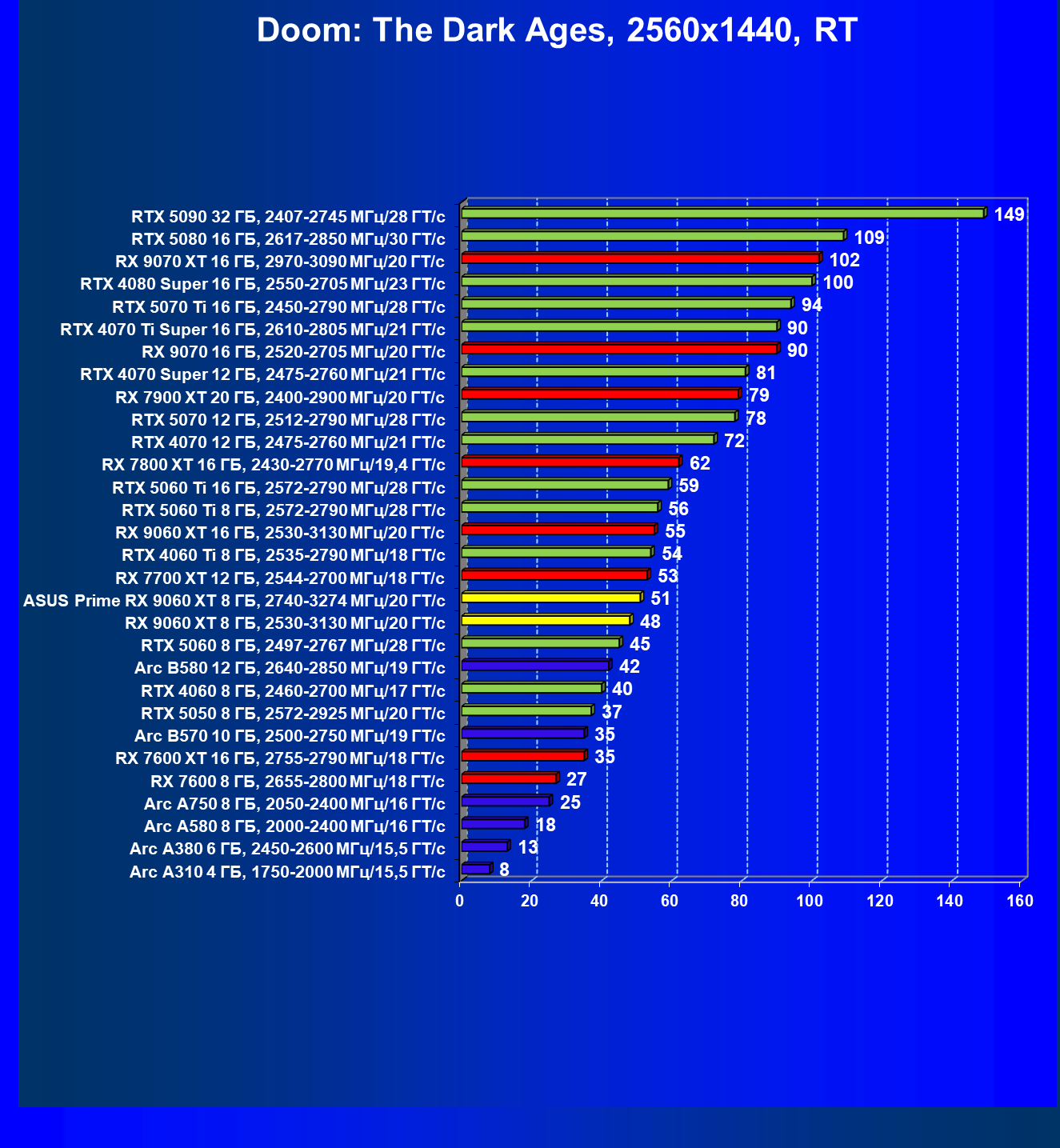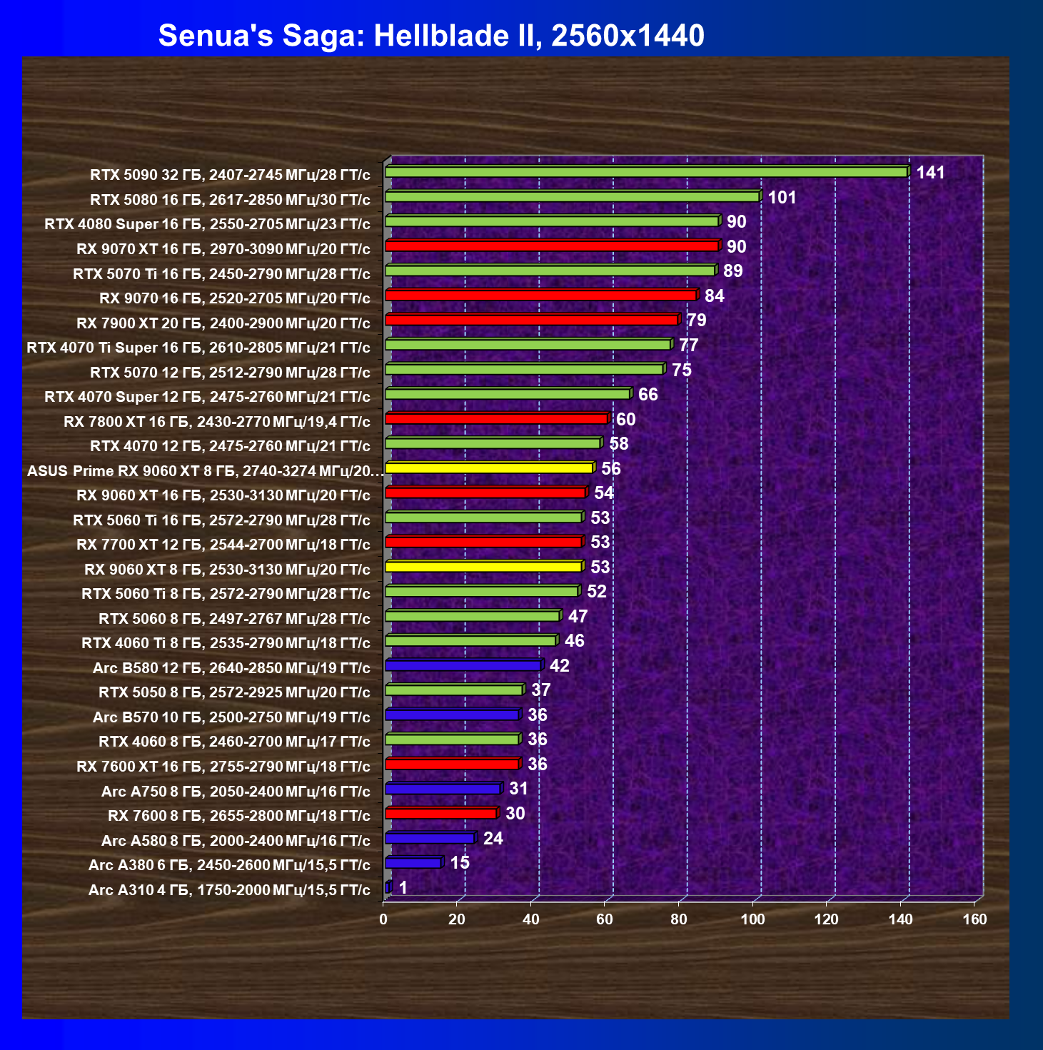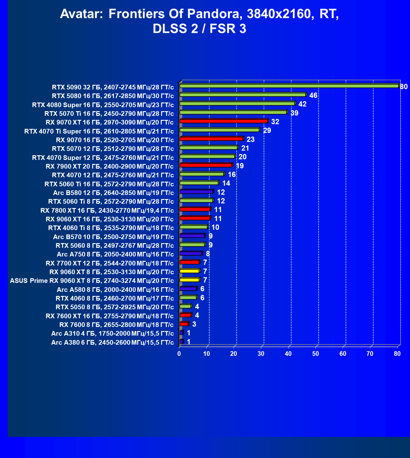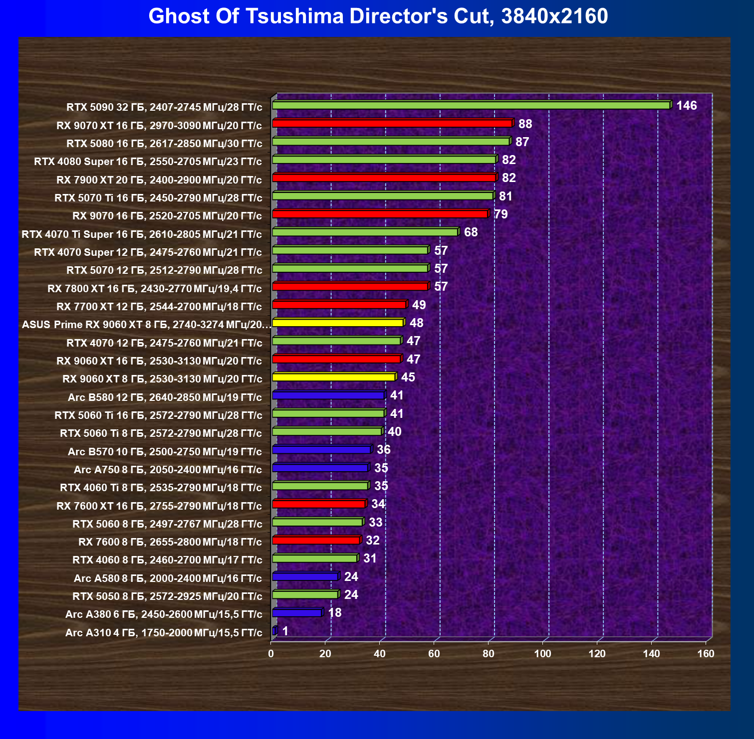 В данном случае ситуация уже несколько иная: вариант RTX 5060 Ti с 16 ГБ резко вышел вперед (понятно, что за счет поддержки и эффективного использования MFG в рамках DLSS4), и RX 9060 XT (16 ГБ) смог продемонстрировать в среднем производительность на уровне уже RTX 5060 Ti с 8 ГБ (который чуть дешевле). А вот Radeon RX 9060 XT (8 ГБ) уже оказался между RTX 5060 Ti (8 ГБ) и RTX 5060, уже сильно обгоняя RX 7700 XT. А карта Asus засчет фабрично поднятых частот смогла обойти даже сильно более дорогой RX 7800 XT, но всё равно догнать RTX 5060 Ti с 8 ГБ не смогла.