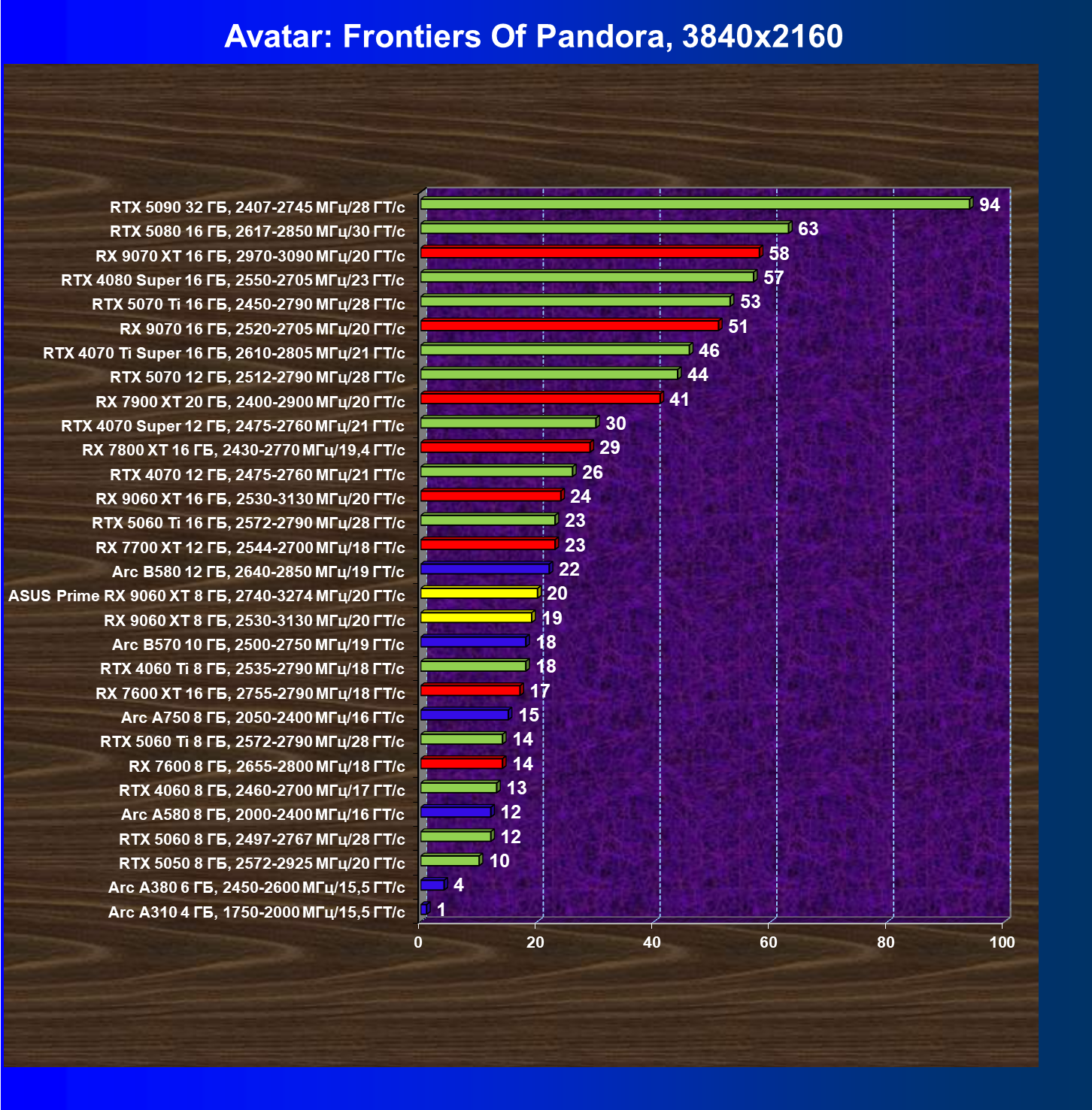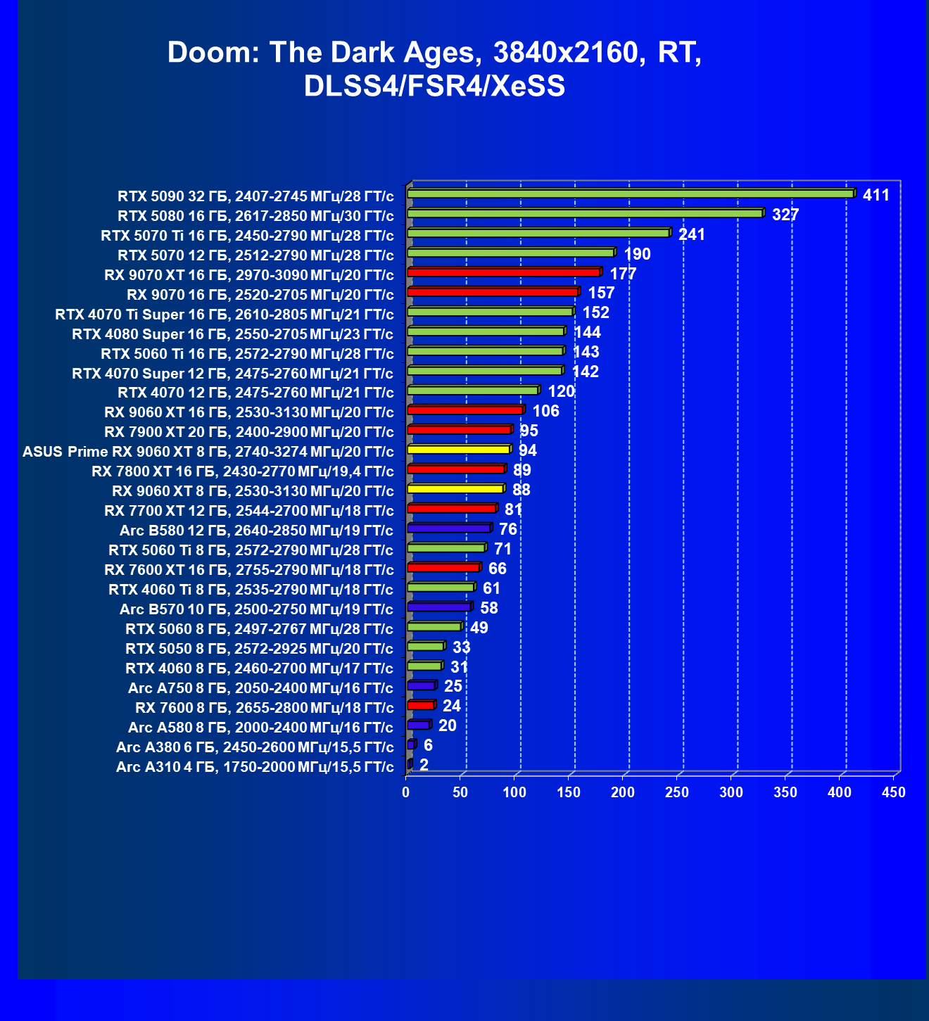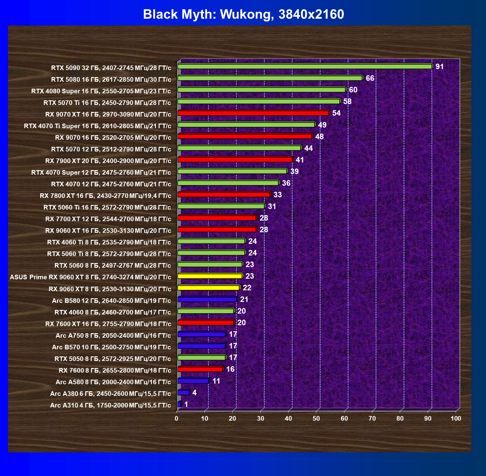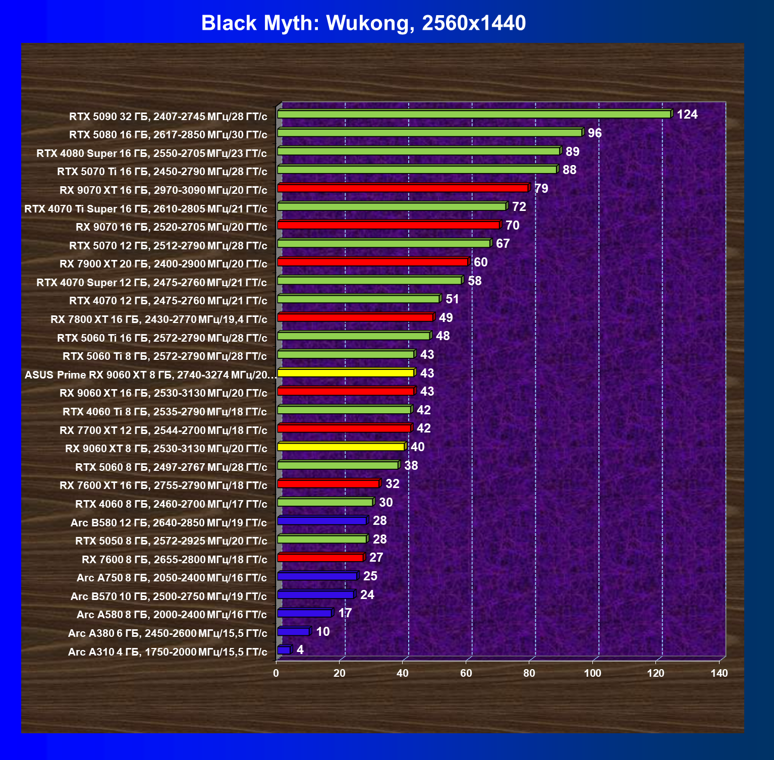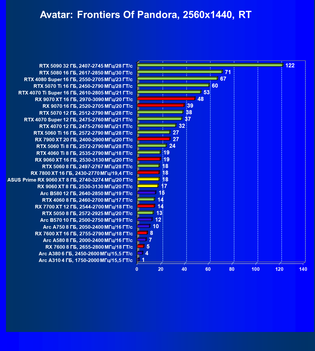 В данном случае ситуация уже несколько иная: вариант RTX 5060 Ti с 16 ГБ резко вышел вперед (понятно, что за счет поддержки и эффективного использования MFG в рамках DLSS4), и RX 9060 XT (16 ГБ) смог продемонстрировать в среднем производительность на уровне уже RTX 5060 Ti с 8 ГБ (который чуть дешевле). А вот Radeon RX 9060 XT (8 ГБ) уже оказался между RTX 5060 Ti (8 ГБ) и RTX 5060, уже сильно обгоняя RX 7700 XT. А карта Asus засчет фабрично поднятых частот смогла обойти даже сильно более дорогой RX 7800 XT, но всё равно догнать RTX 5060 Ti с 8 ГБ не смогла.