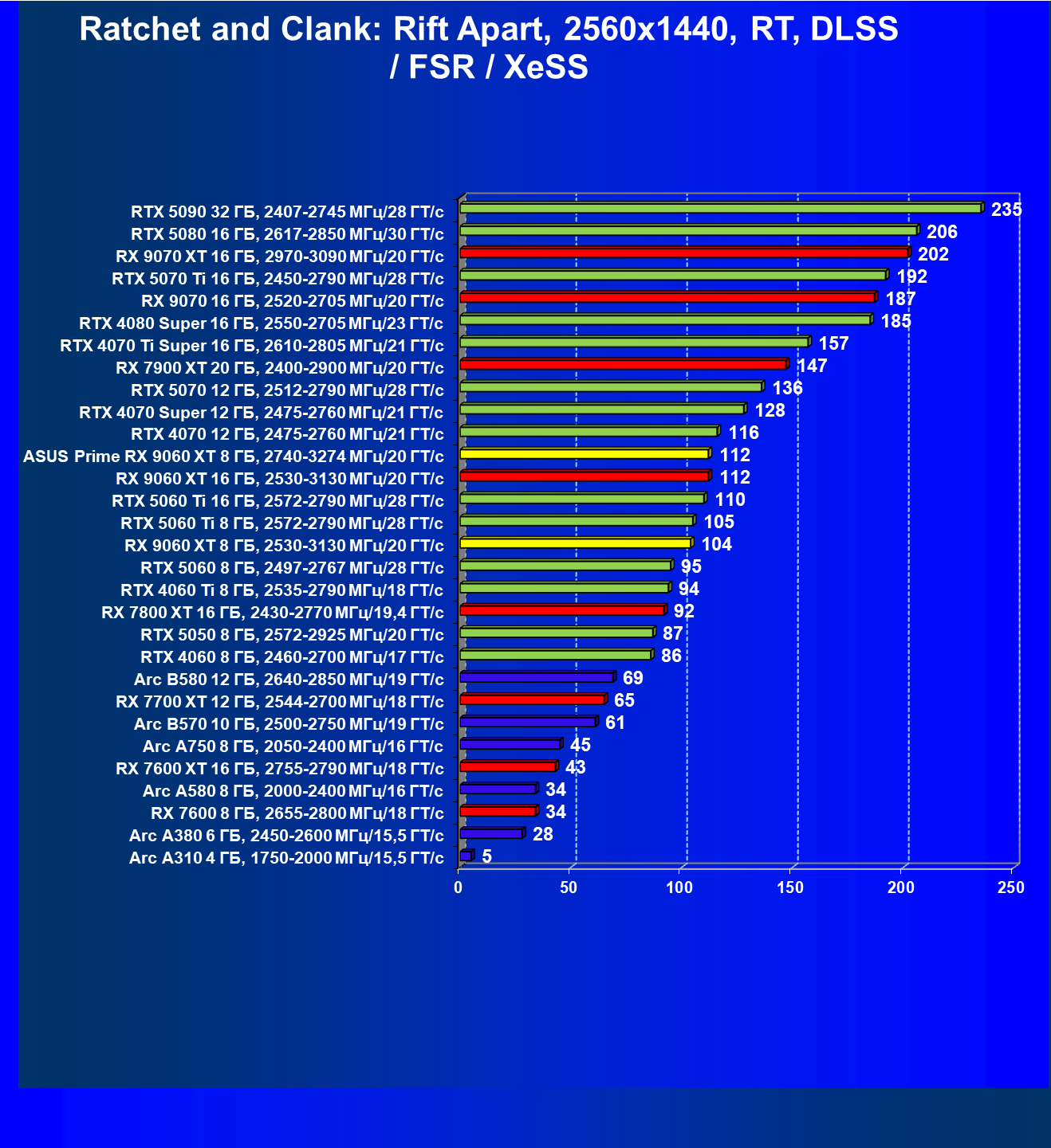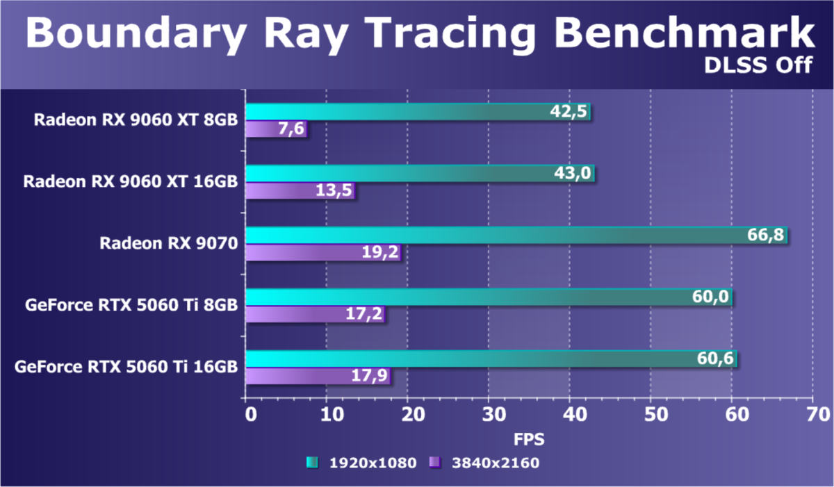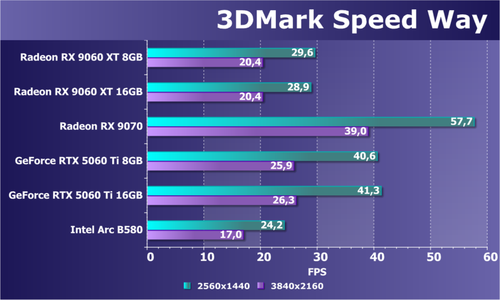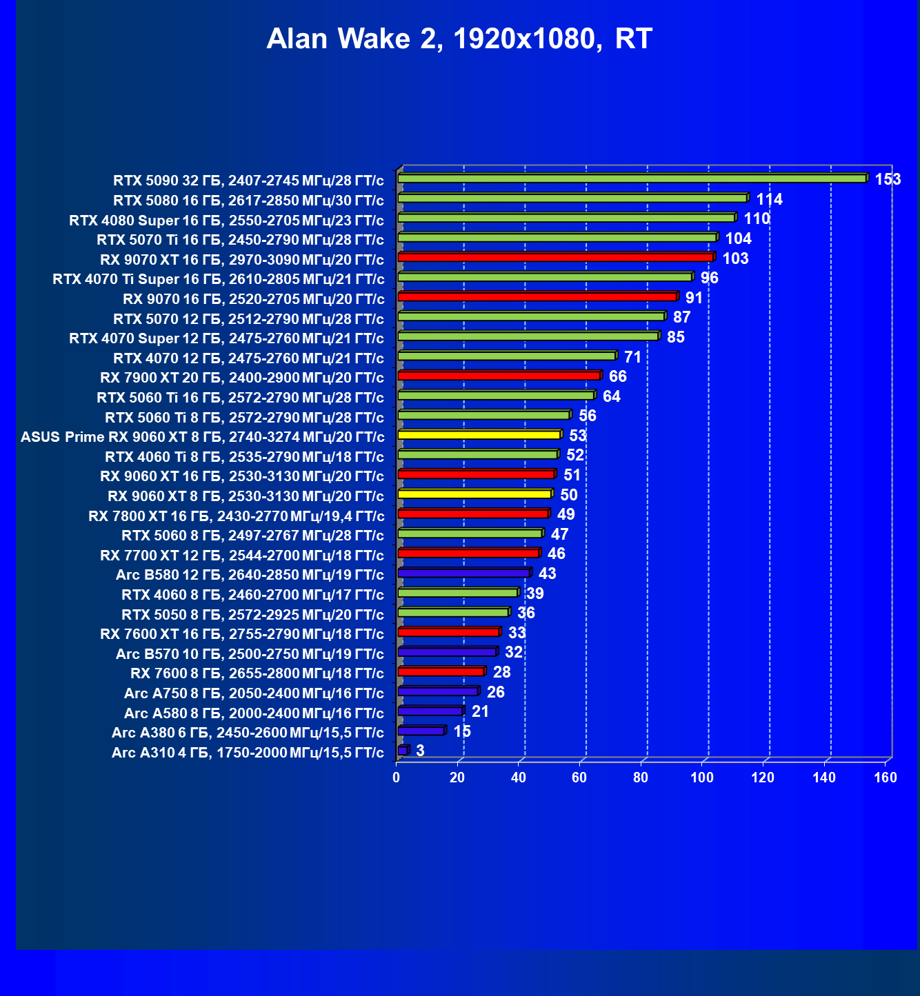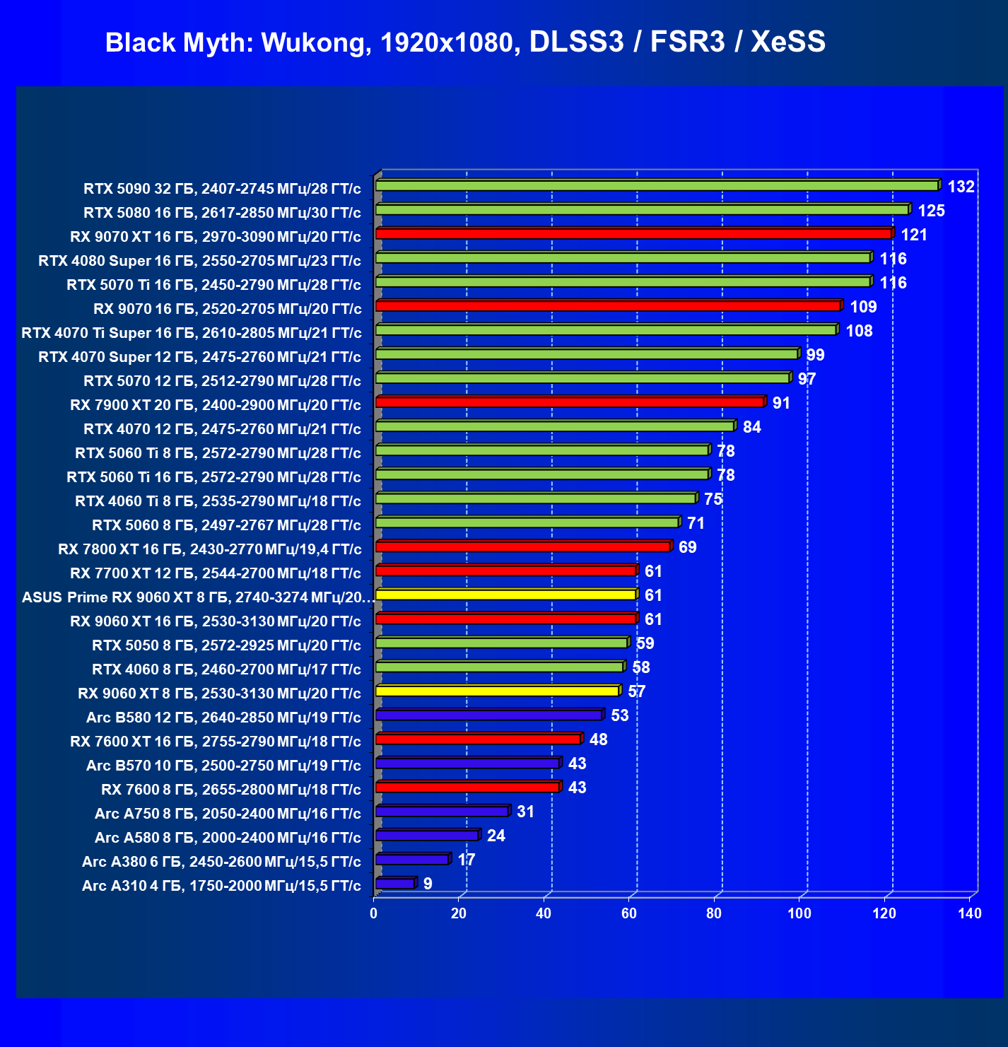Еще раз отметим, что в классических играх производительность Radeon RX 9060 XT (с 8 и 16 ГБ памяти) позволяет получить высокий уровень комфорта в играх на максимальных настройках качества в разрешении 1080p (Full HD), во многих играх с Radeon RX 9060 XT (16 ГБ) можно хорошо поиграть и в разрешении 1440p (2.5K), но вариант с 8 ГБ в этом плане несколько хуже, с ним лучше ограничиться разрешением 1080p. Использование трассировки лучей надо обязательно сочетать с технологиями динамического масштабирования, и в таком случае можно получить высокую играбельность в 1080p, а в ряде случаев и в 1440p.