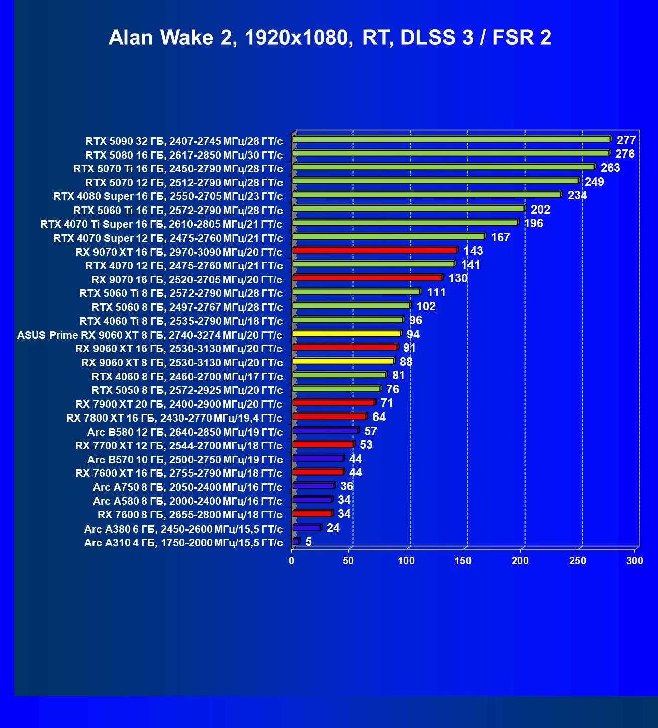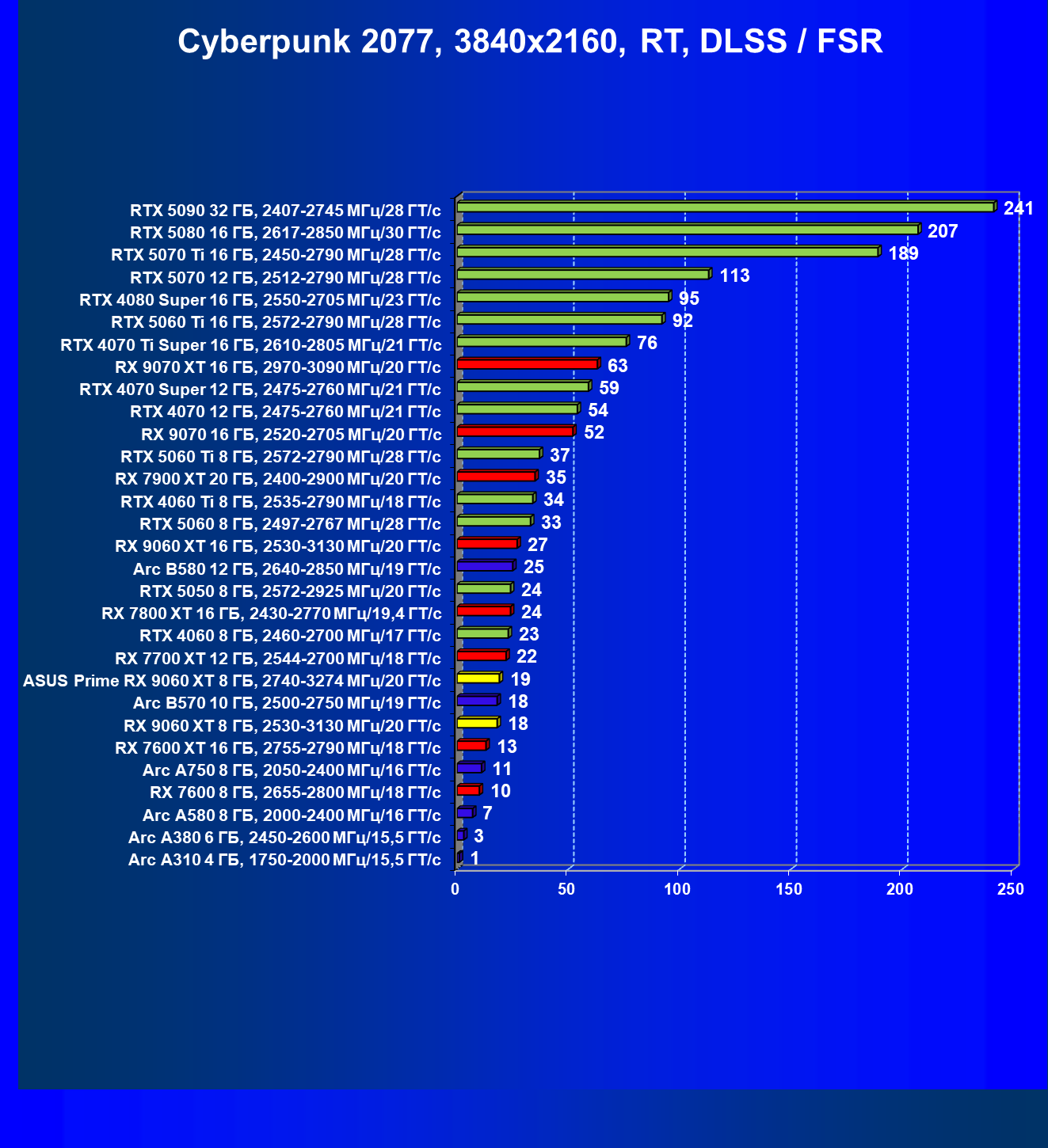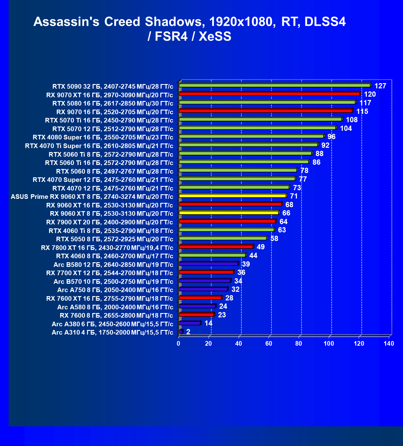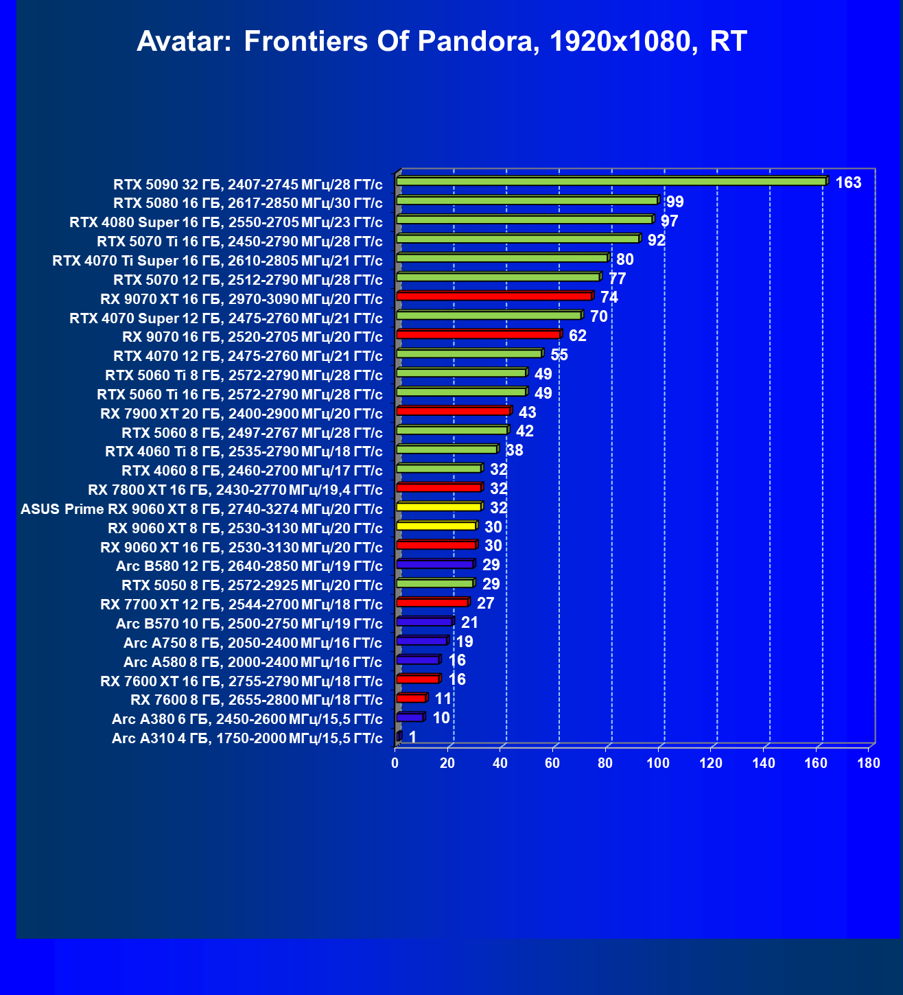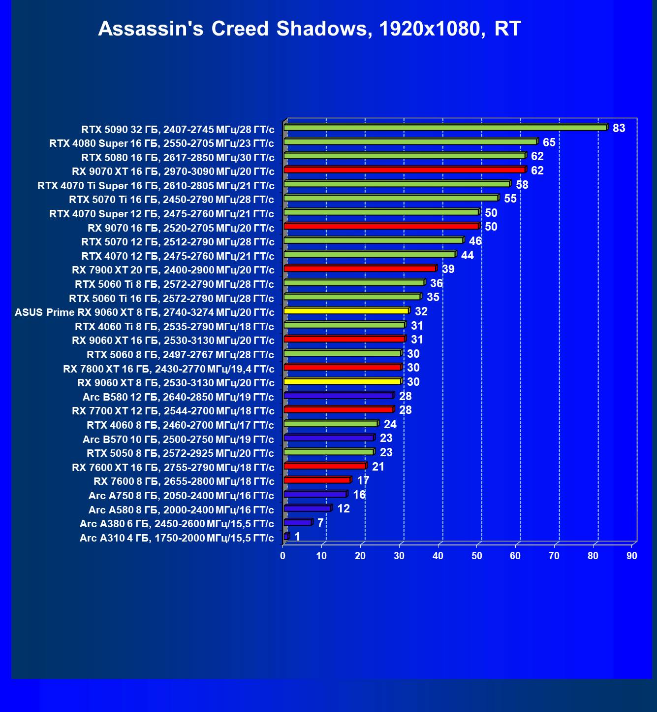 Еще раз отметим, что в классических играх производительность Radeon RX 9060 XT (с 8 и 16 ГБ памяти) позволяет получить высокий уровень комфорта в играх на максимальных настройках качества в разрешении 1080p (Full HD), во многих играх с Radeon RX 9060 XT (16 ГБ) можно хорошо поиграть и в разрешении 1440p (2.5K), но вариант с 8 ГБ в этом плане несколько хуже, с ним лучше ограничиться разрешением 1080p. Использование трассировки лучей надо обязательно сочетать с технологиями динамического масштабирования, и в таком случае можно получить высокую играбельность в 1080p, а в ряде случаев и в 1440p.