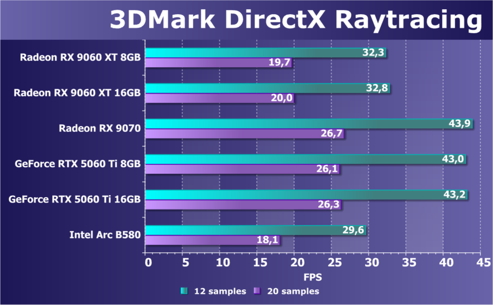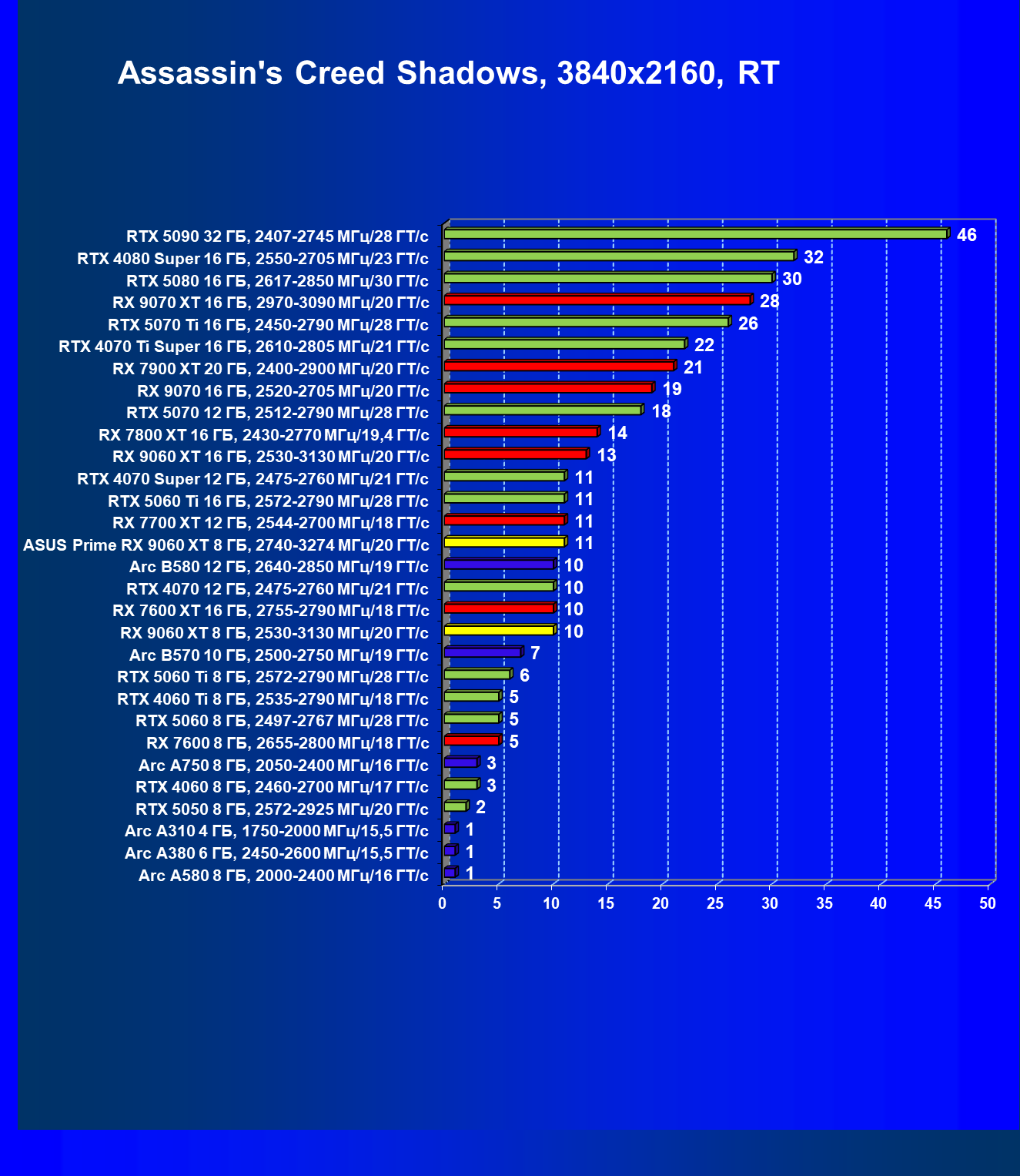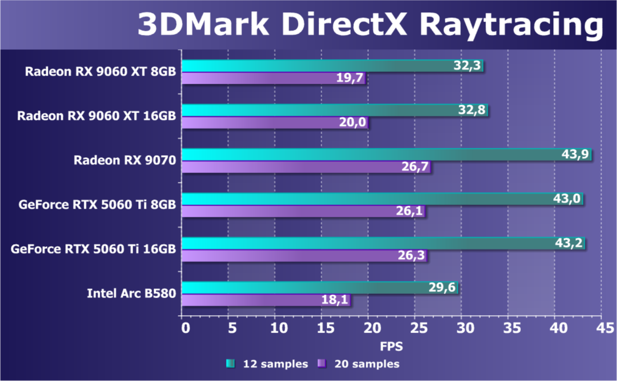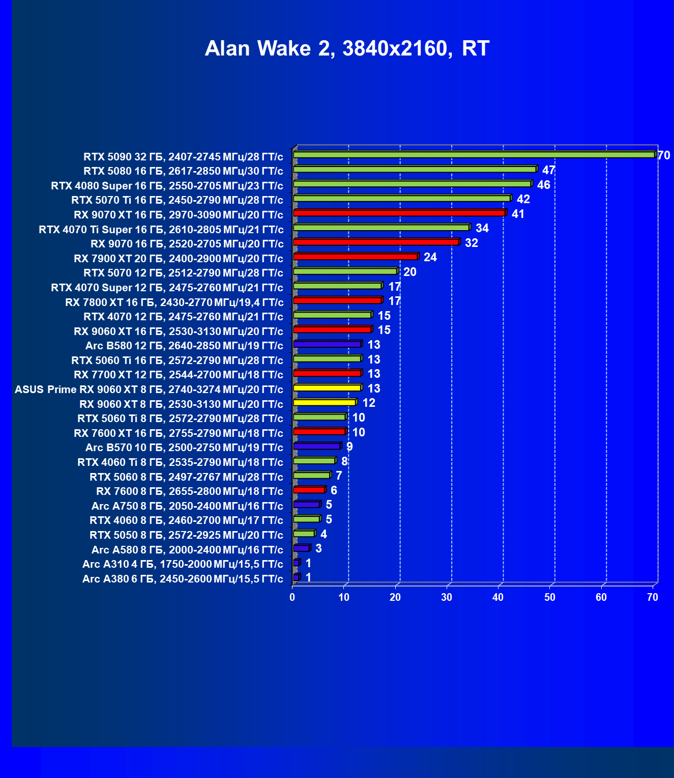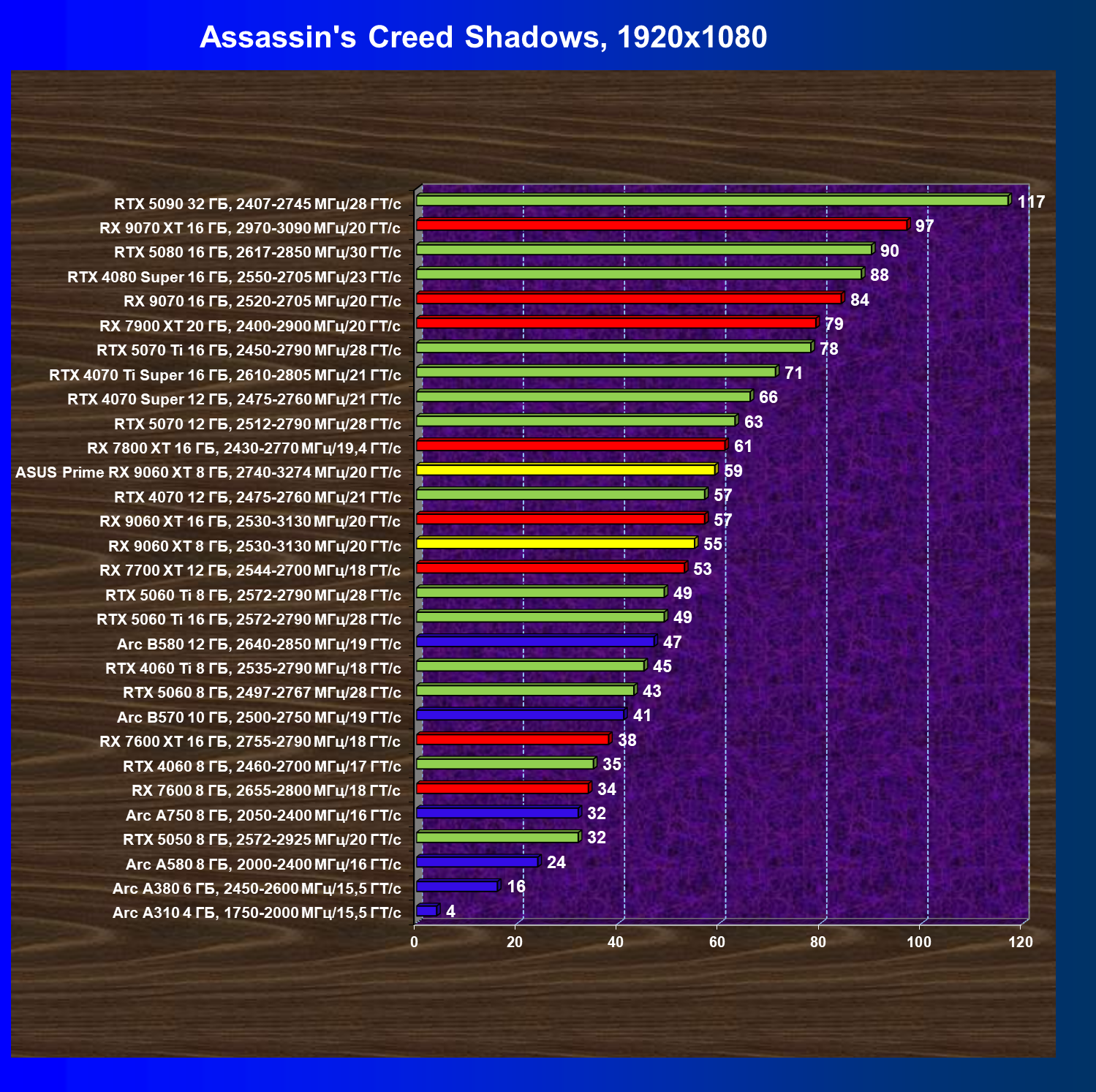 Еще раз отметим, что в классических играх производительность Radeon RX 9060 XT (с 8 и 16 ГБ памяти) позволяет получить высокий уровень комфорта в играх на максимальных настройках качества в разрешении 1080p (Full HD), во многих играх с Radeon RX 9060 XT (16 ГБ) можно хорошо поиграть и в разрешении 1440p (2.5K), но вариант с 8 ГБ в этом плане несколько хуже, с ним лучше ограничиться разрешением 1080p. Использование трассировки лучей надо обязательно сочетать с технологиями динамического масштабирования, и в таком случае можно получить высокую играбельность в 1080p, а в ряде случаев и в 1440p.