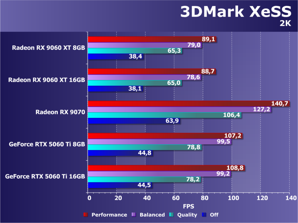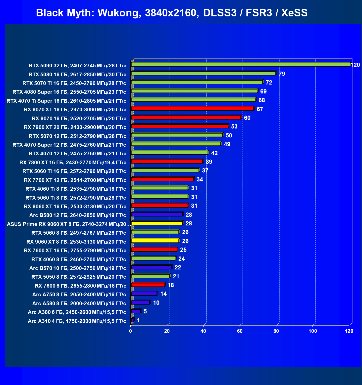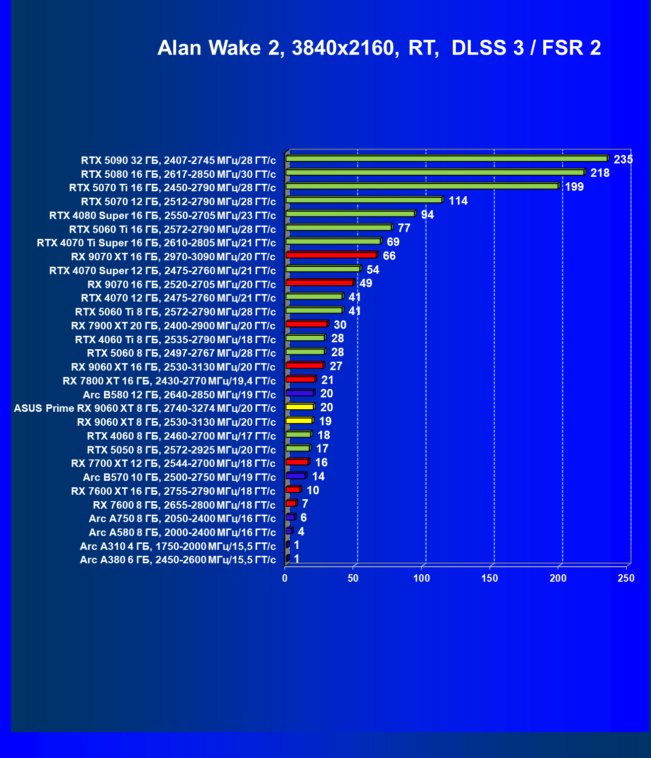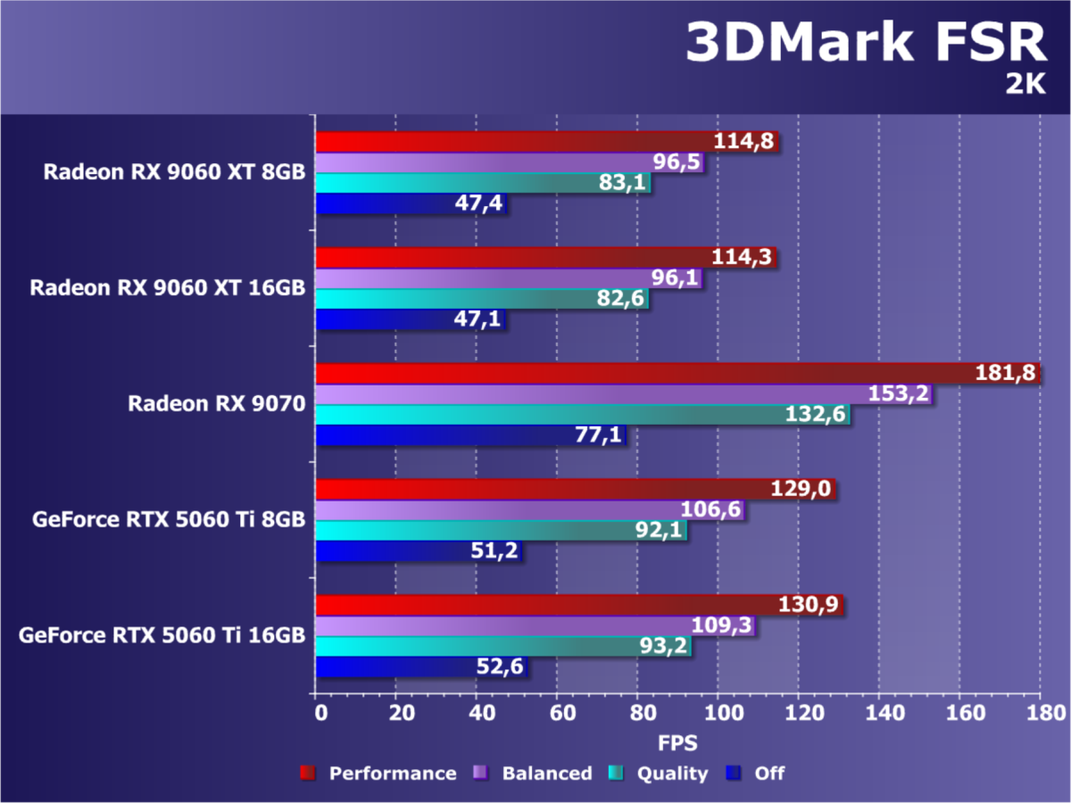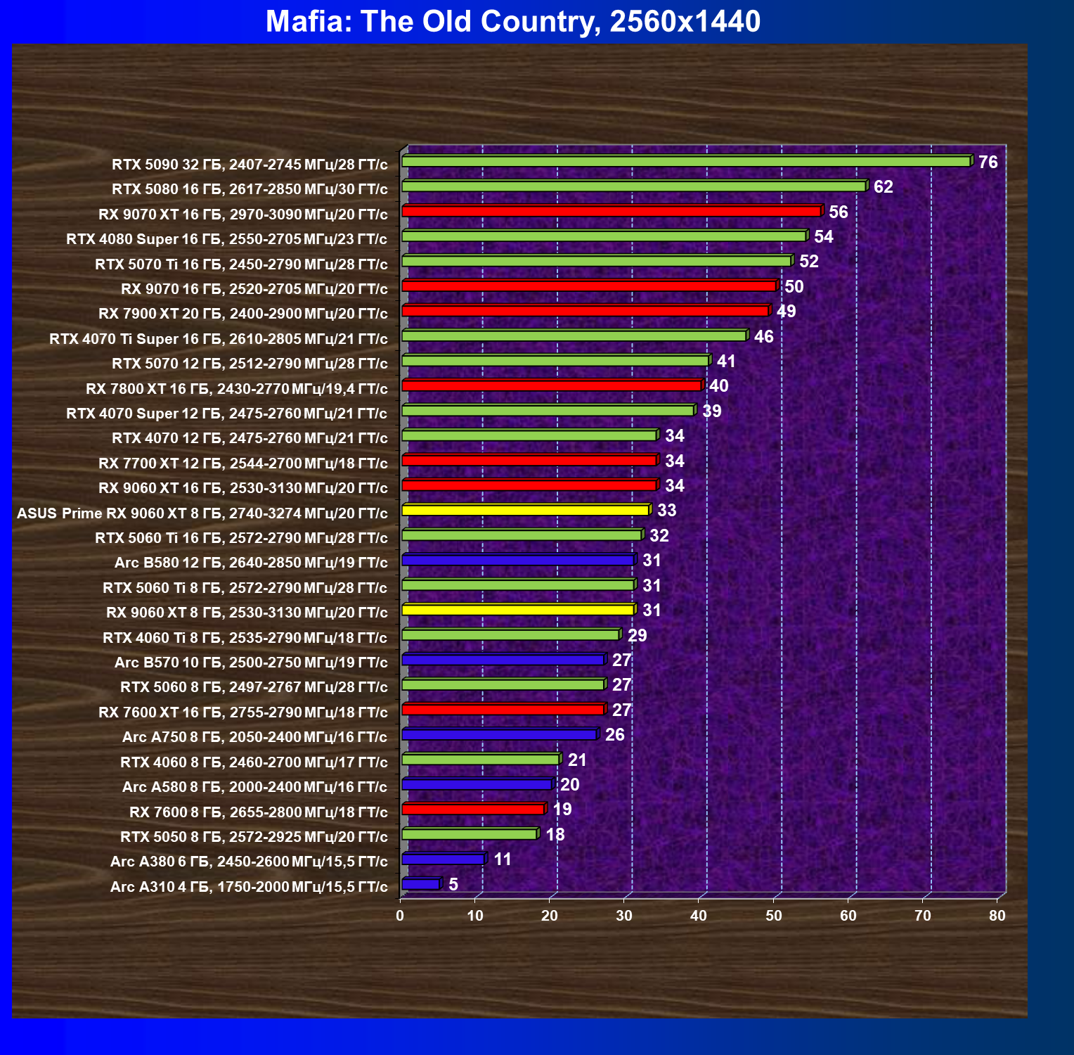 Еще раз отметим, что в классических играх производительность Radeon RX 9060 XT (с 8 и 16 ГБ памяти) позволяет получить высокий уровень комфорта в играх на максимальных настройках качества в разрешении 1080p (Full HD), во многих играх с Radeon RX 9060 XT (16 ГБ) можно хорошо поиграть и в разрешении 1440p (2.5K), но вариант с 8 ГБ в этом плане несколько хуже, с ним лучше ограничиться разрешением 1080p. Использование трассировки лучей надо обязательно сочетать с технологиями динамического масштабирования, и в таком случае можно получить высокую играбельность в 1080p, а в ряде случаев и в 1440p.