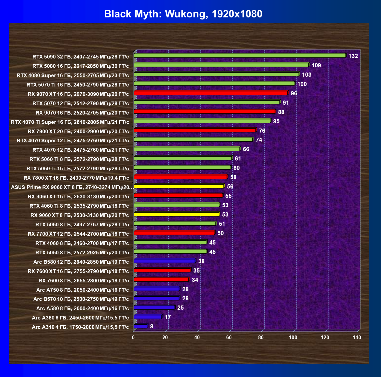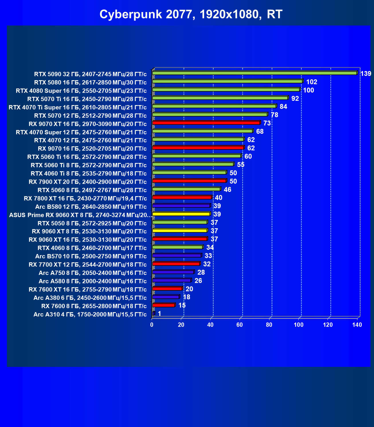 В классических играх (если вынести Arc B580 за скобки, как сильно более дешевый продукт) текущие цены вынесли RX 9060 XT с 8 ГБ в лидеры (даже чуть более дорогая карта Asus оказалась выше референс-аналога). Если кому безразличны игры с новомодными трассировкой лучей и техниками апскейлинга, то для 1080p карты Radeon RX 9060 XT (8 ГБ) — прекрасный выбор.