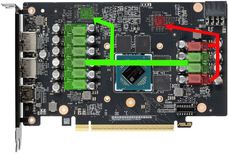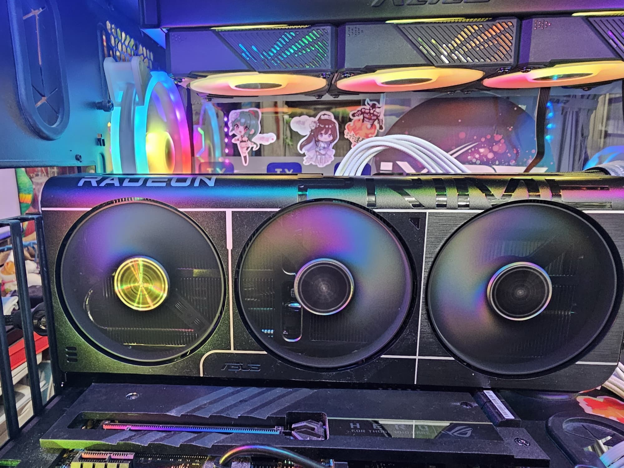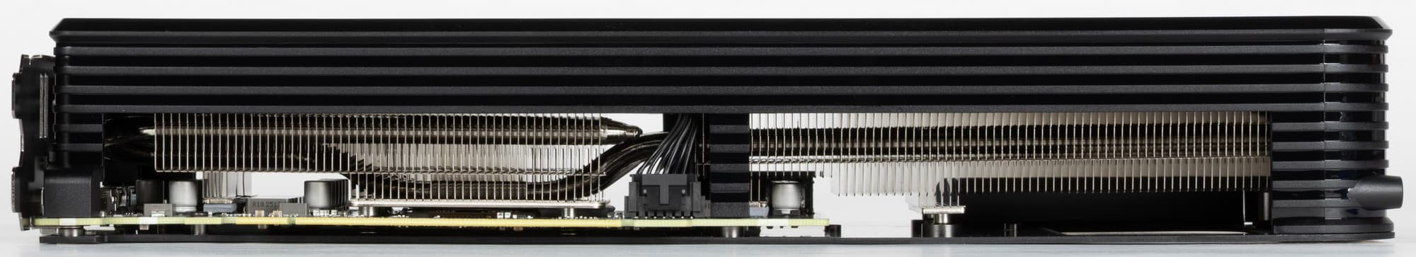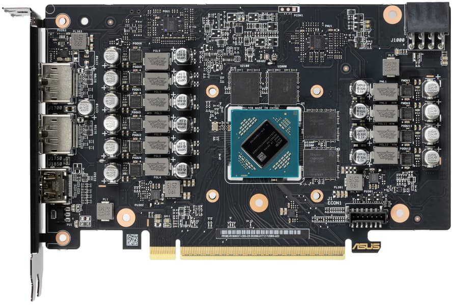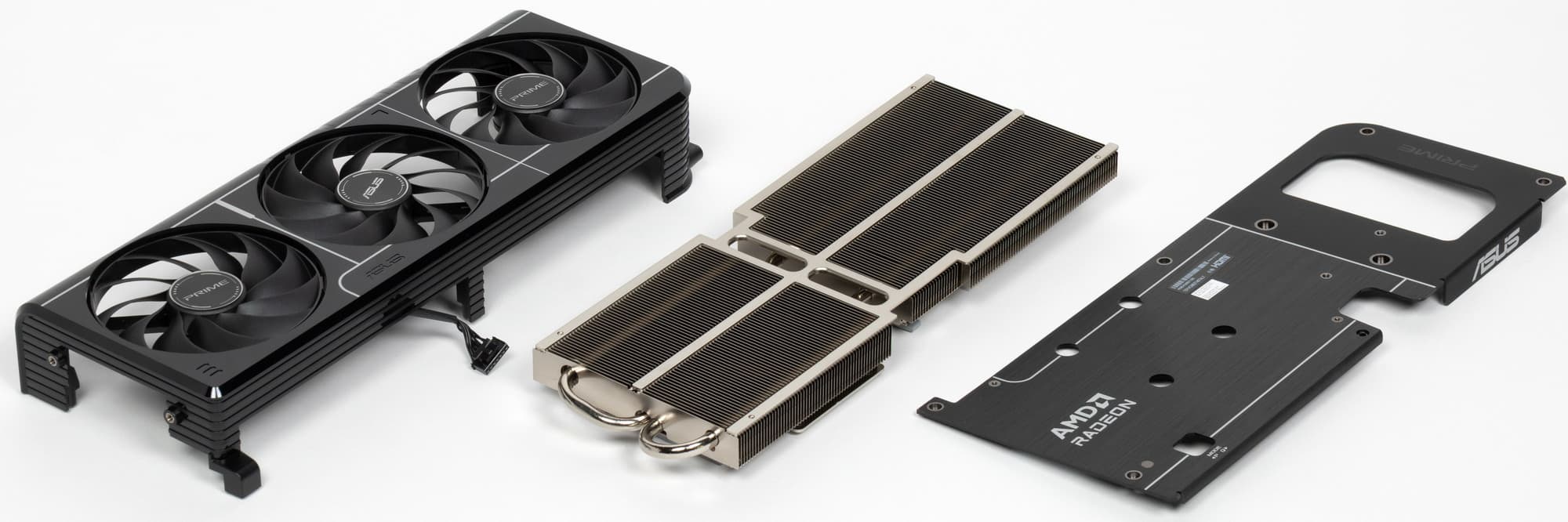 Конкретная протестированная карта Asus Prime Radeon RX 9060 XT OC (8 ГБ) имеет адекватные для решений такого уровня размеры 30×13 см, но занимает 3 слота в системном блоке, потому что использует габаритную и избыточную по производительности систему охлаждения: она удерживает нагрев на невысоком уровне, даже работая практически бесшумно в режиме BIOS Q Mode. Карта может потреблять до 175 Вт и имеет один 8-контактный разъем питания. У нее 3 видеовыхода: 1 HDMI 2.1b и 2 DisplayPort 2.1b — последний обеспечивает пропускную способность до 80 Гбит/с в режиме передачи UHBR 20 и позволяет подключить 8K-дисплей с частотой обновления 60 Гц по одному кабелю.