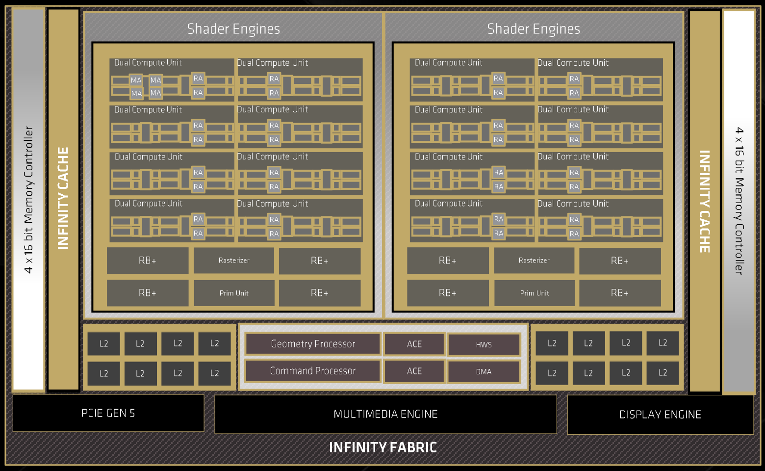 Хотя архитектура RDNA 4 — это в очередной раз измененная и доработанная архитектура компании, известная нам несколько поколений, в ней было сделано больше модификаций, чем в предыдущих обновлениях. По общему строению решения RDNA 4 в виде Navi 44 и Navi 48 не сильно отличаются от RDNA 3, чипы состоят из нескольких шейдерных движков Shader Engine, в каждом из них есть по восемь процессоров, содержащих по два вычислительных блока Compute Unit (CU). Полная версия Navi 44 состоит из пары шейдерных движков, содержащих 32 укрупненных вычислительных блоков Compute Unit (CU), которые состоят в целом из 2048 потоковых процессоров, 64 ИИ-ускорителей, 32 RT-ускорителей, 128 блоков TMU и 64 блоков ROP.