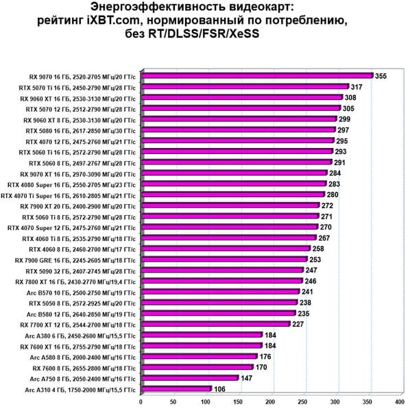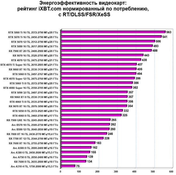Если посмотреть на энергоэффективность, то в классических играх Radeon RX 9060 XT (8 ГБ) оказался на пятом месте. Однако в играх с RT/DLSS/FSR/XeSS из-за более высокой производительности у конкурентов Radeon RX 9060 XT (8 ГБ) находится в середине списка.