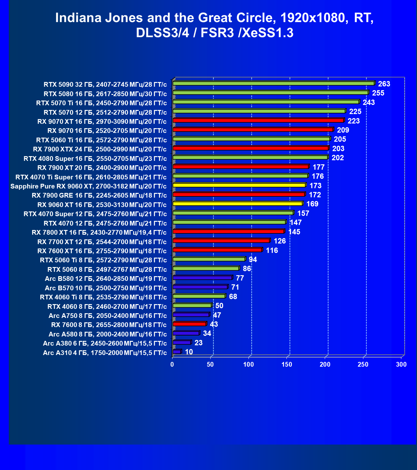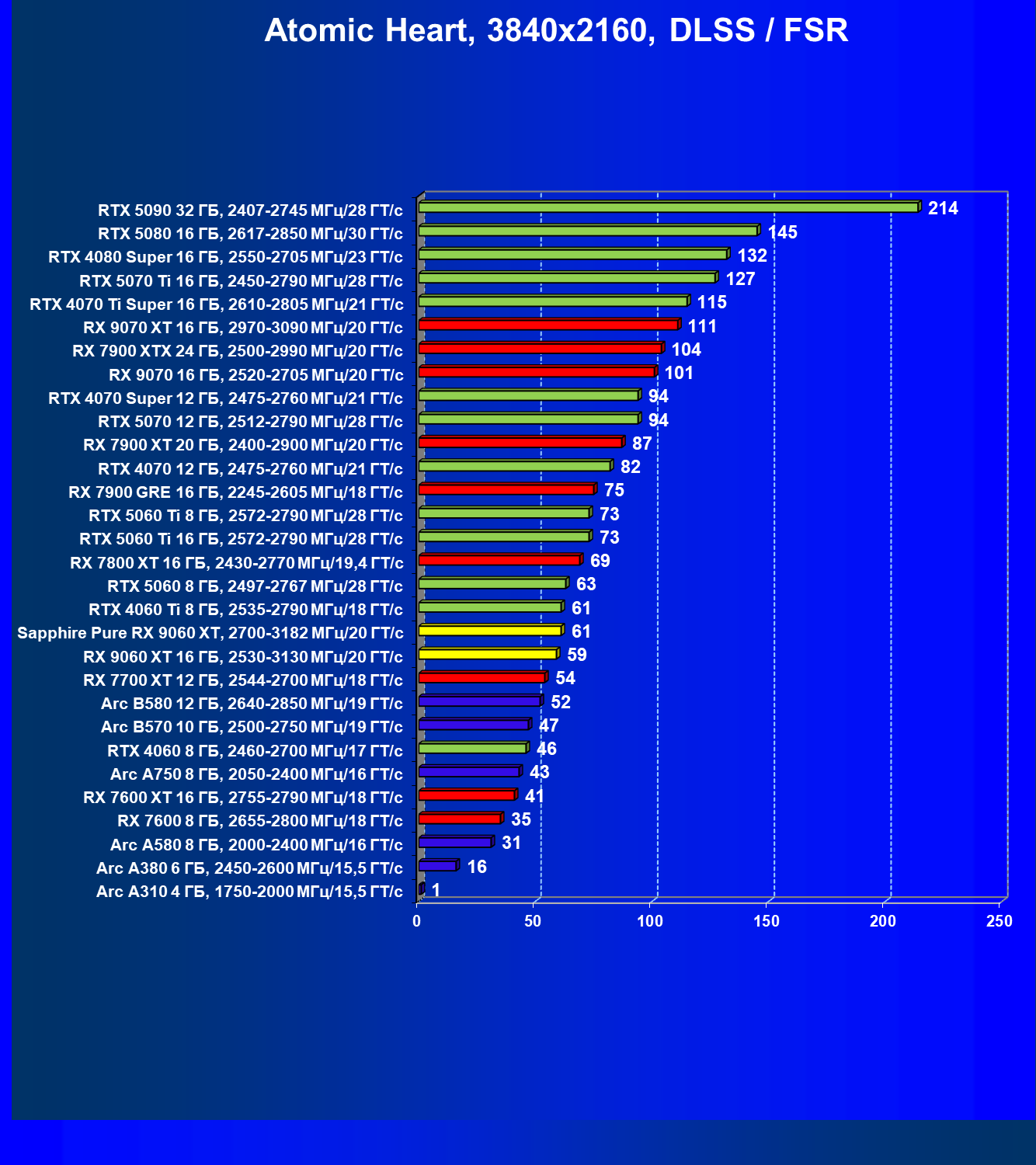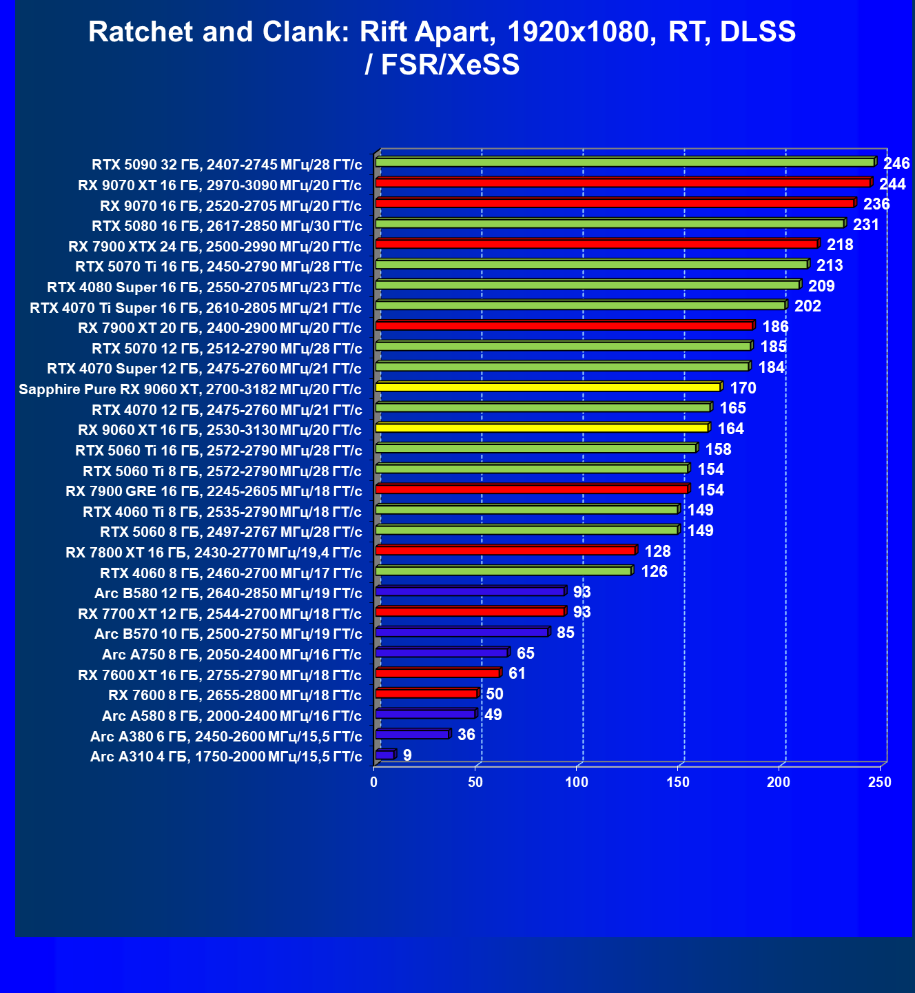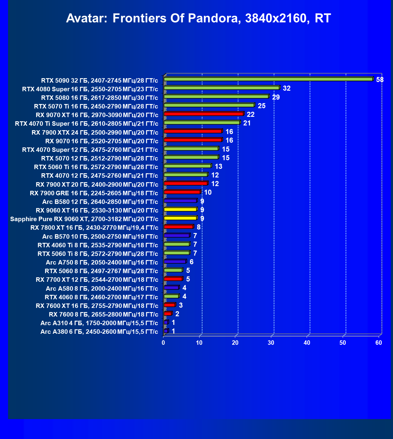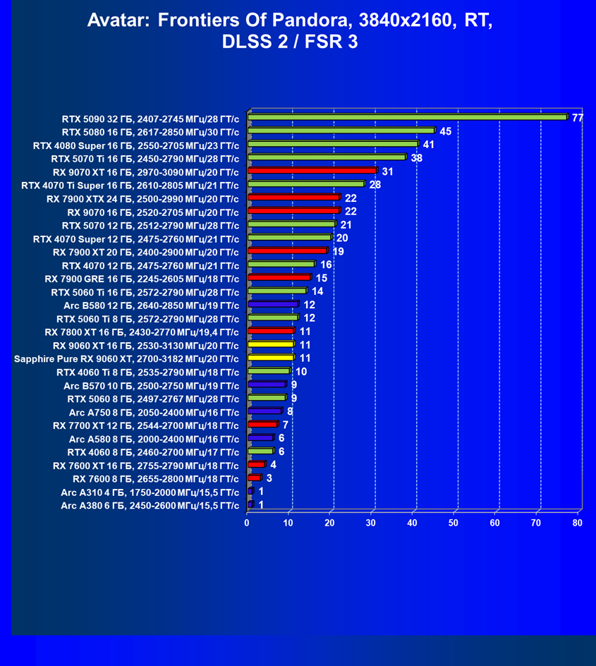 | 08 | Sapphire Pure RX 9060 XT, 2700—3182 МГц/20 ГТ/с | 312 | 1341 | 43 000 |