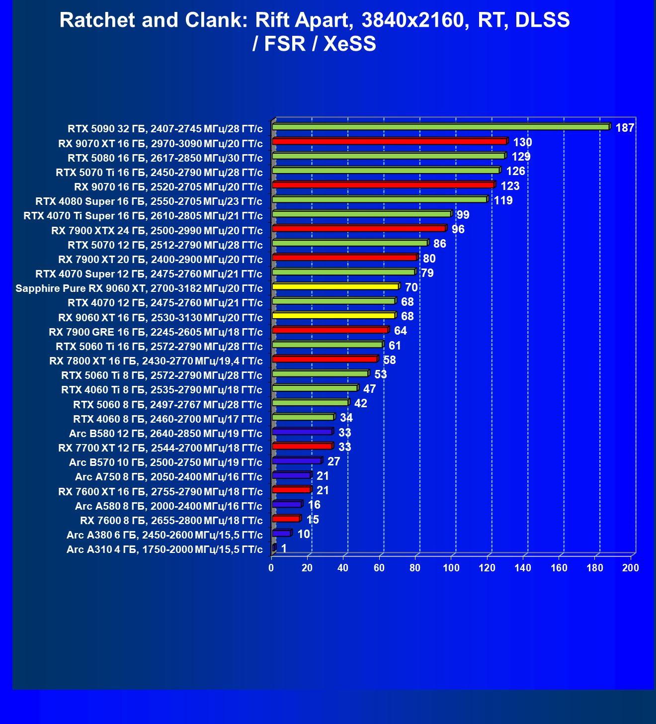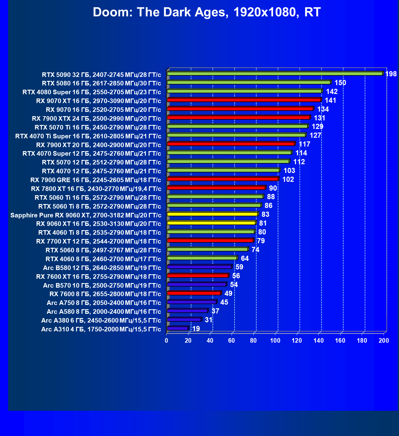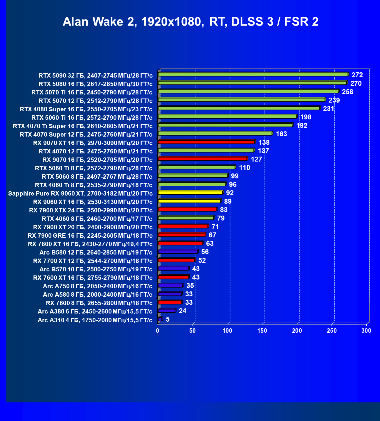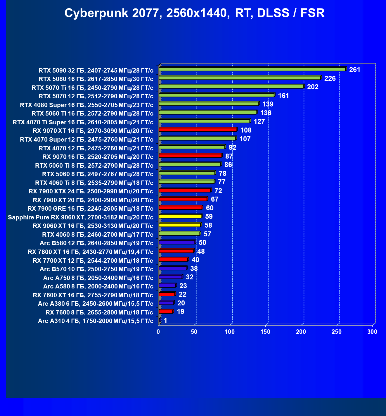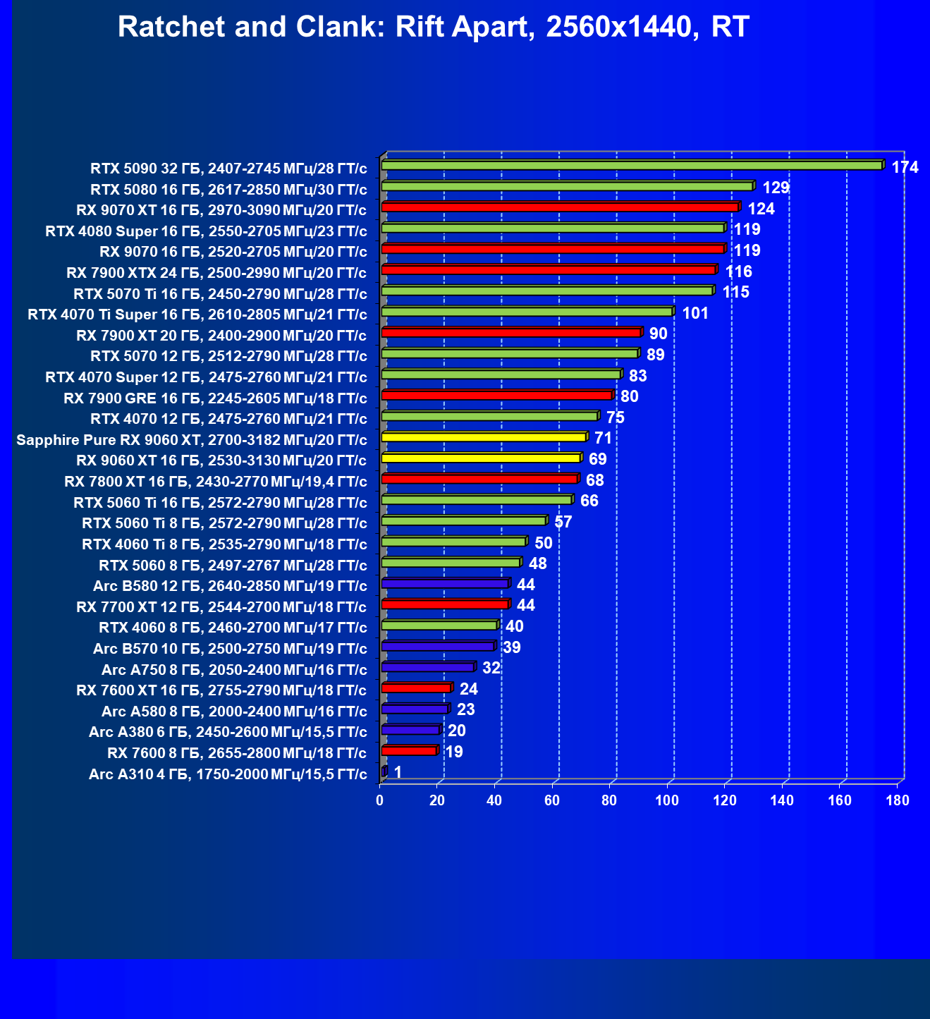 | 08 | Sapphire Pure RX 9060 XT, 2700—3182 МГц/20 ГТ/с | 312 | 1341 | 43 000 |