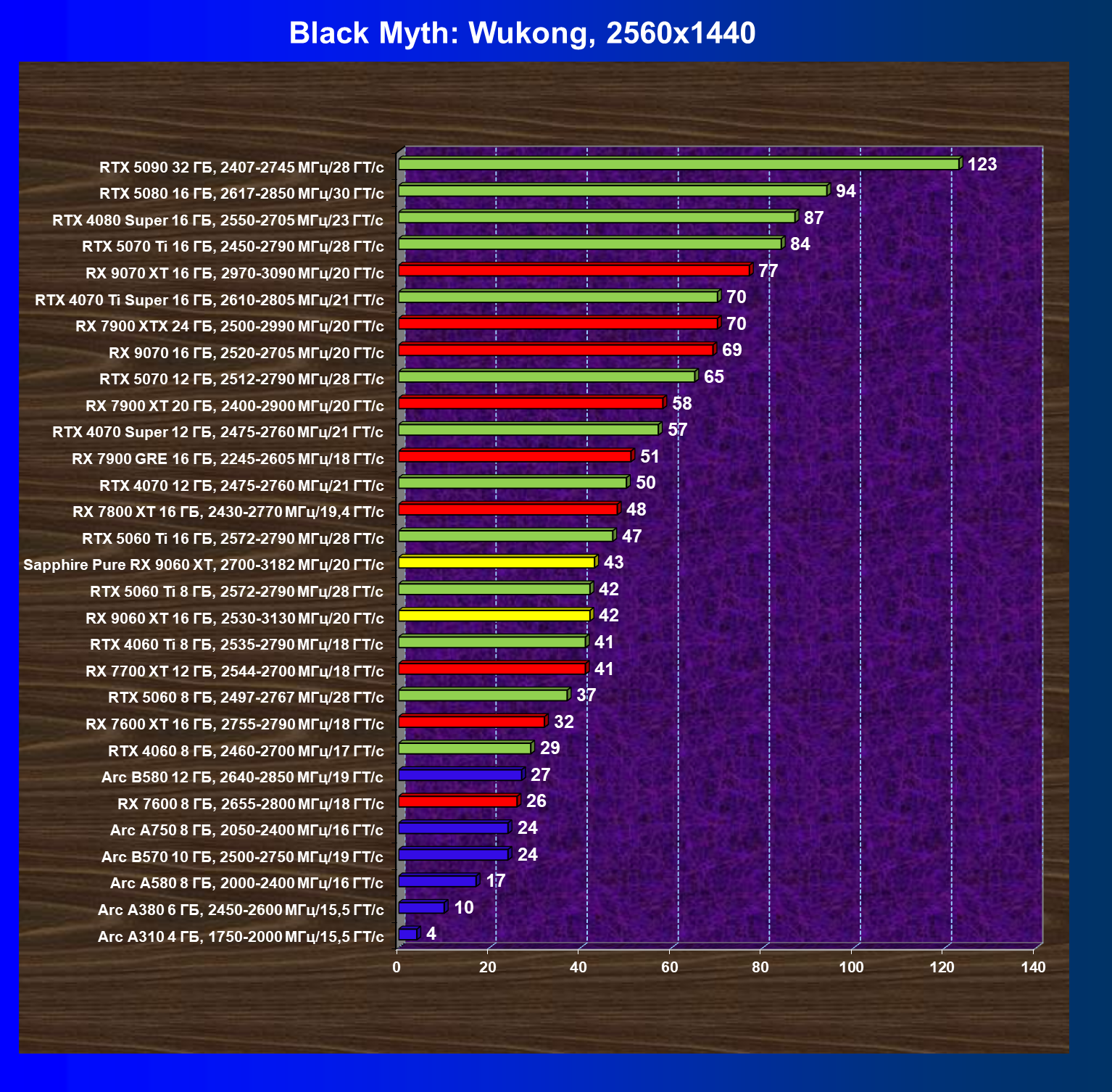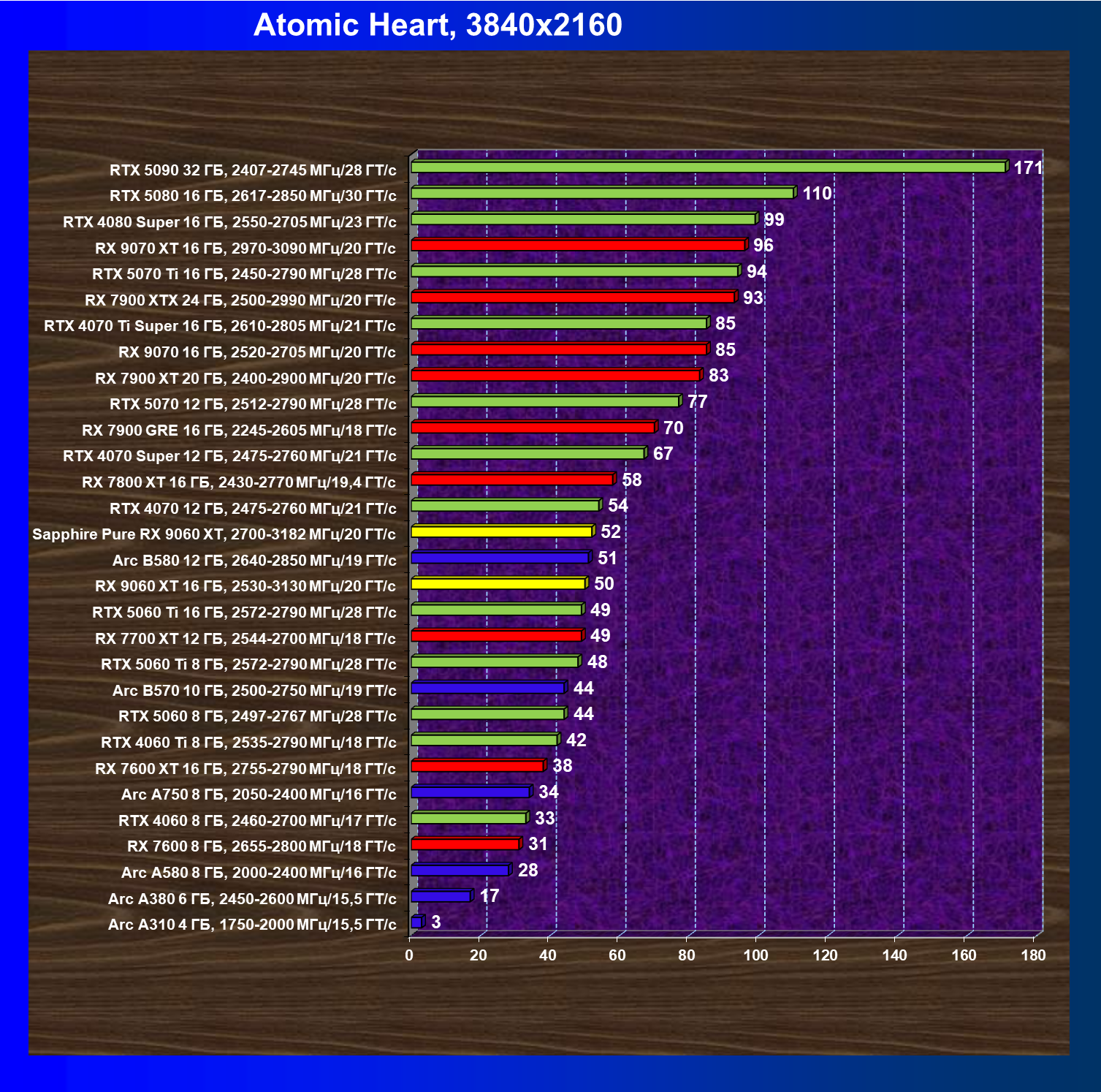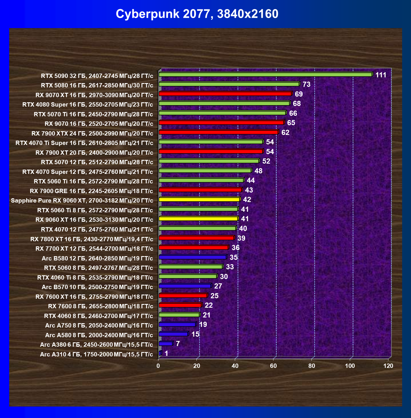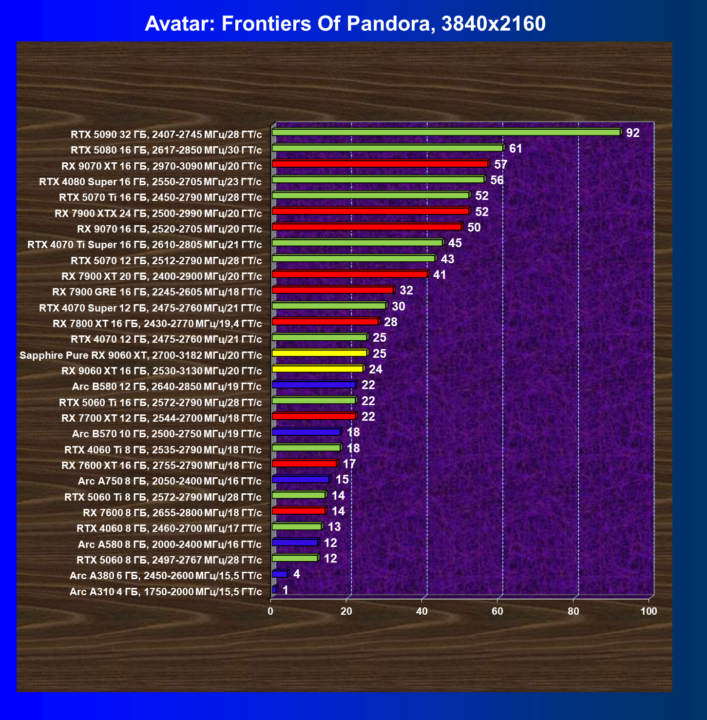 | 08 | Sapphire Pure RX 9060 XT, 2700—3182 МГц/20 ГТ/с | 312 | 1341 | 43 000 |