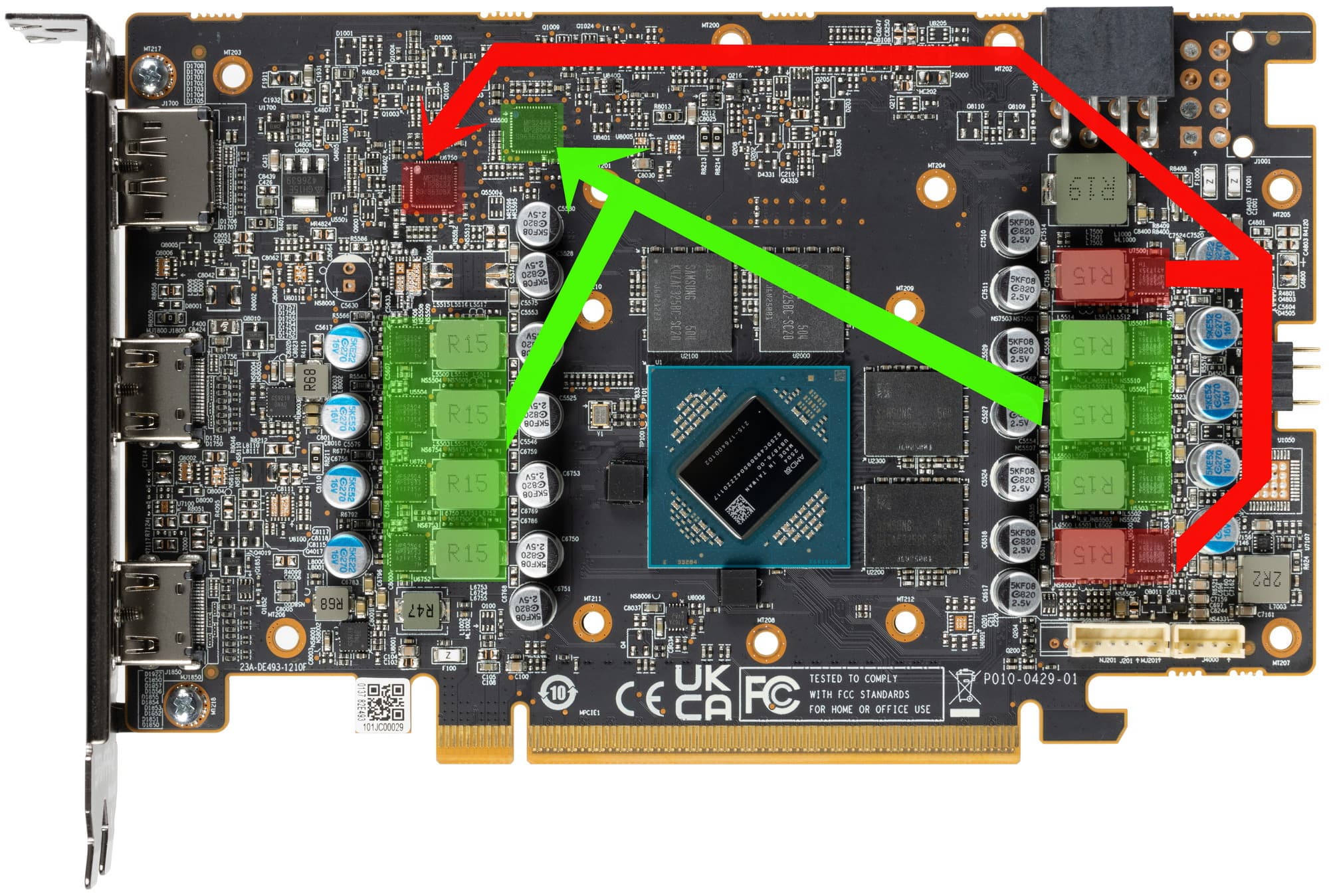 По количеству всех исполнительных блоков, это ровно половина от старшего чипа Navi 48, да и объем кэша Infinity Cache также снижен вдвое — с 64 до 32 МБ. Графический процессор Navi 44 работает на базовой частоте в 1700 МГц, которая может увеличиваться до 2530 МГц в играх и до 3130 МГц в турбо-режиме — это значительно выше, чем у Radeon RX 9070 XT, и является рекордным значением для настольных графических процессоров.