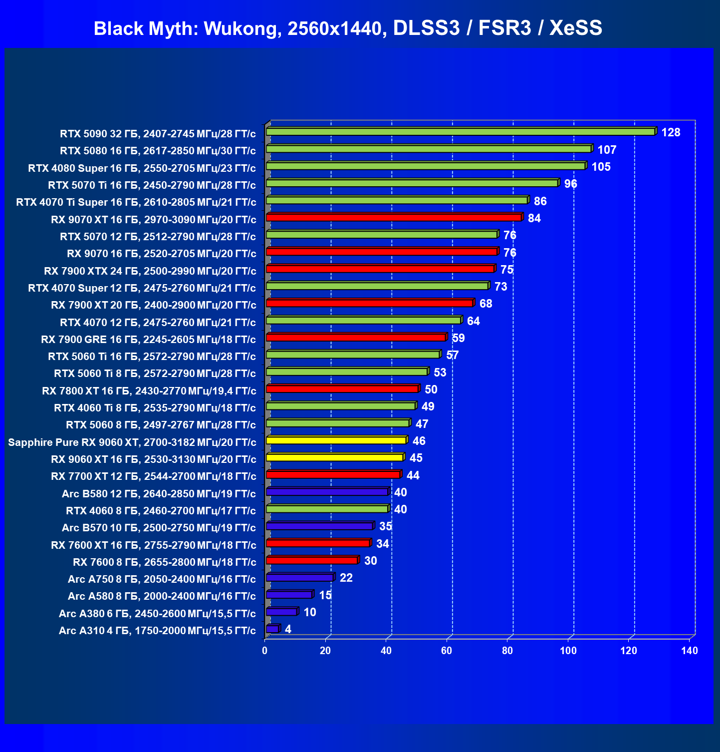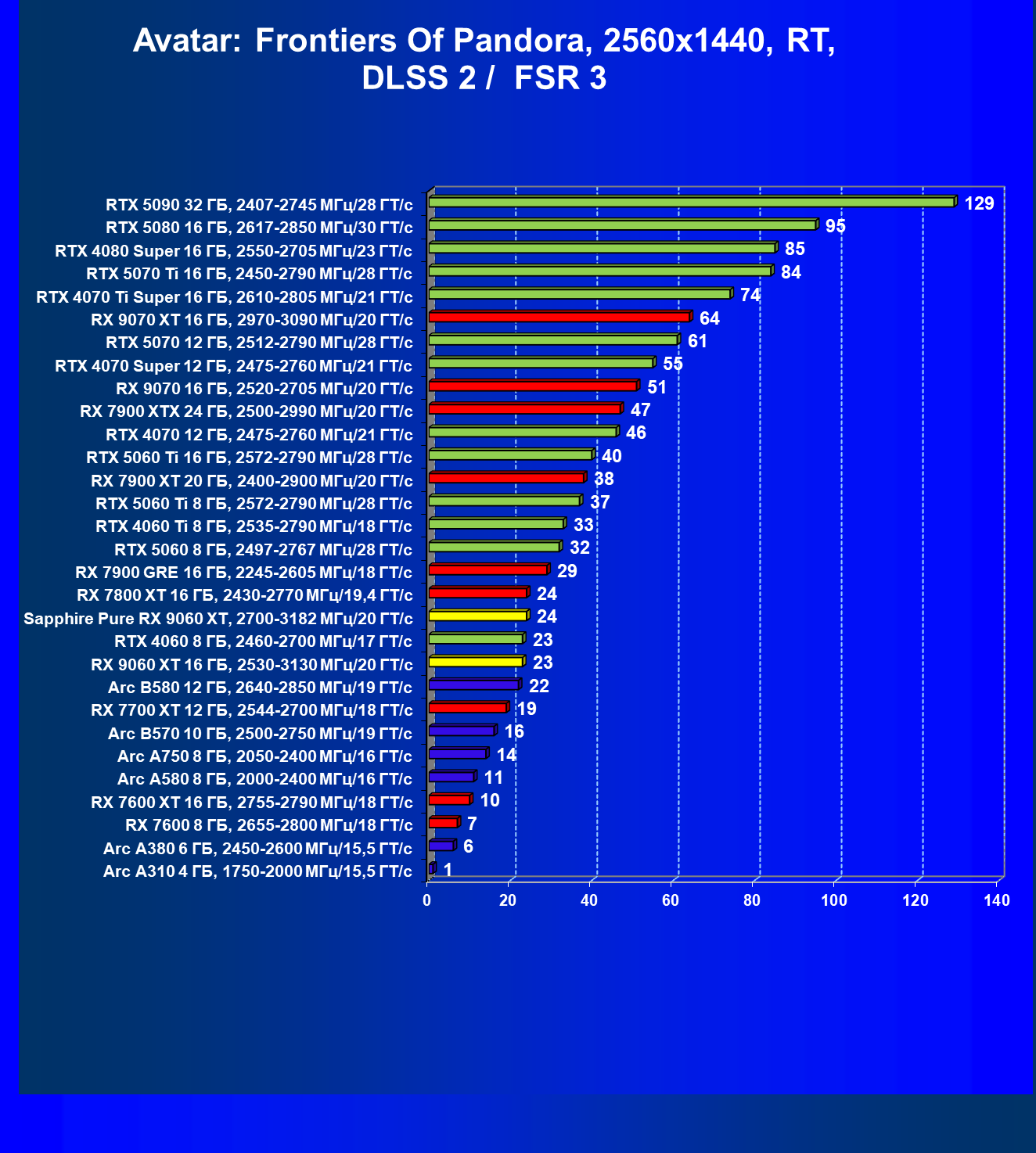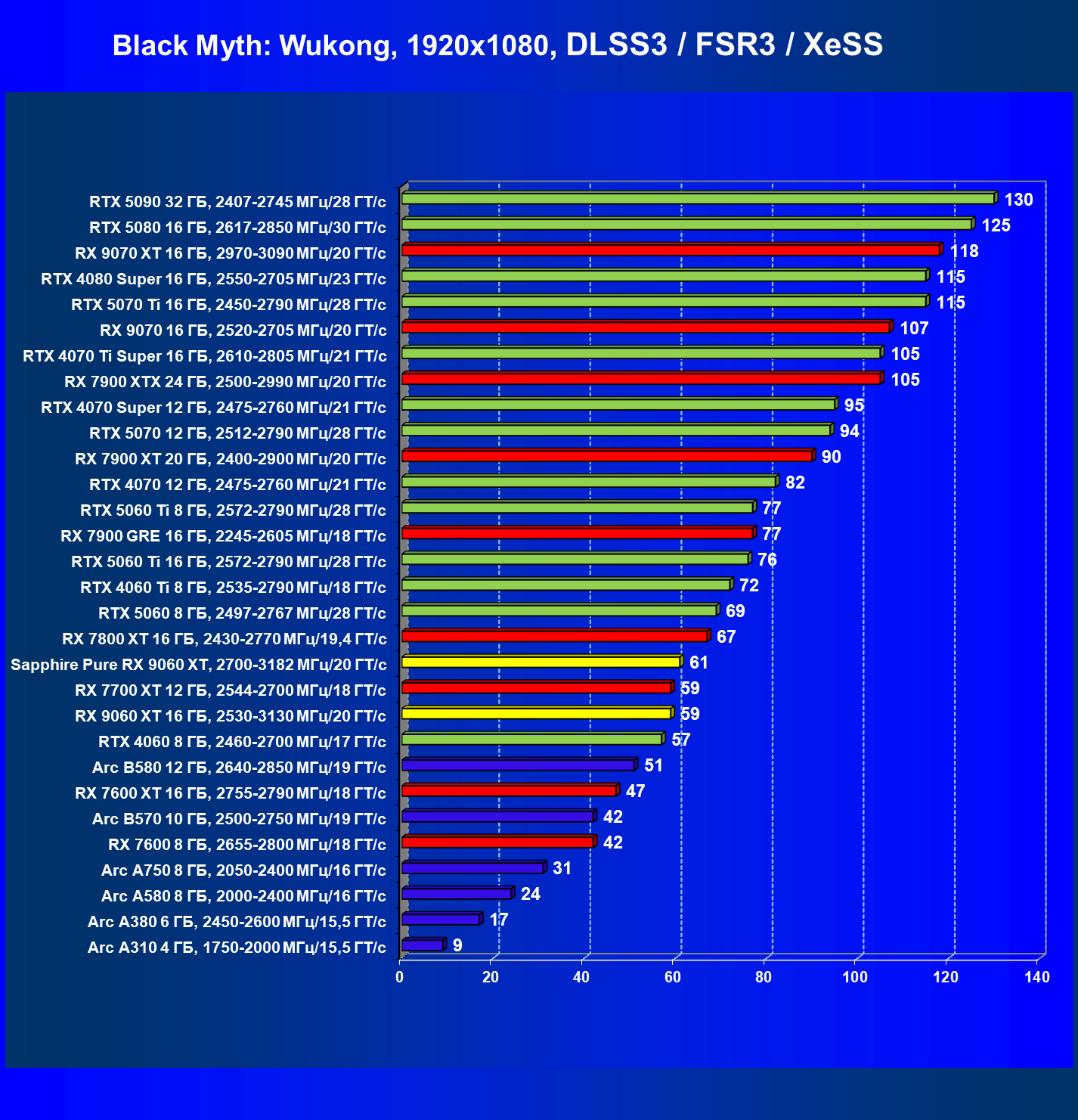 | 16 | RX 9060 XT 16 ГБ, 2530—3130 МГц/20 ГТ/с | 1303 | 310 | 42 000 |