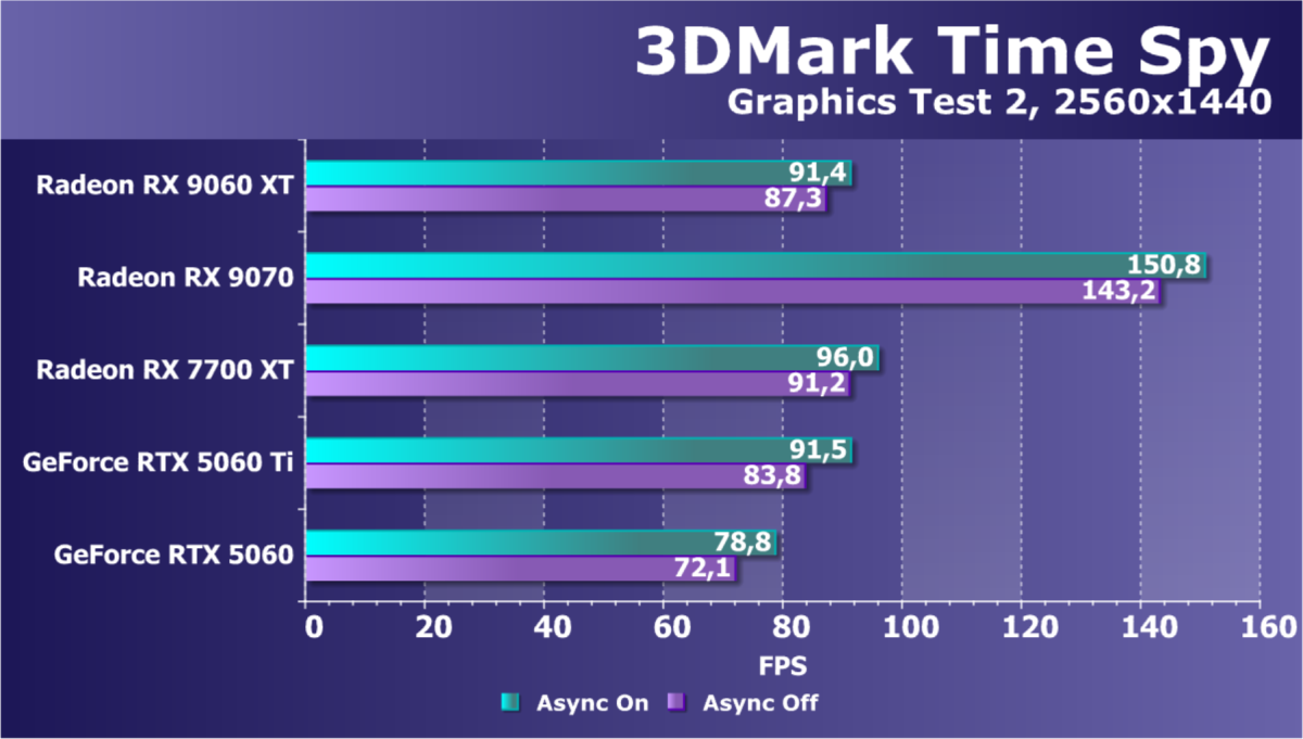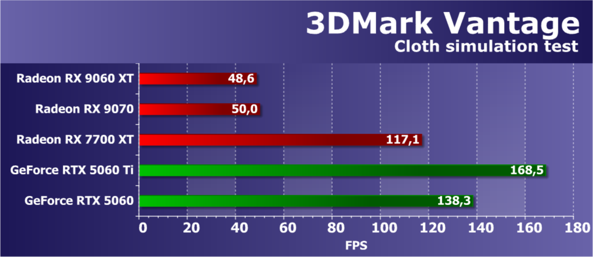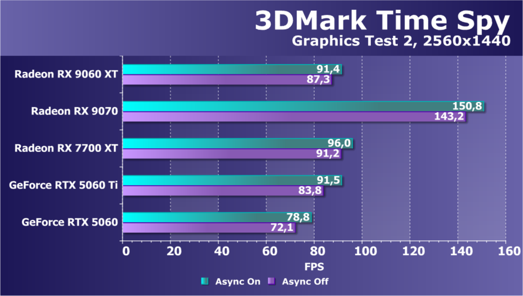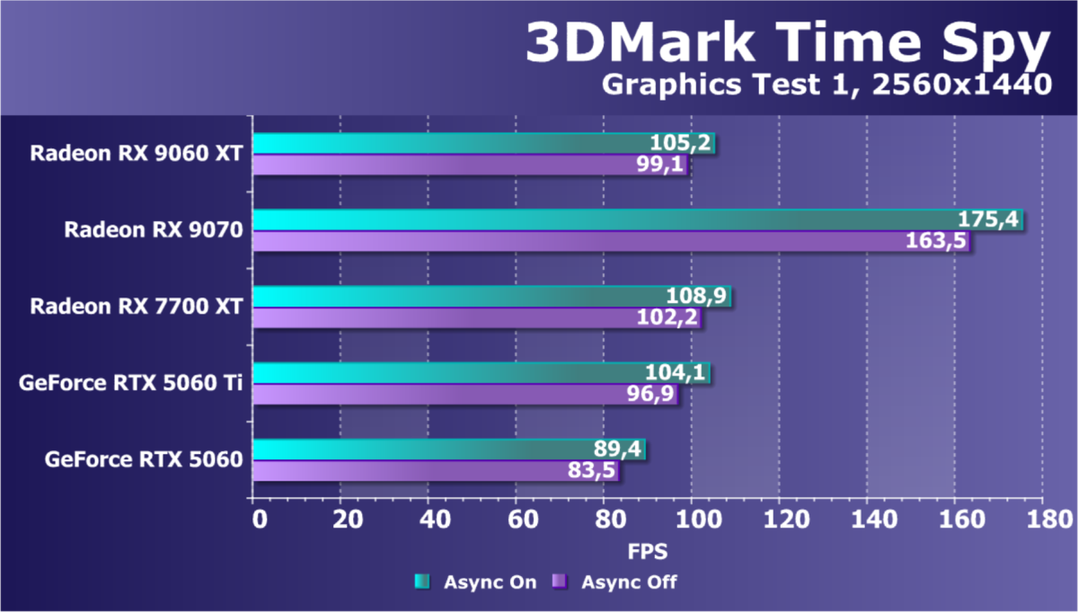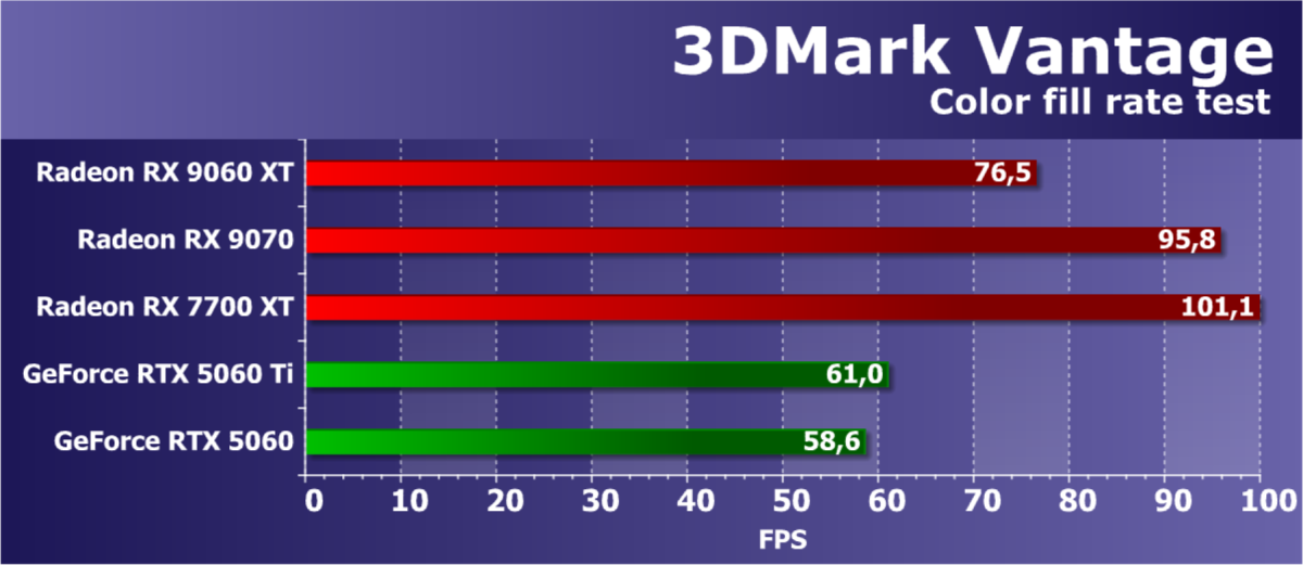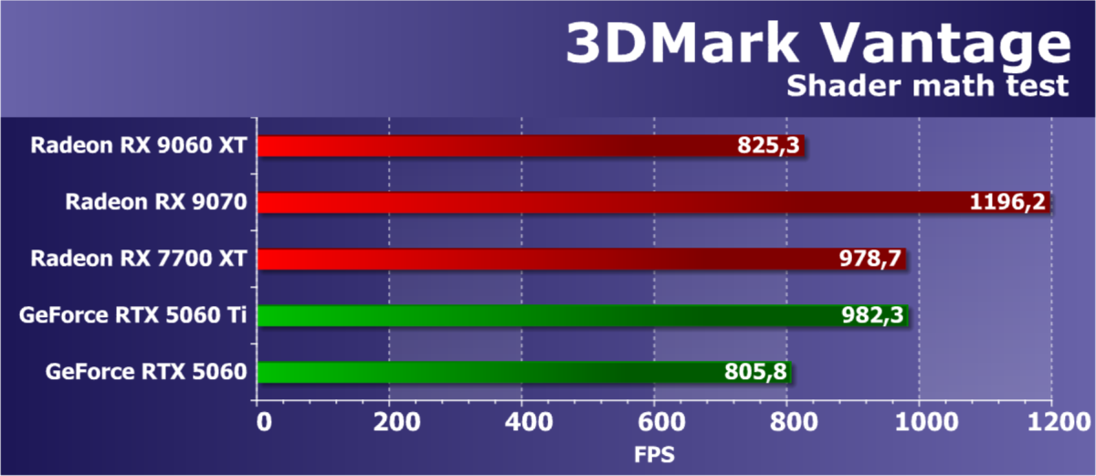 Конкурентов по цене для рассматриваемой сегодня видеокарты у Nvidia мы взяли два, хотя прямого совпадения по ценам у них нет — скорее GeForce RTX 5060 Ti 8 ГБ является самым близким по цене соперником новинки AMD. Но в сравнении по синтетическим тестам, разницы между вариантами с 16 ГБ и 8 ГБ практически нет, так что сравниваем новинку со старшим вариантом Nvidia. Ну и чисто для интереса взяли еще одну GeForce в условные соперники — RTX 5060 стоит заметно дешевле рассматриваемой модификации Radeon, но она конкурирует с вариантом RX 9060 XT 8 ГБ по рекомендованной цене, а разницы по синтетике между 8 и 16 ГБ мало, повторимся. В общем, по сравнению с парой GeForce мы узнаем, насколько сильно RDNA 4 улучшила производительность нового поколения графических процессоров AMD из среднего ценового диапазона.