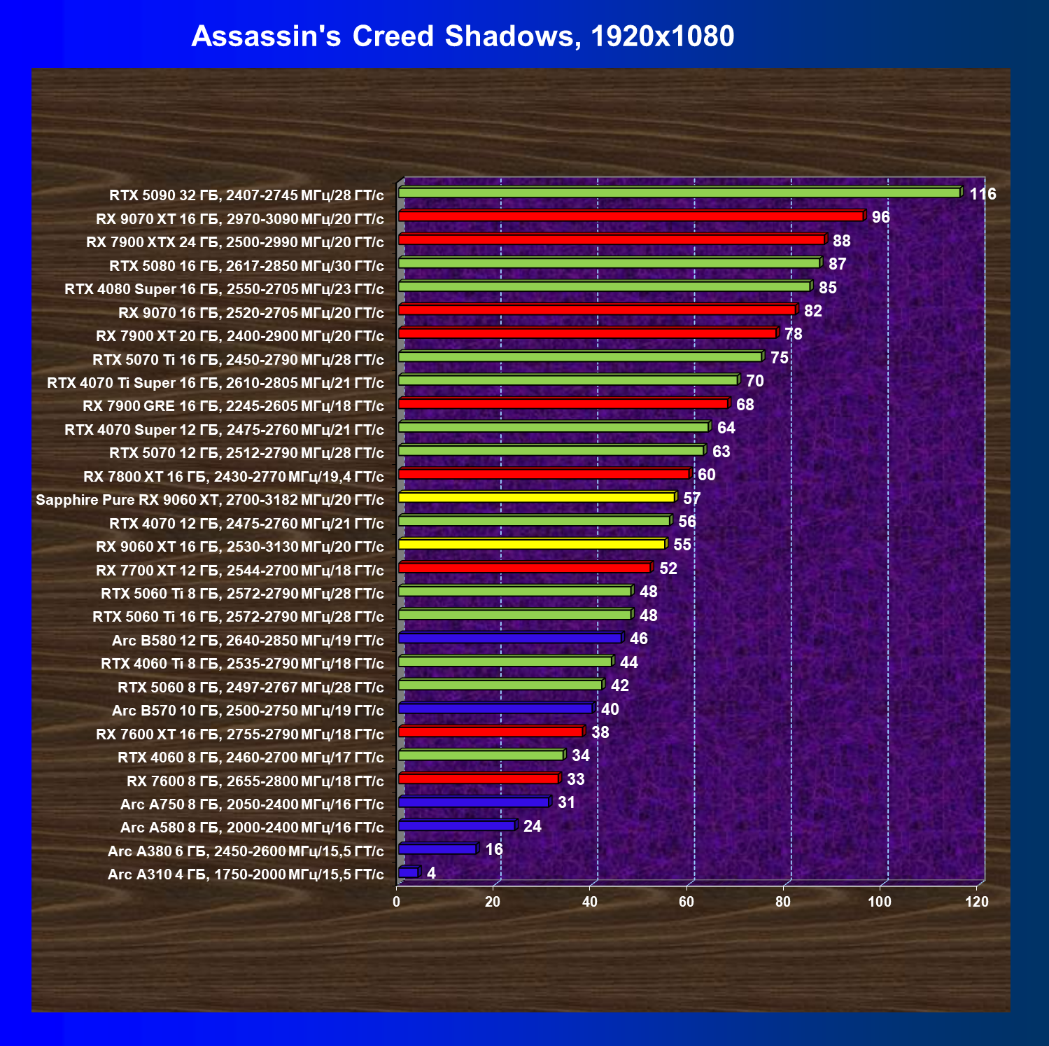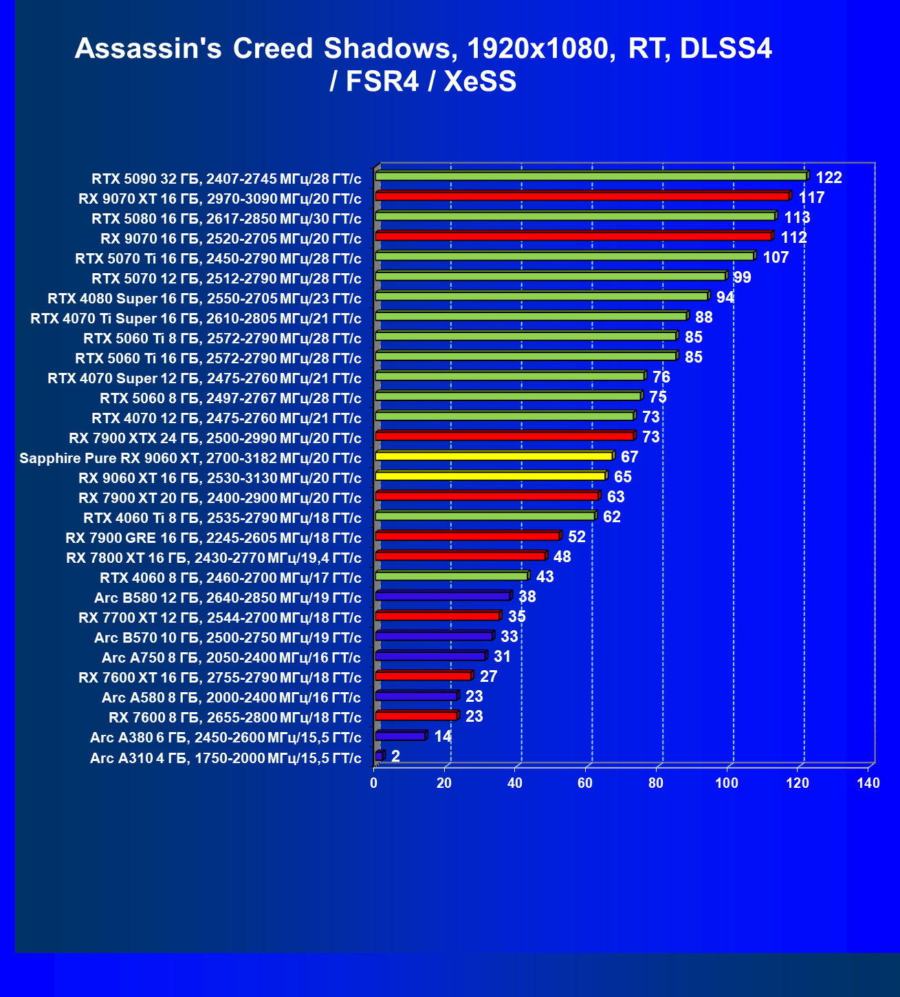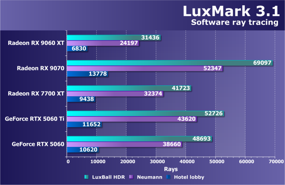 | 09 | RX 9060 XT 16 ГБ, 2530—3130 МГц/20 ГТ/с | 554 | 2328 | 42 000 |