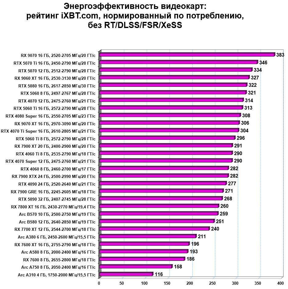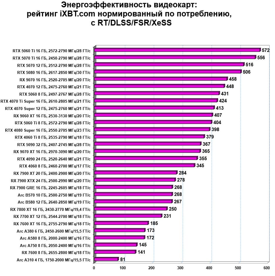 Если посмотреть на энергоэффективность, то в классических играх Radeon RX 9060 XT оказался на четвертом месте. Однако в играх с RT/DLSS/FSR/XeSS из-за более высокой производительности у конкурентов Radeon RX 9060 XT спустился на 10-е место.