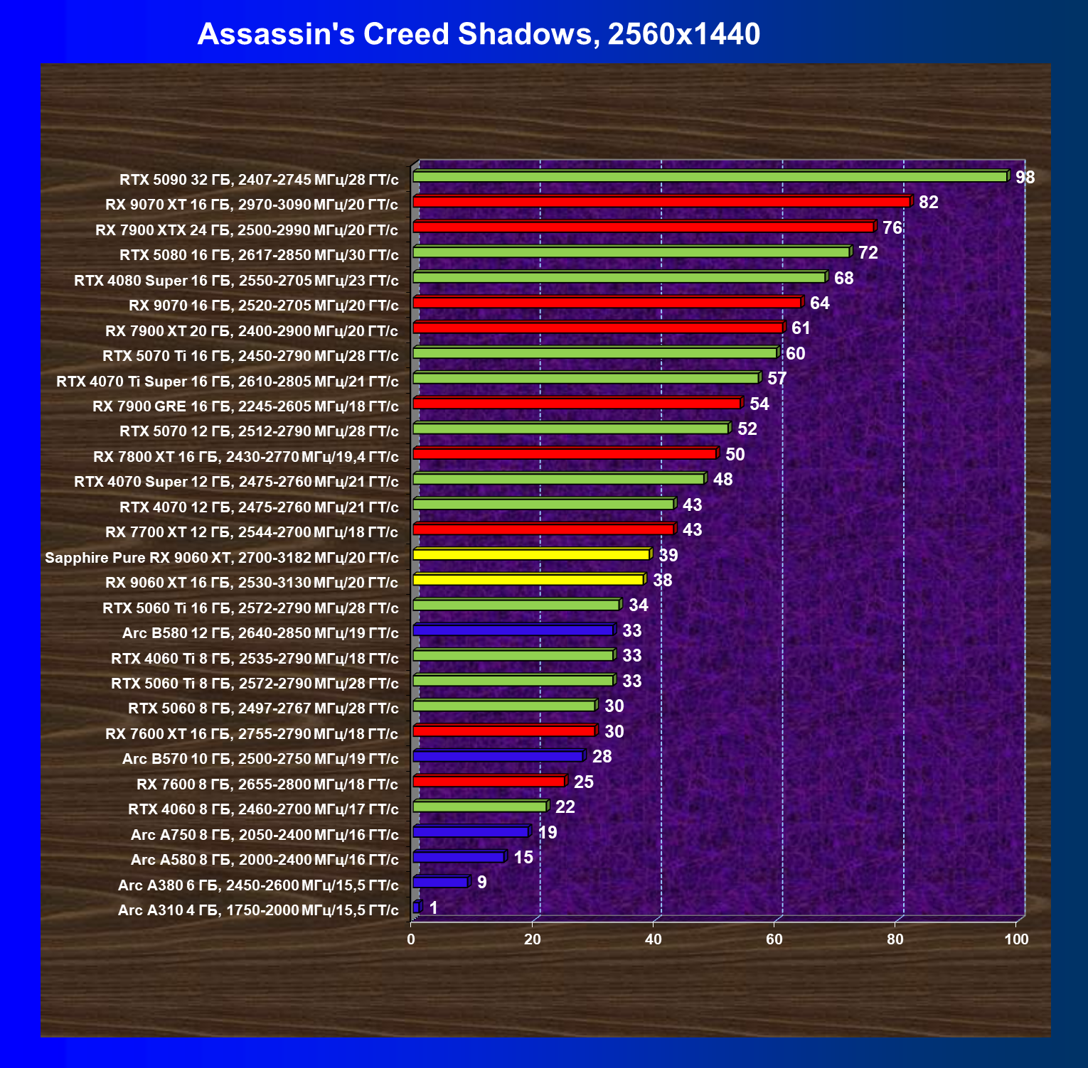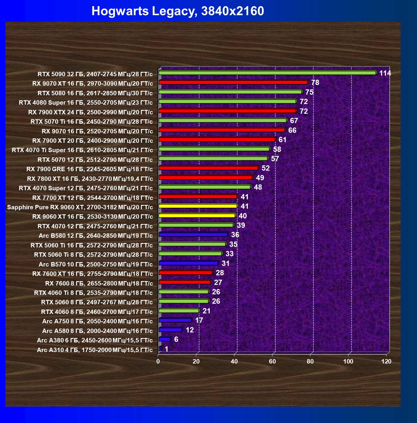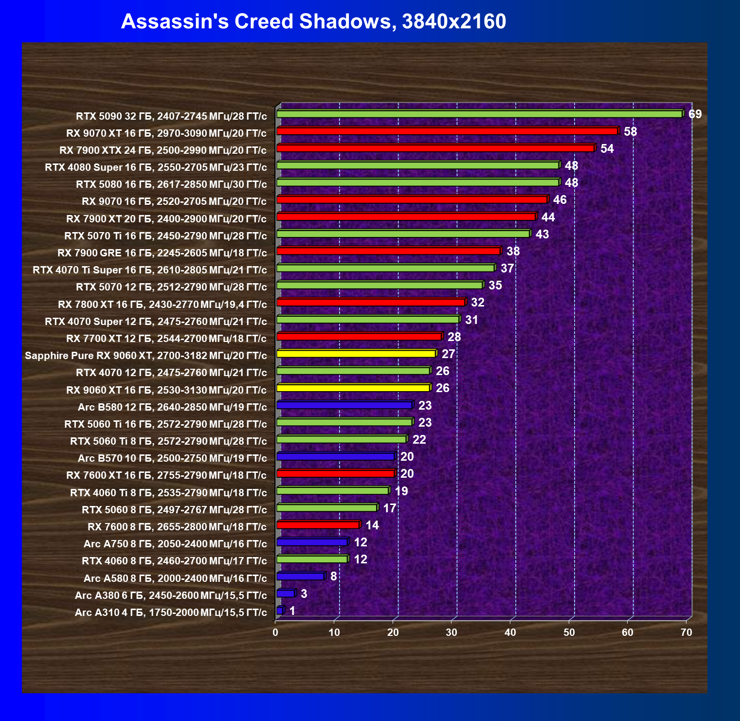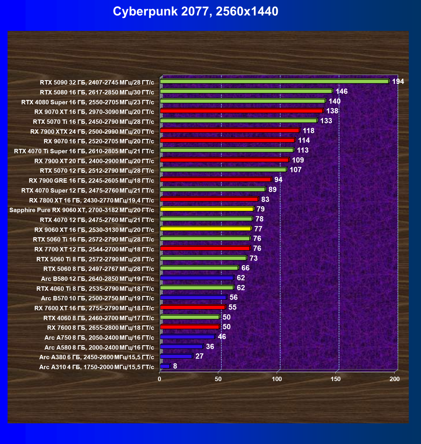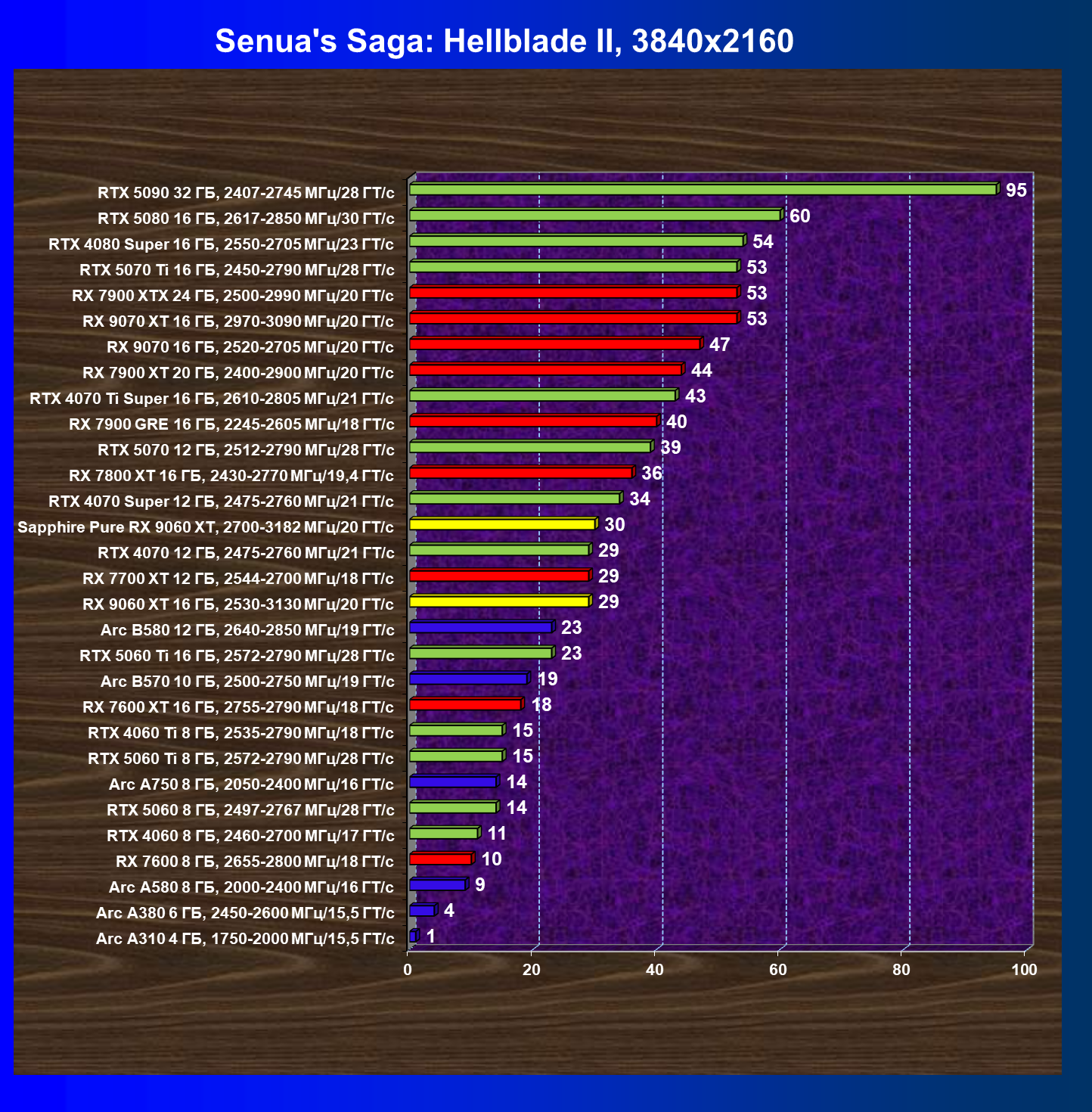 | 14 | Arc B580 12 ГБ, 2640—2850 МГц/19 ГТ/с | 505 | 1616 | 32 000 |