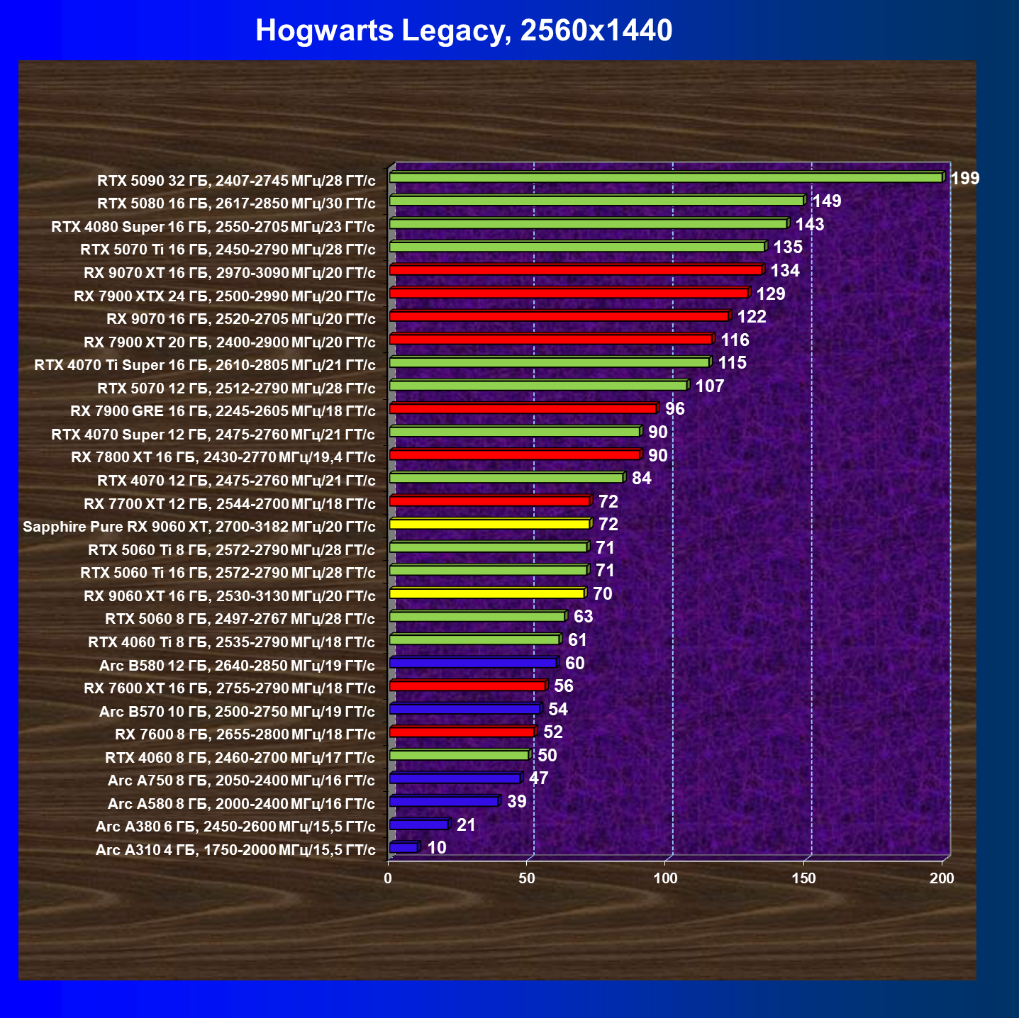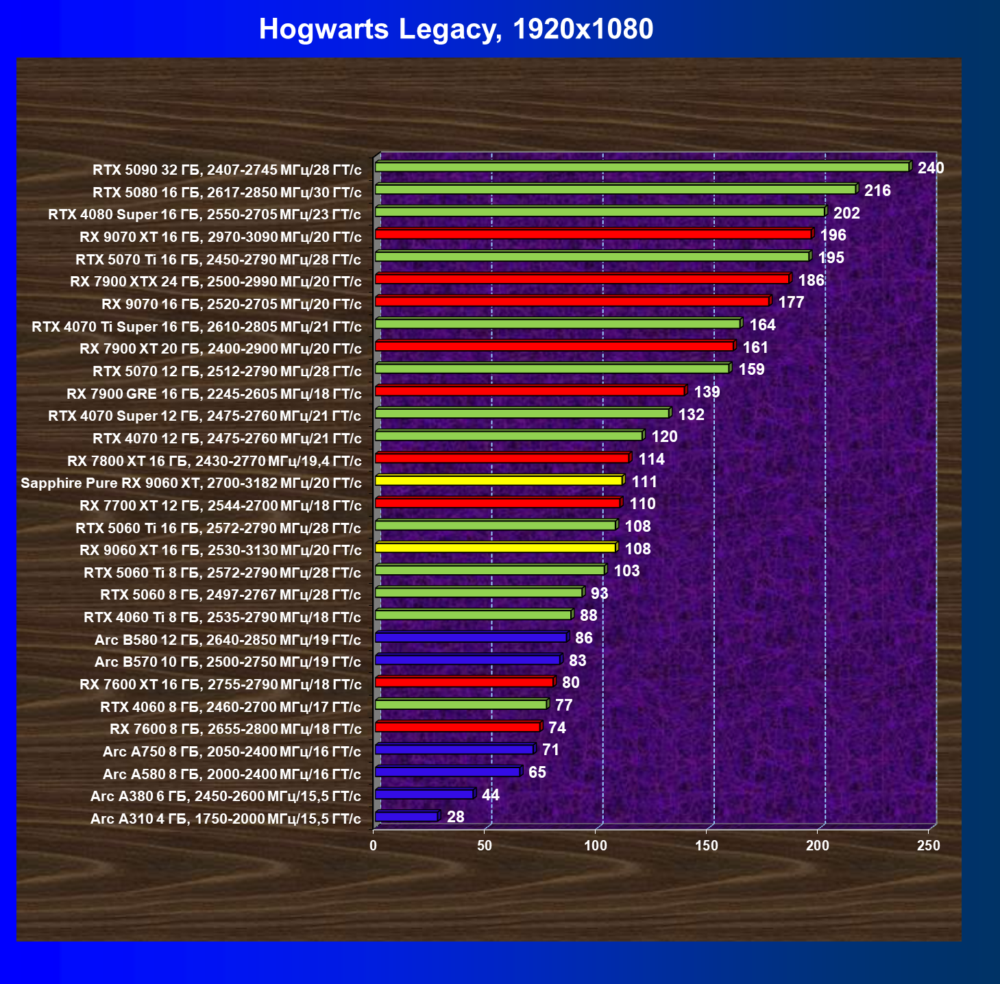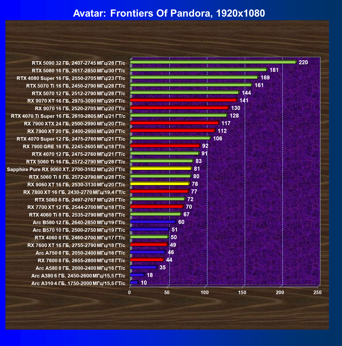 | 10 | RX 9060 XT 16 ГБ, 2530—3130 МГц/20 ГТ/с | 310 | 1303 | 42 000 |