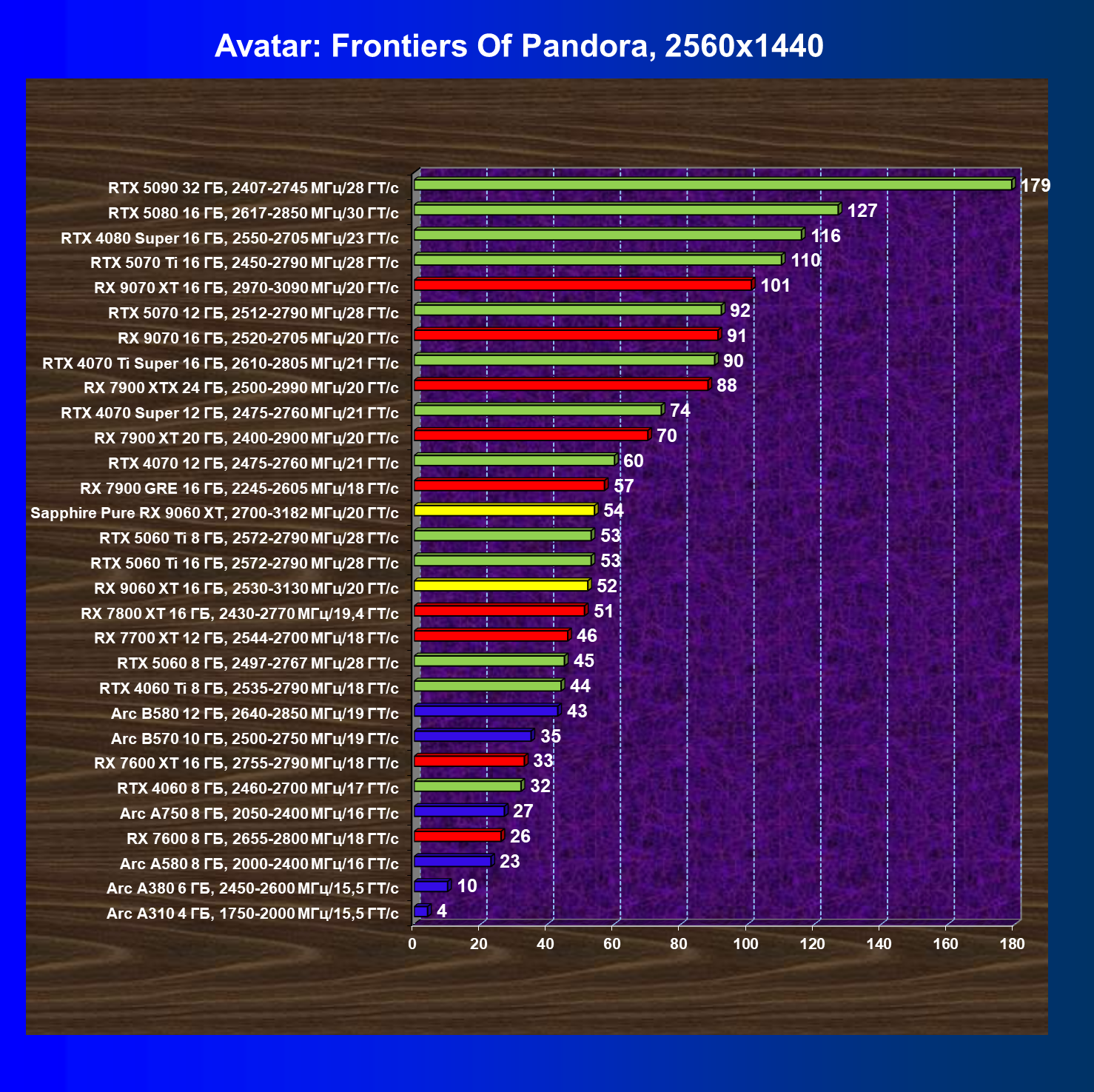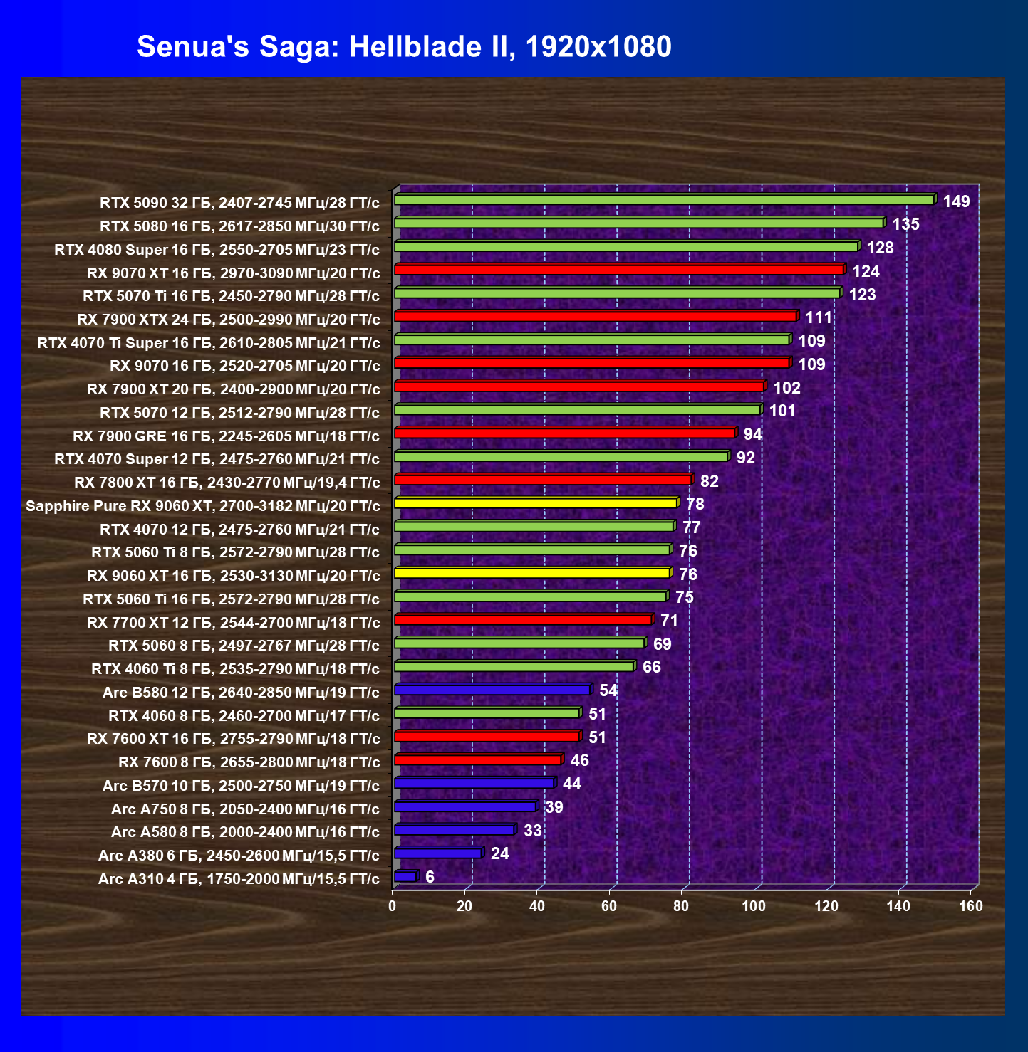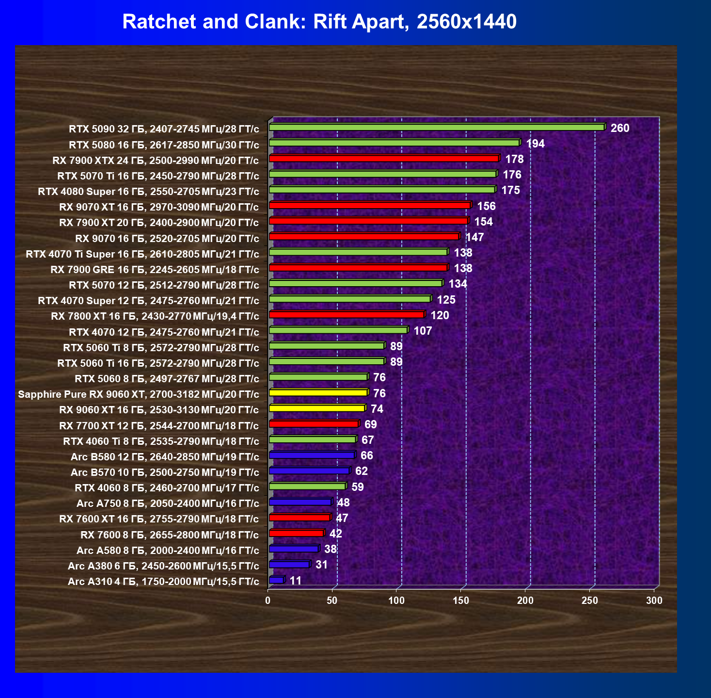 | 10 | RX 9060 XT 16 ГБ, 2530—3130 МГц/20 ГТ/с | 310 | 1303 | 42 000 |