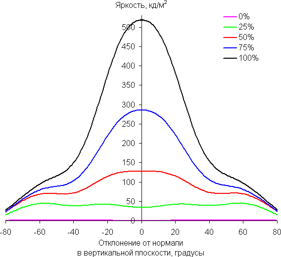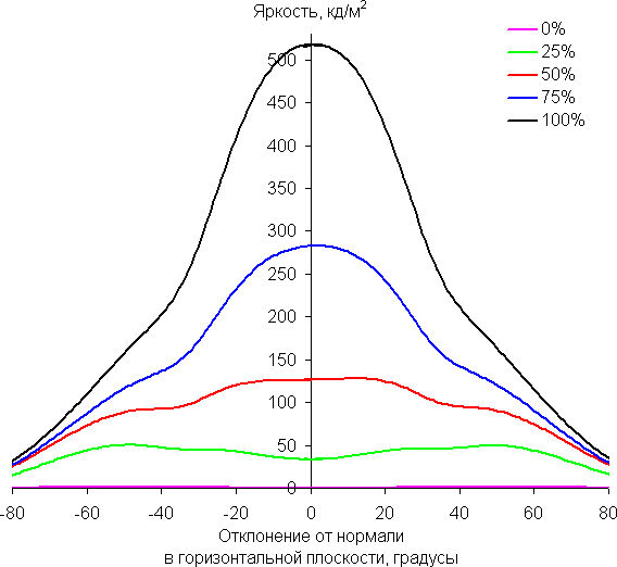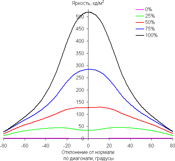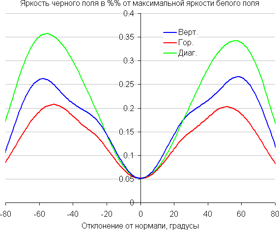 По скорости падения яркости углы обзора не очень широкие. Отметим примерно одинаковый характер уменьшения яркости при отклонении от перпендикуляра к экрану во всех трех направлениях, при этом графики не пересекаются во всем диапазоне измеряемых углов. При отклонении в диагональном направлении яркость черного поля достигает большего значения, чем в двух других случаях. Однако максимум яркости черного поля все равно меньше, чем в случае типичного монитора на матрице IPS. Контрастность в диапазоне углов ±82° приближается к отметке 10:1 только при отклонении по диагонали, но все равно остается существенно выше этого значения.