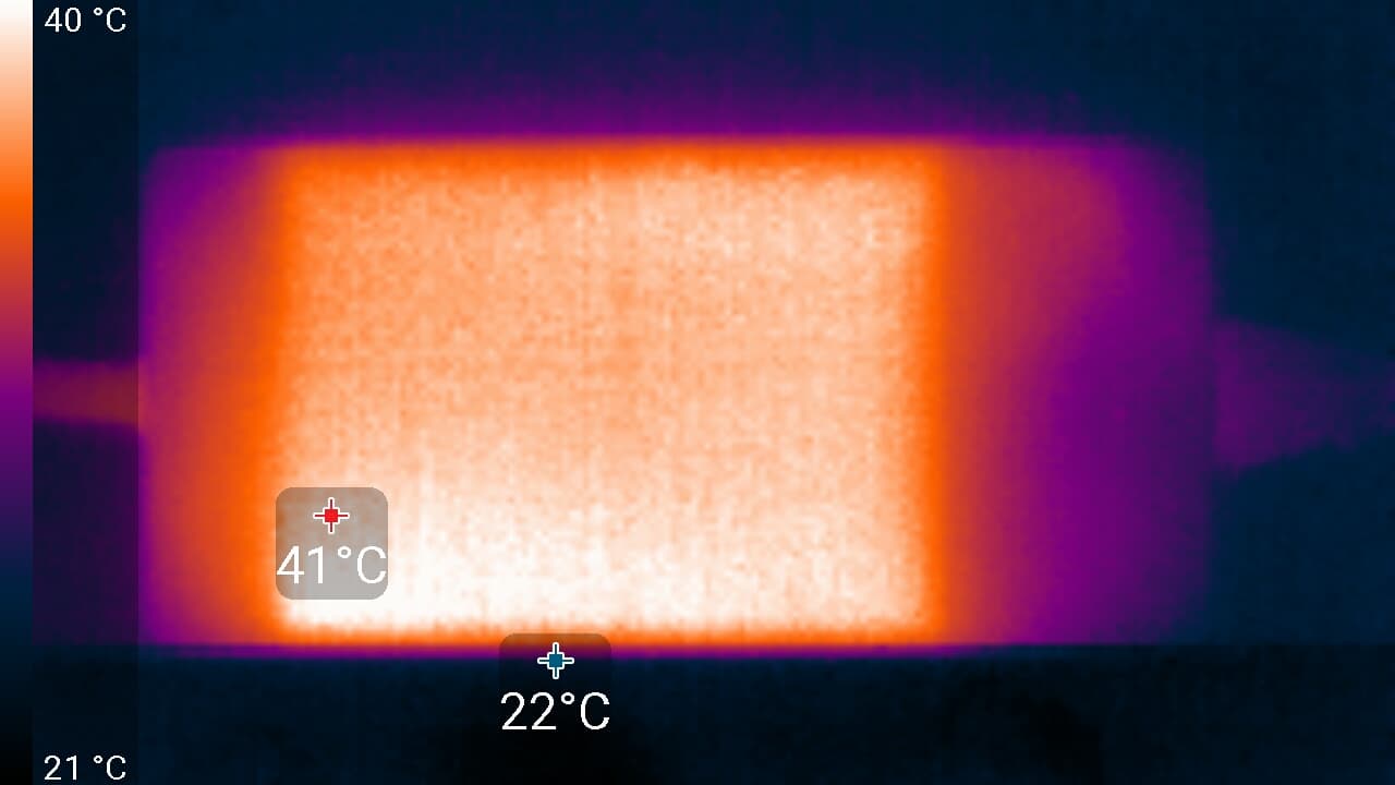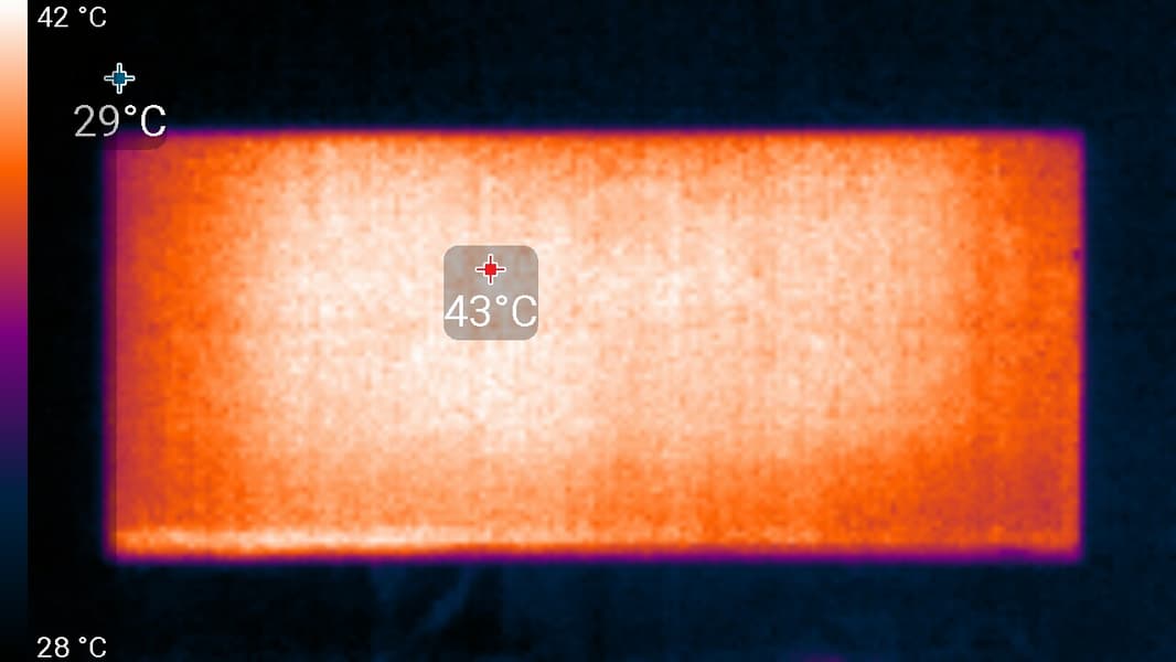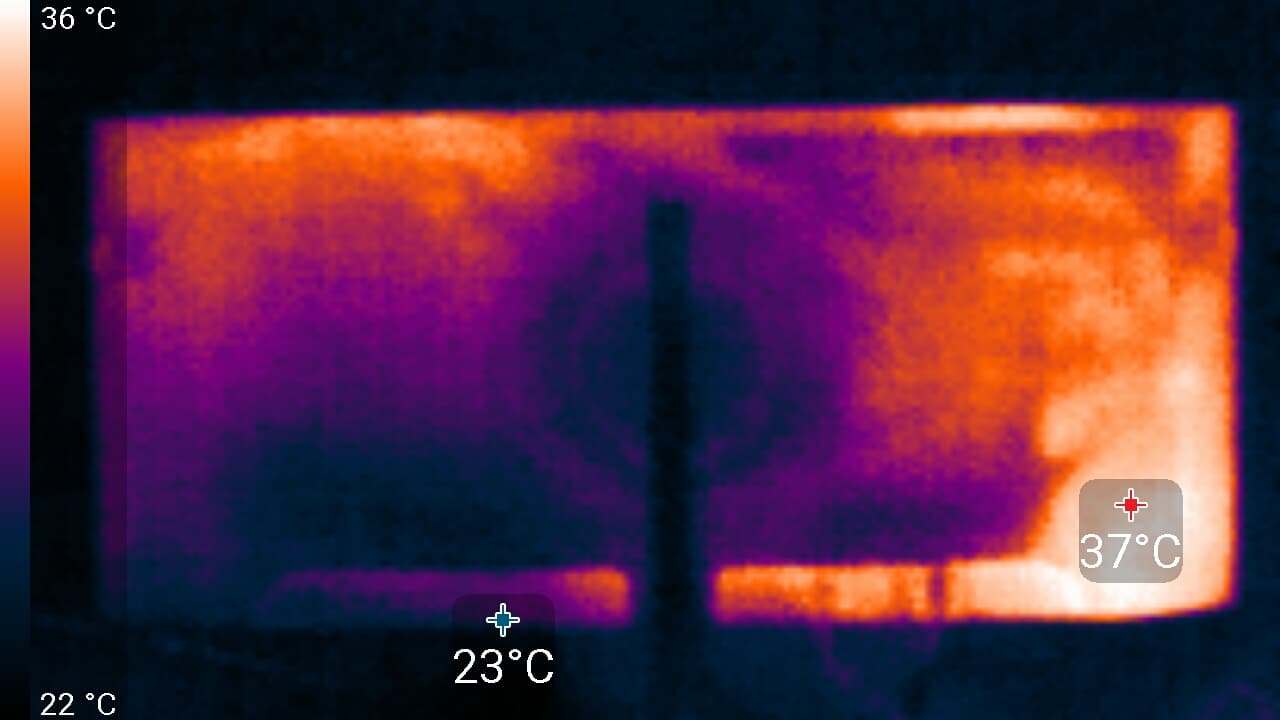 Нагрев монитора можно оценить по приведенным снимкам с ИК-камеры, полученным после долговременной работы монитора на максимальной яркости (1000 кд/м²) в режиме HDR в помещении с температурой примерно 24 °C: