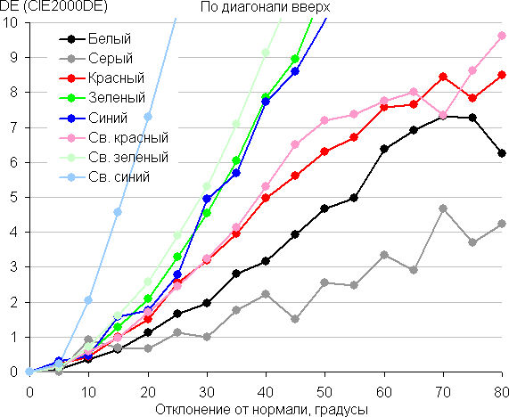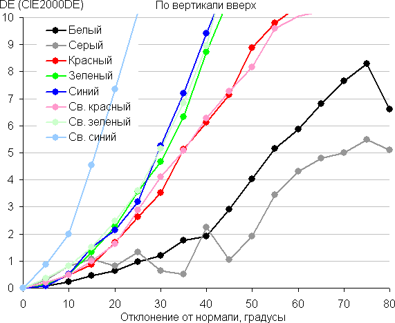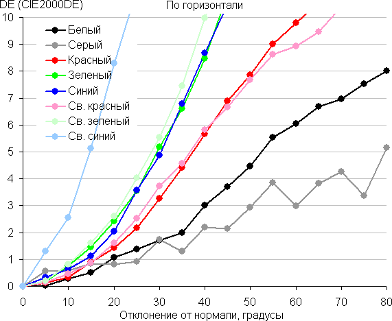 Для количественной характеристики изменения цветопередачи мы провели колориметрические измерения для белого, серого (127, 127, 127), красного, зеленого и синего, а также светло-красного, светло-зеленого и светло-синего полей во весь экран с использованием установки, подобной той, что применялась в предыдущем тесте. Измерения проводились в диапазоне углов от 0° (датчик направлен перпендикулярно к экрану) до 80° с шагом в 5°. Полученные значения интенсивностей были пересчитаны в ΔE относительно замера каждого поля при перпендикулярном положении датчика относительно экрана. Результаты представлены ниже: