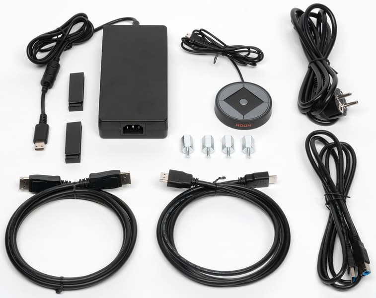 Помимо сетевого кабеля питания в комплект поставки входят кабели HDMI, DisplayPort и USB (USB 3.2 Gen 1).