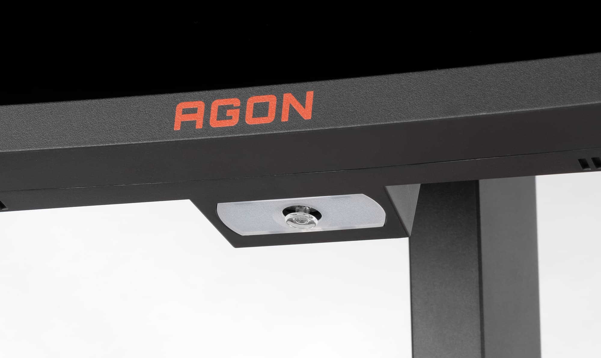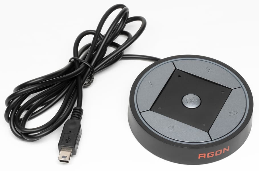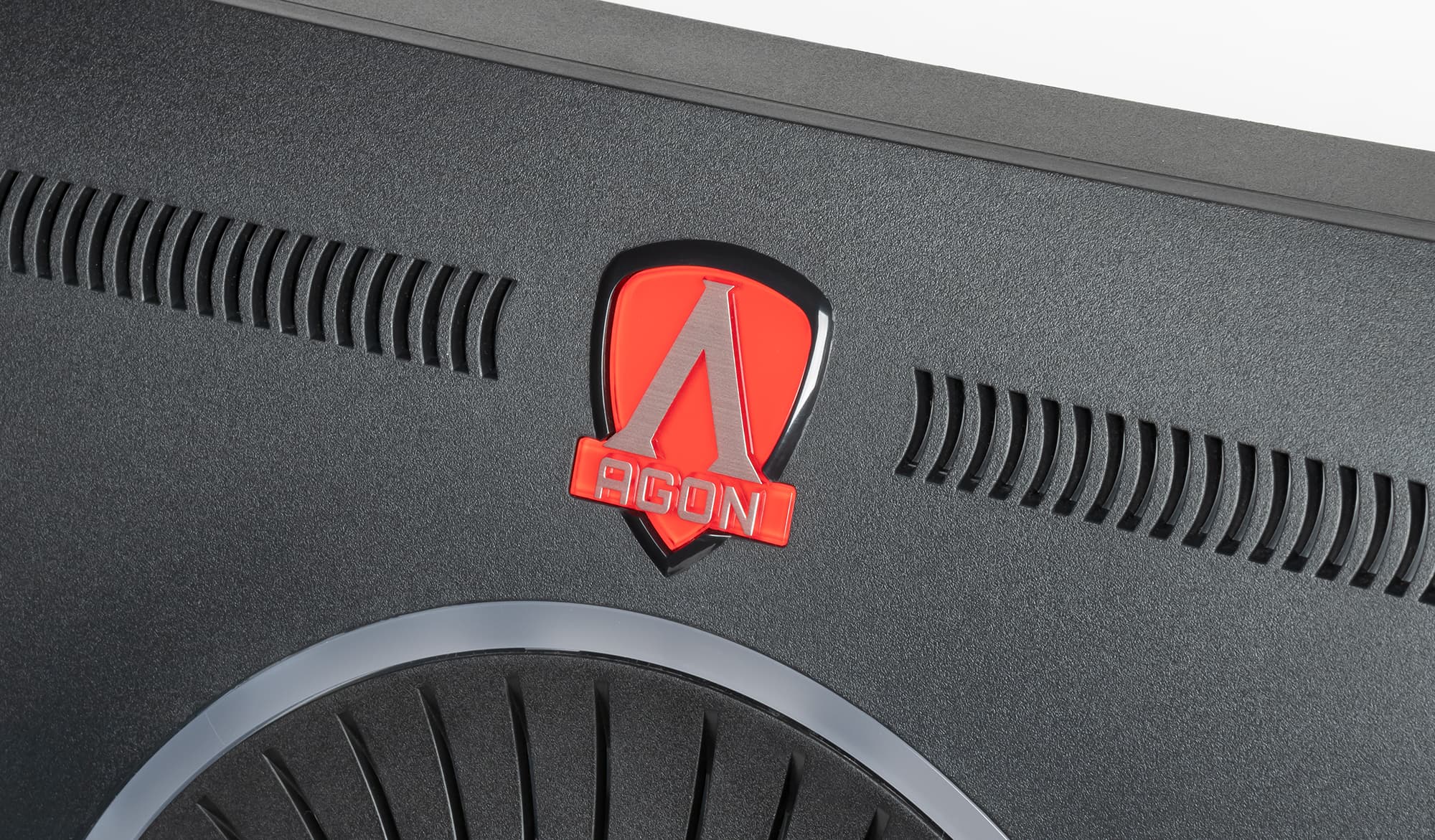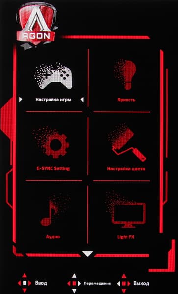По центру фронтальной планки красной краской нарисован логотип Agon — это марка компании AOC для игровых мониторов премиального класса, а уже на нижнем торце блока экрана есть 5-позиционный джойстик, выполненный из прозрачного пластика.
