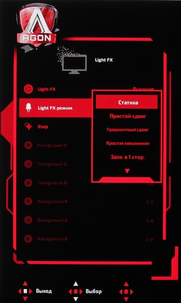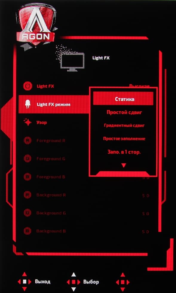 Эти светодиоды формируют многоцветную и многозонную подсветку с фирменным названием Light FX. Режимы функционирования подсветки настраиваются с помощью меню монитора на странице Light FX.