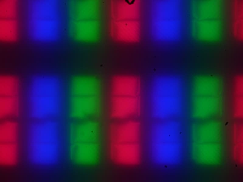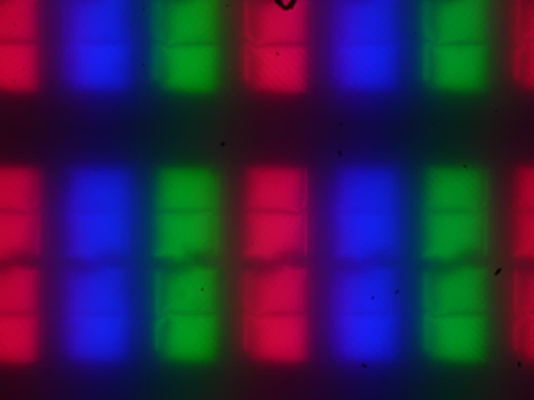Четкое изображение структуры пикселей из-за матовой поверхности получить не удается, впрочем, при желании на фрагменте ниже можно разглядеть типичную для VA структуру в виде параллельных полосок, а также что каждый субпиксель делится на два равных домена, каждый из которых еще на два поддомена, в которых полоски ориентированы под разными углами (черные точки — это пыль на матрице фотоаппарата):