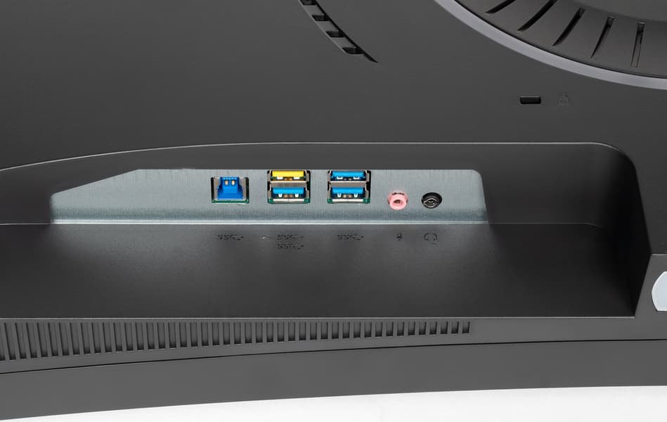 Все интерфейсные разъемы и разъем питания расположены в двух незамкнутых нишах на задней панели и ориентированы вниз. Кабели, идущие от разъемов монитора, можно зафиксировать с помощью двух клипс с клейкой поверхностью. Куда именно эти клипсы приклеить, решает сам пользователь, от производителя рекомендаций нет. На задней панели и на нижнем торце есть несколько вентиляционных решеток. Где-то внутри блока монитора находится как минимум один вентилятор, который помогает охлаждать электронику монитора.