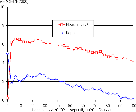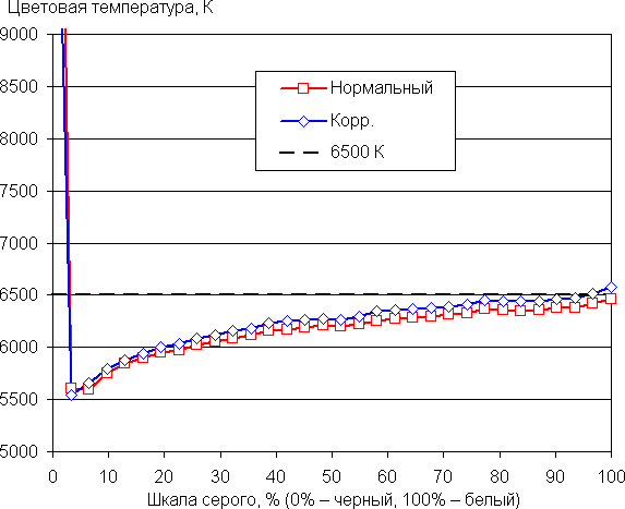Самый близкий к черному диапазон можно не учитывать, так как в нем цветопередача не так важна, а погрешность измерения цветовых характеристик высокая. Ручная коррекция уменьшила значение ΔE и на белом поле цветовая температуры стала ближе к стандартным 6500 К, но с практической точки зрения особой необходимости в такой коррекции нет. Цветовая температура существенно изменяется по мере снижения светлоты оттенка. Это не очень хорошо, но характер изменения хотя бы монотонный.