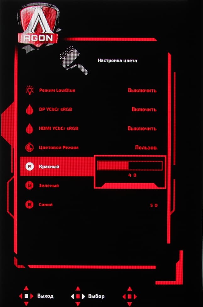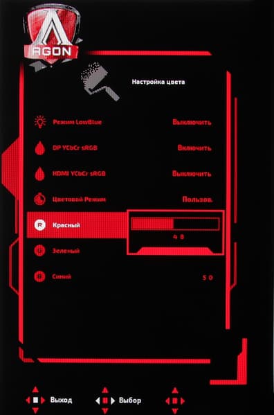 Настроек не очень много, есть регулировки яркости (подсветки) и контрастности, а также выбор цветового профиля из трех предустановленных или пользовательского, в котором цветовой баланс можно подправить регулировками интенсивности трех основных цветов.