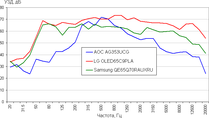 Качество встроенных громкоговорителей невысокое. Для сидящего перед монитором пользователя они достаточно громкие, низких частот нет совсем, есть выраженный «пластиковый» призвук из-за резонансов корпуса, стереофонический эффект слабый. Сравним АЧХ этого монитора с АЧХ двух телевизоров высшего класса (воспроизводился розовый шум, уровни звукового давления в 1/3 октавах записывал шумомер Октава-110А-Эко):