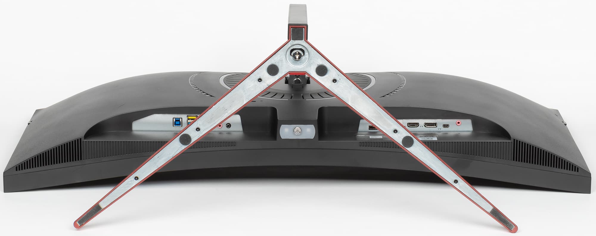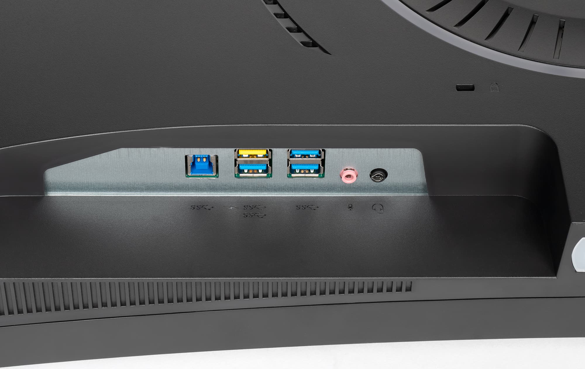 Видеовходов два — HDMI версии 2.0 и DisplayPort версии 1.4. Из них только DisplayPort поддерживает на вход сигнал с максимальными для этого монитора разрешением и частотой кадров, а также работу в режиме Nvidia G-Sync Ultimate. Входы выбираются в меню, кроме того, в случае отсутствия сигнала на текущем входе срабатывает автоматический выбор (его можно отключить) активного входа. Входы HDMI и DisplayPort способны принимать цифровые аудиосигналы (только PCM стерео), которые выводятся после преобразования в аналоговый вид на встроенные громкоговорители и через гнездо миниджек 3,5 мм. К этому гнезду можно подключить внешнюю активную акустическую систему или наушники.